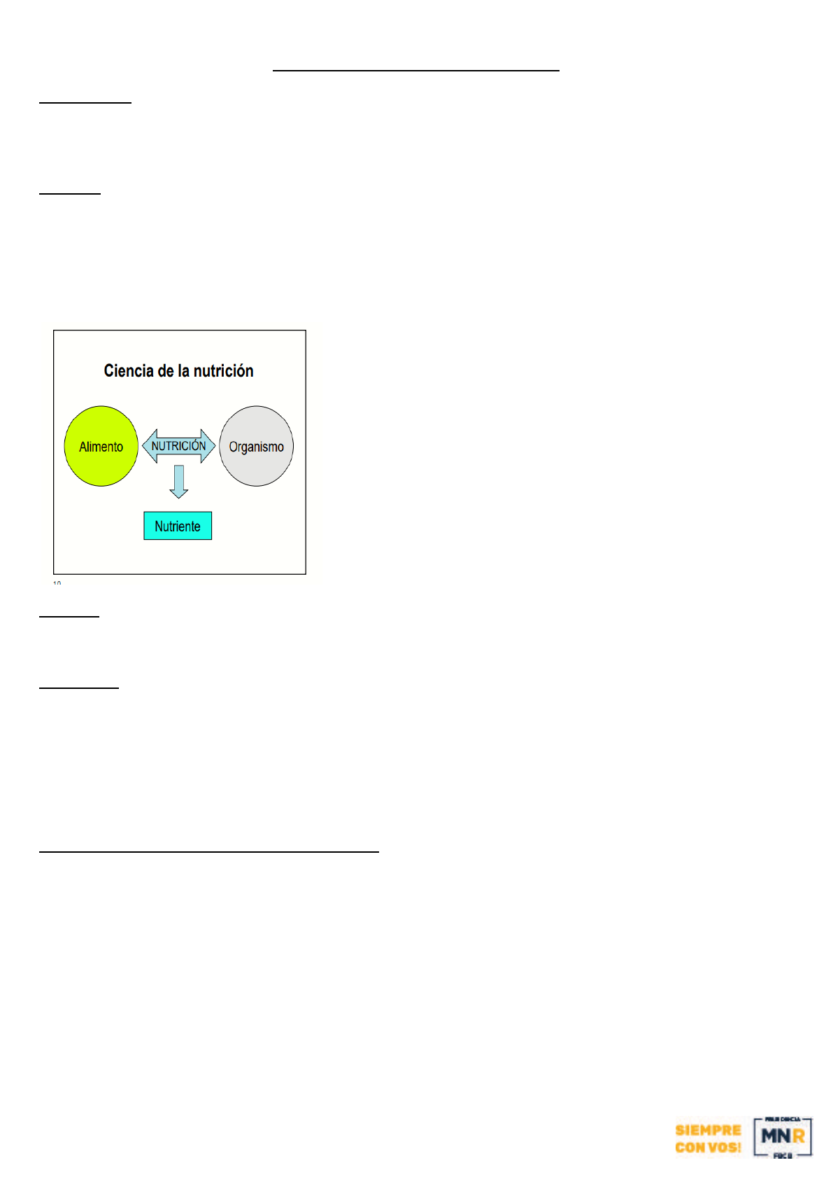 CIENCIA DE LA NUTRICIÓN: Alimentación: es el conjunto de procesos que permite a los organismos utilizar y transformar los nutrientes para mantenerse vivos. Comprende un conjunto de actos voluntarios y conscientes selección, preparación e ingestión de alimentos por los cuales el hombre obtiene la materia y energía para las funciones normales. Acto asociado con el medio sociocultural y económico y determinan, hábitos dietéticos y estilos de vida. Nutrición: es la ciencia que estudia la relación entre los alimentos y el organismo humano. Según la OMS es la suma de procesos por los cuales los organismos vivos toman y transforman las diversas sustancias que son necesarias para el mantenimiento y normal funcionamiento del organismo y la producción de trabajo. Relacionado al conjunto de fenómenos involuntarios que suceden tras la ingesta de los alimentos digestión, absorción e incorporación al medio interno y a los tejidos. Alimento: producto que por sus propiedades nutritivas y psico-sensoriales, cuando es consumido contribuye en cualquier grado al mantenimiento del equilibrio funcional del organismo, es decir al mantenimiento de su estado de salud. Nutrientes: compuestos químicos aportados por los alimentos que contribuyen a satisfacer las necesidades de materia y energía del organismo o que resultan indispensables para el desarrollo de los procesos metabólicos. Esenciales (no son sintetizados por el organismo por lo tanto son los que deben ser suministrados por los alimentos y no pueden ser reemplazados ya que se usan para funciones que no pueden ser sustituidas. Estos deben ser preservados para luego utilizarlos cuando realmente son necesarios. No esenciales (el organismo es capaz de sintetizarlos a partir de otros alimentos). Utilización de la energía química de los nutrientes: la energía química almacenada en los nutrientes orgánicos es liberada en el organismo por procesos oxidativos. En los sistemas biológicos existe una importante limitación y es que estos sistemas son isotérmicos, es decir operan en una estrecha franja de temperatura. Por ello la energía deberá liberarse y utilizarse en forma gradual y progresiva, a fin de conservar la temperatura en los márgenes adecuados. 1. Oxidaciones biológicas: los compuestos químicos que tienen enlaces de alto contenido energético, son capaces de almacenar isotérmicamente la energía. Estos capturan la energía liberada en todas las oxidaciones celulares y la almacenan como energía libre. El principal transportador de energía libre en todos los seres vivos es el ATP. La energía se libera por medio del clivaje de los enlaces de alto contenido energético. 2. Mecanismos de transferencia de energía: fosforilación oxidativa a nivel de la cadena respiratoria, y fosforilación a nivel de sustrato. Alimentos/depósitos: producción de energía (Catabolismo de HC, lípidos y proteínas) ATP utilización de energía (biosíntesis de macromoléculas, contracción muscular, transporte activo de iones, termogénesis). Mantenimiento, reproducción, funciones celulares, funciones titulares. 3. Eficiencia en la utilización de la energía: existen variaciones inter e intra individuales que se manifiestan bajo diferentes condiciones alimenticias y metabólicas. Cuando se habla de un alto grado de eficiencia significa que todo lo que se ingiere se transforma en energía aprovechable, lo cual se da durante el crecimiento. Una baja eficiencia es deseable para prevenir la obesidad, ya que a mayor energía despreciada, menor será la probabilidad de que un exceso de ingesta se acumule como tejido adiposo. Los factores que influyen sobre el aprovechamiento de la energía ingerida: - Factores nutricionales de la alimentación: 1) Acción dinámico específica: es el aumento de calor liberado que se produce en un organismo como consecuencia del ingreso de alimentos. Su valor es mínimo cuando las dietas son equilibradas y este valor aumenta considerablemente a medida que la proporción de nutrientes se desequilibra. La conversión de los metabolitos que se hallan en exceso en productos de almacenamiento necesita un gasto extra de ATP con la consiguiente liberación de calor. En una dieta normal el 10% de las calorías ingeridas se disipan como calor debido a la ADE (30% de proteínas, 13% de lípidos, 5% de hidratos de carbono). 2) Estado nutricional y tipo de alimentación: los niños desnutridos cuando se encuentran en eetapa de recuperación crecen a un ritmo muy superior al de los niños normales. Por eso, el requerimiento diario de los desnutridos es mayor que el de los normales, ya que el desnutrido debe cubrir el costo energético de los nuevos tejidos. La persona obesa sobrealimentada no aumenta de peso en la medida que se podría prever si se calcula la energía contenida en su ingesta; este es un mecanismo de defensa, que desprecia energía para no llegar a niveles de peso por demás elevados. - Factores metabólicos: 3) Ciclos metabólicos alternativos: la utilización de caminos alternativos en los metabolismos puede alterar la eficiencia energética. 4) Regulación por el tejido adiposo: cuando el tejido adiposo excede un determinado nivel, la respuesta térmica se halla aumentada y por lo tanto la eficiencia energética disminuida. 5) Desacoplantes: la ineficiencia en la producción de energía utilizable se produce por la acción de la tiroxina y otros compuestos de acción toxica para el organismo. Estas sustancias producen un desacople entre el proceso oxidativo y el de fosforilacion, con lo cual el rendimiento de energía utilizable disminuye considerablemente, aumentando paralelamente, la producción de calor. 6) Control metabólico: la eficiencia energética se encuentra en parte bajo control metabólico, el cual a su vez depende de factores genéticos como: ● Los individuos con características bajas (baja estatura, extremidades cortas, dedos redondeados, etc), son altamente eficientes y por tal motivo cu