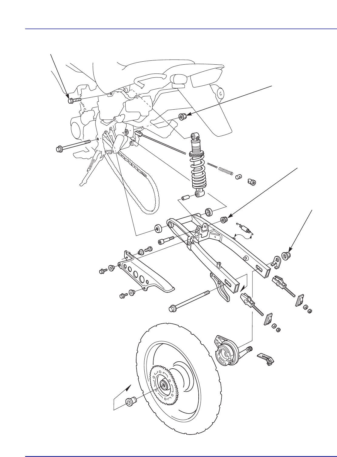 13-0 RUEDA TRASERA/FRENO/SUSPENSIÓN NXR125 BROS KS•ES 44 N.m (4,4 kg.m) 88 N.m (8,8 kg.m) 44 N.m (4,4 kg.m) 93 N.m (9,3 kg.m) RUEDA TRASERA/ FRENO/SUSPENSIÓN INFORMACIONES DE SERVICIO 13-1 INVESTIGACIÓN DE AVERÍAS 13-3 RUEDA TRASERA 13-4 FRENO TRASERO 13-9 PEDAL DEL FRENO TRASERO 13-13 AMORTIGUADOR 13-15 BRAZO OSCILANTE 13-18 13-1 NXR125 BROS KS•ES 13. INFORMACIONES DE SERVICIO INFORMACIONES GENERALES • Un tambor de freno o forros contaminados reducen la potencia del frenado. Deseche forros contaminados y limpie los tambores contaminados con un agente desengrasante de freno de buena calidad. • Conducir la motocicleta con llantas o rayos dañados puede perjudicar la seguridad. • El equilibrio de la rueda afecta directamente la estabilidad, el manejo y, sobretodo, la seguridad de la motocicleta. Verifique cuidadosamente el equilibrio antes de reinstalar la rueda. • Utilice siempre protectores de llantas para evitar que la llanta se dañe cuando se usen palancas para quitar los neumáticos ESPECIFICACIONES Unidad: mm Ítem Estándar Límite de servicio Profundidad mínima de los surcos de la banda de rodaje — 3,0 Presión del neumático frío Solamente piloto 150 kPa (1,5 kgf/cm2, 22psi) — Piloto y pasajero 200 kPa (2,0 kgf/cm2, 29psi) — Excentricidad del eje — 0,2 Excentricidad de la Radial — 2,0 llanta de la rueda Axial — 2,0 Cadena de transmisión Tamaño/eslabones 428/132 — Holgura 20 – 30 — Freno Holgura libre del pedal 15 – 25 — Diámetro interior 110 111del tambor de freno Espesor del forro — Hasta el indicador VALORES DE PAR DE APRIETE Tuerca del eje trasero 93 N.m (9,3 kg.m) Tuerca de la rueda dentada movida final 32 N.m (3,2 kg.m) Tuerca del brazo del freno trasero 10 N.m (1,0 kg.m) Tornillo de fijación superior del amortiguador 44 N.m (4,4 kg.m) Tornillo de fijación inferior del amortiguador 44 N.m (4,4 kg.m) Tornillo/tuerca de la articulación del brazo oscilante 88 N.m (8,8 kg.m) Tornillo de la guía de la cadena de transmisión 6 N.m (0,6 kg.m) Rayos 3,7 N.m (0,3 kg.m) 13 RUEDA TRASERA/FRENO/SUSPENSIÓN 13-2 NXR125 BROS KS•ES HERRAMIENTAS Contrapeso del extractor de rodamientos 07741-0010201 Impulsor 07749-0010000 Accesorio, 37 x 40 mm 07746-0010200 Accesorio, 42 x 47 mm 07746-0010300 Accesorio, 24 x 26 mm 07746-0010700 Accesorio, 22 x 24 mm 07746-0010800 Guía, 17 mm 07746-0040400 Guía, 20 mm 07746-0040500 Eje del extractor de rodamientos 07746-0050100 Cabezal del extractor de rodamientos, 17 mm 07746-0050500 Eje del extractor de rodamientos 07936-3710100 Conjunto del extractor de rodamientos, 20 mm 07936-3710600 RUEDA TRASERA/FRENO/SUSPENSIÓN 13-3 NXR125 BROS KS•ES Eje del impulsor 07949-3710001 Llave para rayos, 5,8 x 6,1 mm 07701-0020300 INVESTIGACIÓN DE AVERÍAS La rueda trasera bambolea • Llanta torcida • Rodamiento(s) de la rueda suelto(s) • Rayos sueltos o torcidos • Neumático con defecto • Tuerca del eje apretada incorrectamente • Rodamiento de la articulación del brazo oscilante desgastado • Ajuste de la cadena de transmisión diferente en ambos lados Suspensión demasiado blanda • Resortes de la suspensión con poco efecto • Carga previa del resorte del amortiguador incorrecta Suspensión demasiado dura • Carga previa del resorte del amortiguador incorrecta • Vástago del amortiguador torcido • Rodamientos de la articulación del brazo oscilante dañados • Bastidor o brazo oscilante torcido Suspensión ruidosa • Amortiguador con defecto • Elementos de fijación sueltos • Rodamiento(s) de la articulación de la suspensión desgastado(s) RUEDA TRASERA/FRENO/SUSPENSIÓN 13-4 RUEDA TRASERA REMOCIÓN Apoye la motocicleta con un gato o un caballete y levante la rueda trasera del suelo. Quite la tuerca de ajuste del freno trasero y suelte la varilla del freno trasero desde el brazo del freno. Afloje las contratuercas y las tuercas de ajuste derecha e izquierda de la cadena de transmisión. Quite la tuerca y la placa del eje trasero. INSPECCIÓN EJE Coloque el eje sobre un par de bloques en "V" y mida el alabeo. El alabeo real es la mitad de la lectura total del indicador de cuadrante. Límite de servicio 0,2 mm EXCENTRICIDAD DE LA LLANTA DE LA RUEDA Verifique la excentricidad de la llanta colocando la rueda en un soporte giratorio. Gire la rueda lentamente y mida la excentricidad con un comparador de cuadrante. La excentricidad real es la mitad de la lectura total del indicador de cuadrante. Verifique si los rayos están sueltos y apriételos en caso de que sea necesario. Límite de servicio Radial 2,0 mm Axial 2,0 mm Empuje la rueda trasera hacia adelante. Suelte la cadena de la rueda dentada movida final. Quite el eje trasero por el lado izquierdo y, enseguida, quite la rueda trasera. Quite el espejo del freno trasero (página 13-9). Quite la tapa del brazo del freno. NXR125 BROS KS•ES TUERCA DE AJUSTE DEL FRENO VARILLA DEL FRENO BRAZO DEL FRENO TUERCA/ PLACA DEL EJE TUERCA DE AJUSTE DE LA CADENA DE TRANSMISIÓN TAPA DEL BRAZO DEL FRENO BRAZO DEL FRENO RUEDA TRASERA/FRENO/SUSPENSIÓN 13-5 NXR125 BROS KS•ES RODAMIENTO DE LA RUEDA Gire la pista interior de cada rodamiento con el dedo. Los rodamientos deben girar de forma suave y silenciosa. Verifique también si la pista exterior del rodamiento se ajusta firmemente en la maza de la rueda. Quite y deseche los rodamientos en caso de que sus pistas no giren de forma suave y silenciosa o si quedan sueltas en la maza de la rueda. NOTA Reemplace los rodamientos de la rueda en pares. DESARMADO Quite el collarín y el guardapolvo. Quite los tornillos, las tuercas, las arandelas y la rueda movida final. REMOCIÓN DEL RODAMIENTO DE LA RUEDA Instale el cabezal del extractor en el rodamiento. Instale el eje del extractor del rodamiento por el lado opuesto y quite el rodamiento de la maza de la rueda. Herramienta: Cabezal del extractor de rodamientos, 17 mm 07746-0050500 Eje del extractor de rodamientos 07746-0050100 RUEDA DENTADA MOVIDA FINAL Verifi