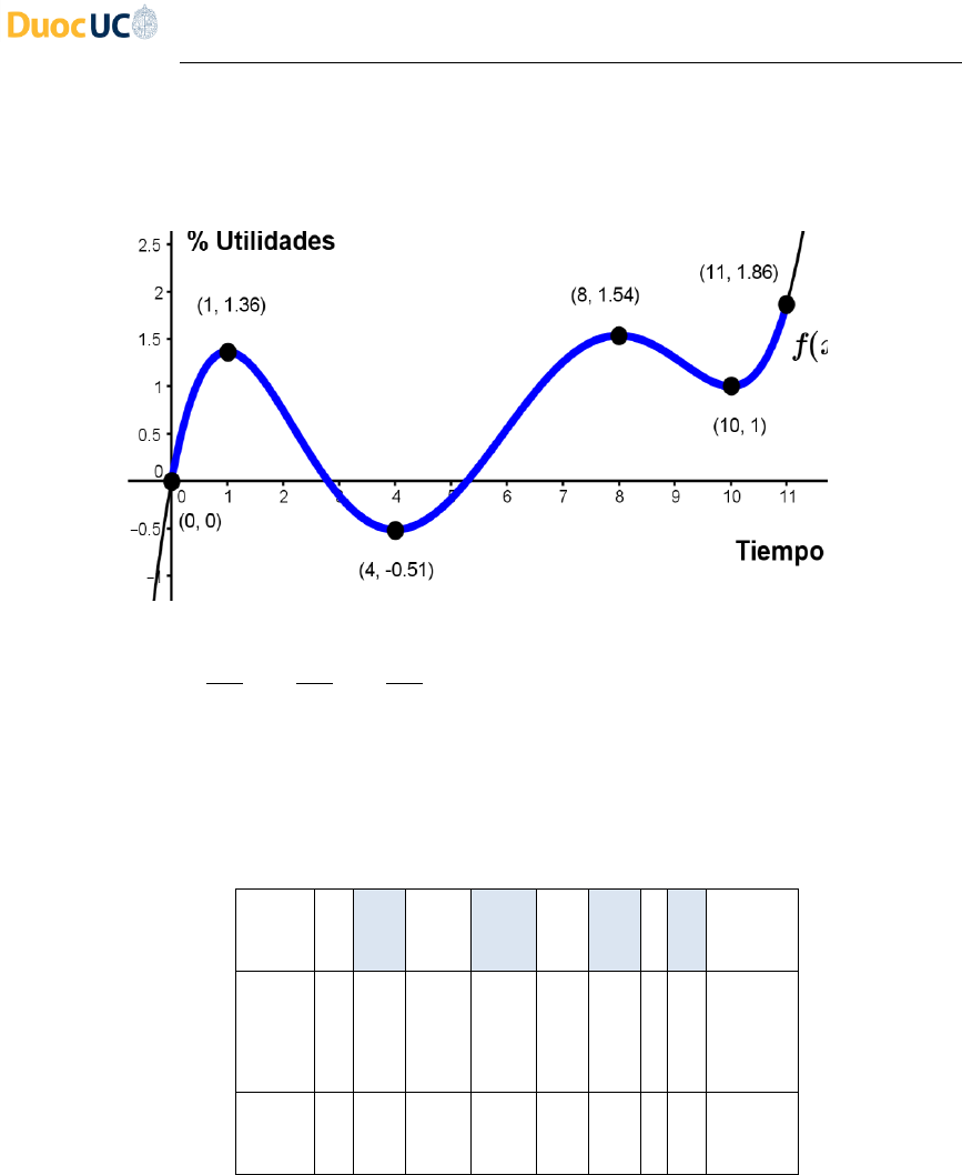 Programa de Matemática 1 SOLUCIONES GUÍA N°5 N°1 a) 186,1)11(1)10( 536,1)8(512,0)4(36,1)1( UU UUU b) 𝑓´(𝑥) = 1 100 𝑥4 − 23 100 𝑥3 + 29 150 𝑥3 − 1,18x + 3,2 0)10()8()4()1( UUUU c) Intervalos de crecimiento ]4,8[, ]10,12[ , la derivada siempre positiva Intervalos de decrecimiento ]1,4[, ]8,10[ , la derivada siempre negativa Valo r 𝑥 Valo r f´(x) Sign o + - + - + d) Transcurridos 11 años se registra el mayor % de utilidad correspondiente a 1,86% y en trascurridos 4 años el menor registrando un pérdida de 0,51%. Programa de Matemática 2 N°2 a) Dominio Empírico [−3,4] b) Valores Críticos: -2, 0 , 3 c) c) Intervalos (de crecimiento) derivada positiva ]−2,0[, ]3,4[, Intervalos (de decrecimiento) derivada negativa ]−3, −2[, ]0,3[, d) El punto máximo )25.8,3( El punto mínimo )75.9,3( Interpretación: A inicios del año 2002 se observa el mayor % de interés correspondiente a un 8,25%. A inicios del año 2008 se observa el menor % de interés correspondiente a una pérdida de un 9,75% Programa de Matemática 3 N°3 a) Valores Críticos: -1,5 0 1,5 b) c) punto máximo )88,646,5.2( puntos mínimos )13.153,5.1( y )13.153,5.1( N°4 a) Terminando la 2da hora de entrenamiento se observa el máximo rendimiento con una rapidez de 32 km/h. b) Entre el término de la segunda hora y el término de la sexta hora, el rendimiento del deportista disminuye. Programa de Matemática 4 N°5 a) No es la mejor ubicación ya que a los 18 km las emisiones contaminantes son 768 ppm y si la colocara a 15 km la cantidad de partículas serian de 525 ppm. c) Crecimiento]6,8 [ , ]15,21[ ∶ La contaminación aumenta a una distancia de la fábrica entre los 6 y 8 km y entre los 15 y 21 km. Decrecimiento ]8,15[ ∶ Entre los 8 y 15 kilómetros de distancia la contaminación tiende a disminuir N°6 a) Se minimiza el costo cuando el pedido es de 387 artículos y su valor será de $1.548.000 b) ]50,387[: Cuando la cantidad está entre los 50 y 387 el costo disminuye, la función es decreciente. ]387, ∞[: Cuando la cantidad de artículos esta sobre los 387 la función crece, aumenta el costo. Programa de Matemática 5 N°7 a) ,3Vdom b) ]−3,0[, ]1,7[: La disminución de la virulencia se observa en dos periodos, Después de iniciado el año 1997 hasta antes de comenzar el 2000. Y luego después del inicio del 2001 hasta antes de comenzar el 2007. ]0, 1[, ]7, ∞[: El crecimiento de la virulencia se observa después de iniciado el año 2000 hasta antes de comenzar el 2001, y después de iniciado el 2007. c) La mínima virulencia se registró a inicios del año 2007 siendo de un 0,71% N°8 a) Entre los 8 y 24 años desde su creación la cantidad de socios disminuyen en el club deportivo. b) Se estima que a partir del año 2009 la cantidad de socios comienzan a aumentar en forma indefinida. Programa de Matemática 6 c) 𝑃(5) = 190,42 Transcurrido 5 años hay 190.420 socios inscritos 𝑃′(5) = 14,25 La tasa de crecimiento de la cantidad de socios transcurrido 5 años es de 14,25 miles de personas por año N°9 a) Si la inversión fluctúa entre los 1667 y 5000 euros la rentabilidad disminuye. b) Sobre los 5000 euros de inversión, la rentabilidad crecerá. c) La mínima rentabilidad ocurre cuando la inversión es de 5000 euros y corresponde a un 2%. Programa de Matemática 7 d) 𝑅(4) = 2,04 Al invertir 4 mil euros la rentabilidad es de 2,04% 𝑅′(4) = −0,07 - Cuando la inversión es de 4 mil euros La rentabilidad disminuye en 0,07% por cada mil Euros invertidos - La tasa de decrecimiento de la rentabilidad cuando se invierten 4 mil euros corresponde a 0,07 por cada mil Euros N°10 a) Para obtener el mayor rendimiento se debe estudiar 4,2 horas diarias aproximadamente b) Si el alumno no estudia, su rendimiento será de un 20% c)