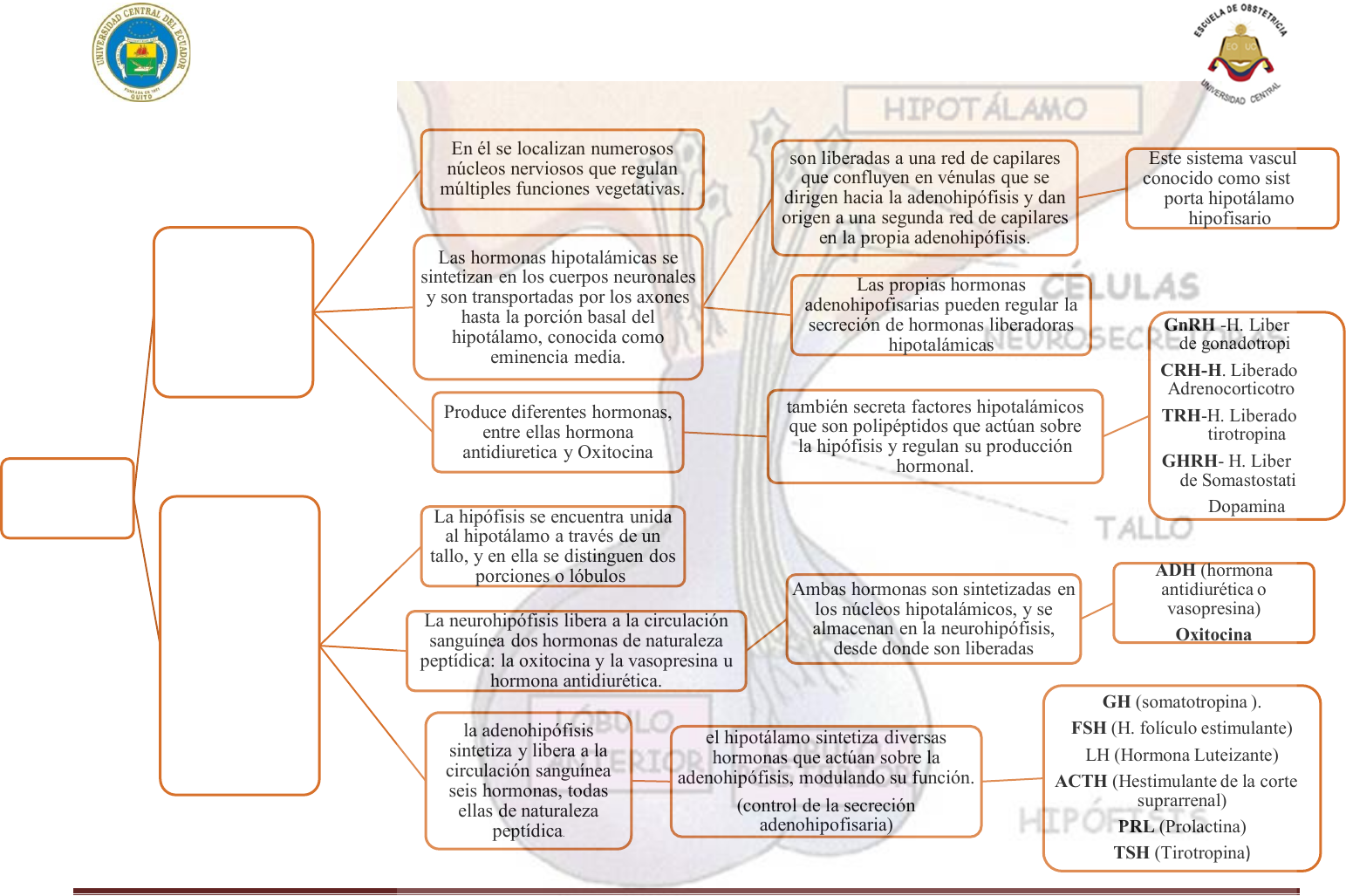 UNIVERSIDAD CENTRAL DEL ECUADOR FACULTAD DE CIENCIAS MÉDICAS CARRERA DE OBSTETRICIA Darla Karely Luje Tamayo Eje Hipotálamo- Hipofisario El hipotálamo es una estructura nerviosa situada en la base del cerebro, por debajo del tálamo y tercer ventrículo. En él se localizan numerosos núcleos nerviosos que regulan múltiples funciones vegetativas. Las hormonas hipotalámicas se sintetizan en los cuerpos neuronales y son transportadas por los axones hasta la porción basal del hipotálamo, conocida como eminencia media. son liberadas a una red de capilares que confluyen en vénulas que se dirigen hacia la adenohipófisis y dan origen a una segunda red de capilares en la propia adenohipófisis. Este sistema vascular, conocido como sistema porta hipotálamo- hipofisario Las propias hormonas adenohipofisarias pueden regular la secreción de hormonas liberadoras hipotalámicas Produce diferentes hormonas, entre ellas hormona antidiuretica y Oxitocina también secreta factores hipotalámicos que son polipéptidos que actúan sobre la hipófisis y regulan su producción hormonal. GnRH -H. Liberadora de gonadotropinas CRH-H. Liberadora de Adrenocorticotropina TRH-H. Liberadora de tirotropina GHRH- H. Liberadora de Somastostatina Dopamina Justo debajo del hipotálamo se localiza la hipófisis, una pequeña glándula asentada en una depresión del hueso esfenoides del cráneo conocida como silla turca. La hipófisis se encuentra unida al hipotálamo a través de un tallo, y en ella se distinguen dos porciones o lóbulos La neurohipófisis libera a la circulación sanguínea dos hormonas de naturaleza peptídica: la oxitocina y la vasopresina u hormona antidiurética. Ambas hormonas son sintetizadas en los núcleos hipotalámicos, y se almacenan en la neurohipófisis, desde donde son liberadas ADH (hormona antidiurética o vasopresina) Oxitocina la adenohipófisis sintetiza y libera a la circulación sanguínea seis hormonas, todas ellas de naturaleza peptídica. el hipotálamo sintetiza diversas hormonas que actúan sobre la adenohipófisis, modulando su función. (control de la secreción adenohipofisaria) GH (somatotropina ). FSH (H. folículo estimulante) LH (Hormona Luteizante) ACTH (Hestimulante de la corteza suprarrenal) PRL (Prolactina) TSH (Tirotropina)