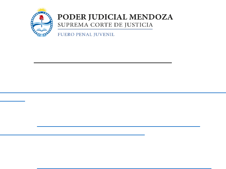 Anexos al material de estudio del Fuero Penal Juvenil 1. Ley 22278 - Régimen Penal de la Minoridad Disponible en https://ppn.gov.ar/pdf/legislacion/Ley%2022278.%20Regimen%20Penal%20de%20Me nores.pdf 2. Ley 6354 Títulos III, IV y V (arts. 109 a 168): Disponible en https://www.argentina.gob.ar/normativa/provincial/ley-6354- 123456789-0abc-defg-453-6000mvorpyel/actualizacion 3. “Justicia Juvenil y Derechos Humanos en las Américas”, Comisión Interamericana de Derechos Humanos; 2011. Disponible en https://www.oas.org/es/cidh/infancia/docs/pdf/JusticiaJuvenil.pdf https://ppn.gov.ar/pdf/legislacion/Ley%2022278.%20Regimen%20Penal%20de%20Menores.pdf https://ppn.gov.ar/pdf/legislacion/Ley%2022278.%20Regimen%20Penal%20de%20Menores.pdf https://www.argentina.gob.ar/normativa/provincial/ley-6354-123456789-0abc-defg-453-6000mvorpyel/actualizacion https://www.argentina.gob.ar/normativa/provincial/ley-6354-123456789-0abc-defg-453-6000mvorpyel/actualizacion https://www.oas.org/es/cidh/infancia/docs/pdf/JusticiaJuvenil.pdf