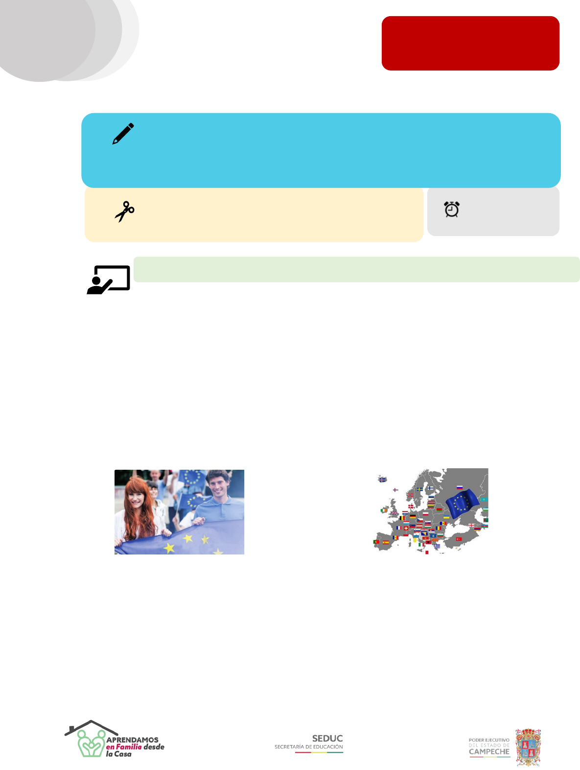 HISTORIA 1 1o SE CU N D A R IA Materiales: libro de texto del alumno, libreta, colores. 4. Unión Europea. Ayudar a su hijo(a): A comprender la trascendencia de los objetivos del Tratado de Maastricht en la reorientación de la Unión Europea hacia la cooperación en el ámbito económico y su extensión al ámbito político y social para fortalecer su integración. La Unión Europea es una asociación económica y política que reorientó su rumbo con base en los objetivos planteados en el Tratado de Maastricht a partir de noviembre de 1993. Sus objetivos es ejecutar una política exterior y de seguridad, defender valores comunes, la independencia, seguridad e integridad de la Unión fomentar la integración internacional, consolidar la democracia, el Estado de derecho, respeto a los derechos humanos y las libertades fundamentales, además, agrega objetivos relacionados con la cooperación en ámbito de justicia para garantizar a los ciudadanos protección contra el terrorismo, tráfico de drogas entre otros. Observa la imagen de la página 198 y responde las preguntas en tu cuaderno: a) ¿Qué representa esta bandera? b) ¿Qué hechos y procesos históricos han ocurrido en Europa? c) ¿Qué te sugiere el título “Unión Europea”? d) ¿qué representa el símbolo del círculo de estrellas? Realice una lectura comentada acerca de “Los inicios de la unión” (p. 199) con el fin de identificar las causas que movieron a los países europeos a iniciar su asociación. Finalice esta actividad elaborando una breve conclusión con base en lo comentado. 2 semanas Que vamos a aprender: conocer el proceso histórico que condujo a la unión de los países de Europa. Asimismo, reflexionarás acerca de la situación de la Unión Europea en la actualidad Te explico HISTORIA 1 1o SE CU N D A R IA https://www.youtube.com/watch?v=tC04vXXiQ9k Tratados de la Unión Europea https://www.youtube.com/watch?v=yytZNIC-cnw ¿Quiénes son los ciudadanos de la Unión Europea? Observen junto con sus hijos con detenimiento el mapa 3.14 “Estados miembros de la Unión Europea” (p. 200), revise con ellos su simbología e identifiquen las fechas de incorporación de cada nación y localicen que países integran la Unión Europea y escribe la lista en tu cuaderno. En equipo, observen el mapa 3.14 y elaboren en su cuaderno una línea del tiempo (p201), que muestre cuándo se incorporaron los países a la Unión Europea. a) ¿En qué años hubo un mayor número de adhesiones? b) Identifiquen qué países europeos no se han incorporado a la Unión Europea. c) ¿Qué países integrantes del antiguo bloque socialista ahora forman parte de la Unión Europea? Lean los siguientes enunciados e identifiquen a qué objetivo del Tratado de Maastricht hacen referencia. Es posible que se repita algún artículo. Anoten en su cuaderno las respuestas. a) Los países se han adherido a la UE con el propósito de trabajar en conjunto diversos ámbitos; por ejemplo, para construir carreteras y líneas de ferrocarril de mejor calidad por toda Europa, y así promover el progreso económico. b) Los habitantes de las naciones integradas pueden elegir dónde vivir y dónde trabajar, sin importar su lugar de nacimiento, siempre que éste forme parte de la UE. c) La UE ofrece recursos para proyectos específicos que buscan ayudar a las personas en situación de pobreza con el objetivo de fomentar el progreso social. d) El Tribunal de Justicia vela para que en todos los países de la ue se apliquen las leyes aprobadas. e) Los ciudadanos de la UE pueden comprar en cualquier nación integrante pagando con euros. Consulten en la sección Voces del pasado el texto “Unidos resistiremos, Divididos caeremos", carta del presidente Donald Tusk a los veintisiete jefes de Estado o de Gobierno de la Unión Europea sobre el futuro de la UE antes de la cumbre de Malta. a) Anoten en su cuaderno cuáles son las tres amenazas a las que se enfrenta la Unión Europea en la actualidad. b) A partir de ellas, escriban un texto breve en su cuaderno donde expliquen cómo podría afectar al futuro de la Unión Europea. Para aprender más Manos a la obra HISTORIA 1 1o SE CU N D A R IA Como actividad final, redacta una monografía sobre la Unión Europea. Trabajen en parejas y atiendan las indicaciones del maestro acerca de cómo elaborar la monografía. Considera las siguientes recomendaciones. Recupera los productos de las sesiones de trabajo: lista de países, línea del tiempo, objetivos del Tratado de Maastricht aplicados, ámbitos en los que la UE gasta más recursos, así como el texto sobre el futuro de este organismo. Revísenlos nuevamente para identificar los subtemas de la monografía. Consulta cómo hacer una monografía en tu libro de español. Ahí encontrarás detalles de cómo escribir una monografía. Revisa tu borrador y haz las correcciones necesarias para tener una versión final. Marque con una X si observó que su hijo realizó las siguientes actividades: o Realizó las actividades como lo marca la ficha. o Comprendió la finalidad de la UE y sus objetivos. o Identificó los países lo integran. o Realizó la monografía propuesta. Repaso y practico Lo que aprendí