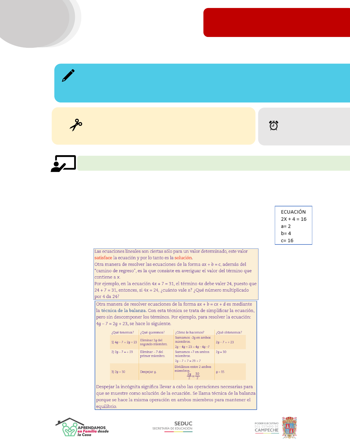 Matemáticas. 1º SE CU N D A R IA 4. Ecuaciones 3 Un aprendizaje importante en esta secuencia es que el alumno aplique y domine los métodos de resolución de ecuaciones; para esto se recomienda iniciar la resolución algebraica de ecuaciones lineales mediante la manipulación de la literal aplicando sucesivamente operaciones inversas en ecuaciones sencillas de la forma ax + b = c y mediante la aplicación de las propiedades de la igualdad en ecuaciones más generales y complejas de la forma ax + b = cx + d, donde a, b, c y d son números enteros, decimales o fraccionarios. Recuerda que las letras a,b,c se denominan de la siguiente forma: 2 semanas Qué vamos a aprender: Qué el alumno desarrolle habilidad para plantear y resolver ecuaciones lineales de la forma ax + b = c, ax + b = cx + d. Materiales: colores, papel, lápiz, video, celular. Te explico Matemáticas. 1º SE CU N D A R IA Video “77. Resolución de ecuaciones” https://www.youtube.com/watch?v=4deqfEa1TsA Vídeo “78. La balanza” https://www.youtube.com/watch?v=j5QD2rH4y3I ACTIVIDADES Sesión 1. ¿Cuánto vale X? o Doña Rosita compró 5 tamales y un atole de $10.00. Si en total pagó $50.00, ¿cuánto costó cada tamal? a) ¿Cuál de las ecuaciones corresponde al problema planteado? Subráyenla. 5 + x + 10 = 50 5x + 10 = 50 5x + 10 = 50 b) ¿Cuánto debe valer x en la expresión que corresponde al problema? _________ c) ¿Cuánto cuesta un tamal? ____________________________________________ o A cada ecuación le corresponde una solución; resuelve cuál es y anota la letra en el paréntesis. Sesión 2. Amplificar para simplificar o Analicen la siguiente técnica para averiguar si la igualdad es verdadera. Después hagan lo que se indica. o Utilizando la técnica anterior, determina si las ecuaciones se satisfacen. Para aprender más Manos a la obra Matemáticas. 1º SE CU N D A R IA Sesión 3. Más ecuaciones. o Analiza el ejemplo y verifica la solución de las ecuaciones. o Determinen si, con el valor de la incógnita indicada, la igualdad es verdadera o falsa. Con la información previa que se tenía del tema, la información obtenida a lo largo de las sesiones realiza o Obtengan el número que falta para que la igualdad se cumpla. ______ + 67 = 50 + 31 _____ + 50 + 17 = 50 + 17 + 14 o Usen la técnica anterior para averiguar qué número falta en la igualdad. 38 + ______ = 43 + 22 Ponga una marca en el espacio de acuerdo a lo que observo al finalizar las actividades: o Hizo uso de conocimientos previos respecto al tema o Reflexionó sobre el contenido de los vídeos o Analizó la información dad para realizar las actividades sugeridas o Realizó las actividades en tiempo y forma Repaso y practico Lo que aprendí