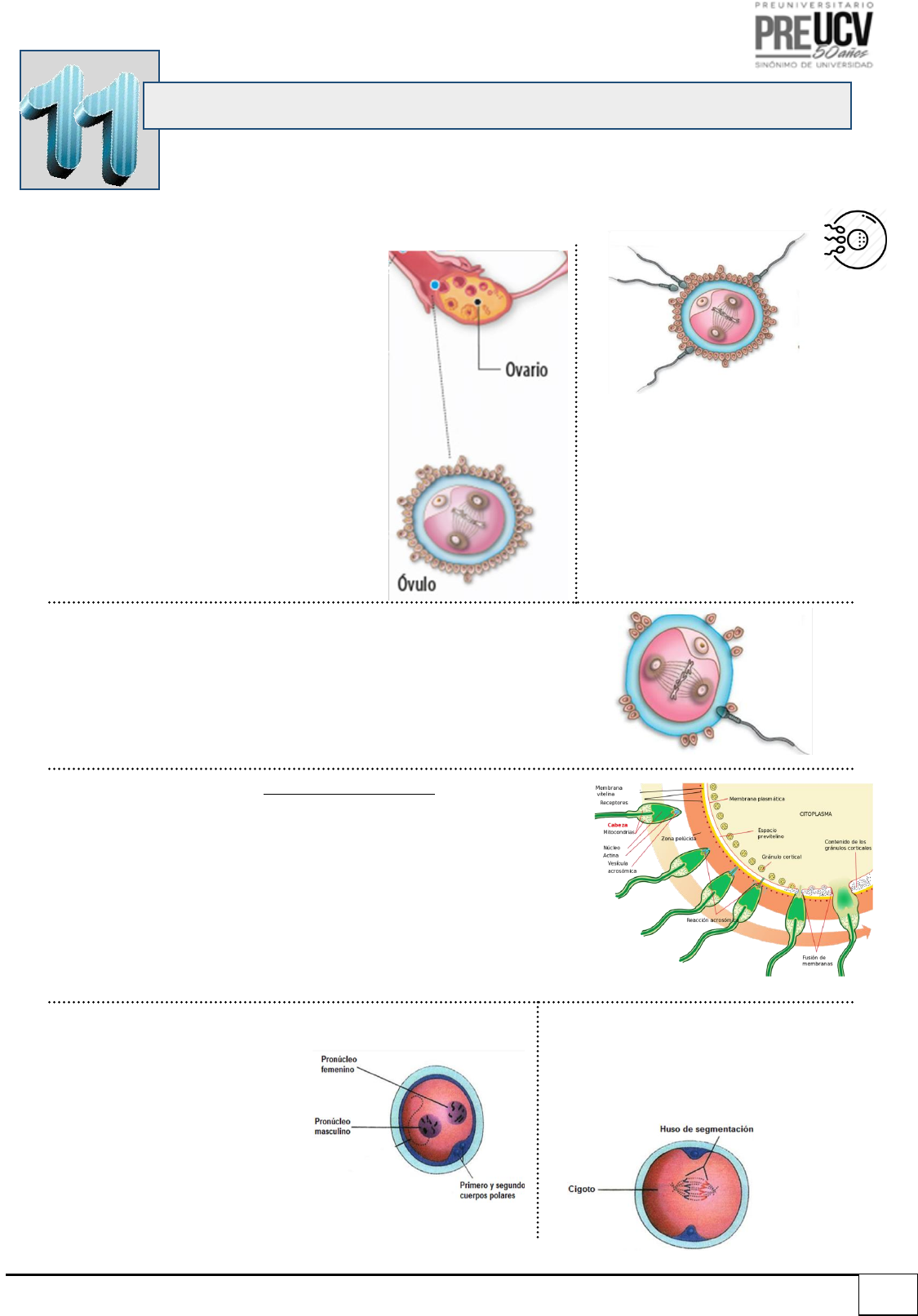 PREUNIVERSITARIO PREUCV DEPARTAMENTO DE CIENCIAS BIOLOGÍA FECUNDACION Y DESARROLLO EMBRIONARIO - FETAL 19 BIOLOGÍA – CLASE 11 Eje Temático: Estructura y Función de Seres Vivos Área temática: Biología Humana y Salud Sub – eje: Fecundación, Desarrollo Embrionario y Fetal Tareas: Identificar - Comprender - Distinguir - Interpretar - Reconocer 1. FECUNDACIÓN El proceso de fecundación puede definirse como una secuencia de acontecimientos moleculares coordinados en los que participan los gametos masculino y femenino. Consiste en la fusión y penetración de un espermatozoide en un ovocito y finaliza con la primera división normal del cigoto. A) Primero, ocurre la ovulación. Esta corresponde a la liberación del ovocito hacia las tubas uterinas u oviductos. B) Posteriormente ocurre una quimio-atracción desde el gameto femenino hacia el masculino, por medio de la secreción de moléculas solubles que atraen al espermatozoide. Además los espermatozoides atraviesan la corona radiata. C) Los espermatozoides con su acrosoma intacto tratan de alcanzar la zona pelúcida avanzando entre las células foliculares. Se ayudan con la enzima hialuronidasa presente en la membrana plasmática, construyendo una especie de túnel por el que avanzan con movimientos de hiperactivación. D) Posteriormente, ocurre la reacción acrosómica, esto gracias al reconocimiento de la proteína ZP3 de la zona pelúcida. La reacción acrosómica permite el desprendimiento de la corona radiada, el avance del espermatozoide a través de la zona pelúcida y la fusión de las membranas plasmáticas de ambos gametos. Varios espermatozoides pueden encontrarse penetrando la zona pelúcida, pero solo uno toma contacto con la membrana del ovocito II, debido a que existe un control de la poliespermia (se bloquea la entrada a más espermatozoides). E) Posteriormente, se reanuda la meiosis II del ovocito, expulsando el segundo corpúsculo polar o polocito y originando el cigoto. Se forma el pronúcleo masculino y pronúcleo femenino. Ambos pronúcleos se dirigen a la región central del óvulo donde se desenrollan los cromosomas y se replica el ADN. F) Los pronúcleos pierden sus cariotecas (singamia). Entre tanto, los cromosomas duplicados vuelven a condensarse y se ubican en la zona ecuatorial de la célula, como una metafase mitótica común (anfimixis). La anfimixis representa el fin de la fecundación. PREUNIVERSITARIO PREUCV DEPARTAMENTO DE CIENCIAS BIOLOGÍA HUMANA Y SALUD FECUNDACIÓN, DESARROLLO EMBRIONARIO Y FETAL Guía de Destrezas B – 11: Fecundación y Desarrollo Embrionario – Fetal. 20 BIOLOGÍA – CLASE 11 2. DESARROLLO EMBRIONARIO A) SEGMENTACIÓN Inmediatamente después de la fecundación ocurre la diferenciación de la primera célula que se convertirá en un nuevo organismo, esta es el cigoto. En este punto comienza la parte del desarrollo embrionario denominado segmentación, seguido por la implantación, gastrulación y neurulación finalizando con la organogénesis. 1. Después de la fecundación, se inicia una serie de procesos que conducen a la formación de un nuevo ser completo y viable. Corresponde a un periodo de intensa multiplicación y crecimiento celular. 2. Luego de la fecundación, tras 26 hrs, el cigoto se ha dividido en dos células llamadas blastómeros. 3. El embrión tras 38 hrs. luego de la fecundación, se ha dividiendo en 4 células. 26 hrs 38 hrs 4. El embrión a las 68 hrs. Se ha dividido formando 16 células. 68 hrs 5. El resultado final de la segmentación es un conglomerado macizo de pequeñas células que recibe el nombre de “mórula”. La mórula aparece, aproximadamente, cuatro días después de la fecundación. 4 días 6. La mórula sufre una serie de modificaciones. Se forma una cavidad al interior de ella llamada blastocele. En este momento el embrión ha ingresado al útero y se llama blástula o blastocisto. El blastocisto queda conformado por: Una masa de células internas llamada embrioblasto, a partir de la cual se formará el embrión. Una masa de células externas llamada trofoblasto, a partir de la cual se formarán los anexos embrionarios. 7 días ¿A QUÉ ESTRUCTURAS DARÁ ORIGEN EL EMBRIOBLASTO Y EL TROFOBLASTO? PREUNIVERSITARIO PREUCV DEPARTAMENTO DE CIENCIAS BIOLOGÍA HUMANA Y SALUD FECUNDACIÓN Y DESARROLLO EMBRIONARIO Y FETAL Guía de Destrezas B – 11: Fecundación y Desarrollo Embrionario – Fetal. 21 BIOLOGÍA – CLASE 11 B) IMPLANTACIÓN C) GASTRULACIÓN La implantación es un proceso complejo en el cual el embrión se aproxima y se adhiere al endometrio al que finalmente invade; esto ocurre por lo general en el tercio superior de la pared posterior del útero. En la etapa de aposición, el blastocisto encuentra su lugar de implantación, pierde la zona pelúcida y el trofoblasto hace contacto con la capa compacta del endometrio. En la etapa de adhesión, se expresan las integrinas β1, β3 y β4, las cuales son intermediarias entre el endometrio y el blastocisto facilitando la fijación del trofoblasto con las células epiteliales del endometrio. En la etapa de invasión participan activamente citocinas, siendo un factor importante cuando el endometrio está receptivo, ya que es una de las moléculas responsables del diálogo entre el embrión y el endometrio. Ya ocurrida la implantación se inicia la circulación útero placentaria gracias al trofoblasto. Las células del embrioblasto se subdividen en dos capas llamadas: ectodermo (externa) y endodermo (interna) y se forma así la Gástrula Didérmica. Desde el momento de la implantación se comienza a producir la Hormona gonadotrofina coriónica humana (hCG). La cual estimula al cuerpo lúteo, por lo que este continúa produciendo progesterona y estrógenos. Un grupo de células del ectodermo emigran hacia el centro de la estructura y dan origen a una tercera capa en el embrioblasto llamada mesodermo, formándose la gástrula tridérmica. En este proceso de diferenciación celular, cua