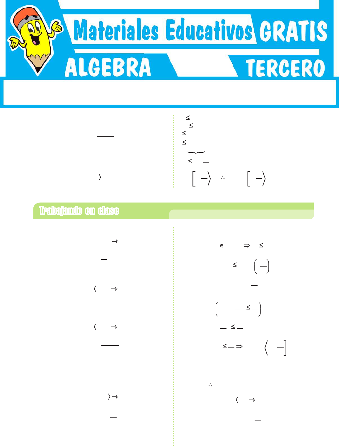Cálculo de rangos teniendo como datos los dominios: Dada la función F: [5; 7〉 → R, con regla de correspondencia: F(x) = 2x – 4 3 . Ahora calculamos el rango de esta función; para esto debemos recordar todas las propiedades de desigualdades aprendidas anteriormente. Dominio: DomF = [5; 7〉, entonces construimos el rango: +5 ≤ x < 7 «multiplicamos por 2» +10 ≤ 2x < 14 «restamos 4» 6 ≤ 2x – 4 < 10 «dividimos entre 3» 2 ≤ 2x – 4 3 < 10 3 2 ≤ y < 10 3 y ∈ 2; 10 3 ∴ RanF = 2; 10 3 Trabajando en clase Integral 1. Dada la función F: [–3; 3] → R, con regla de co- rrespondencia: F(x) = 2 3 x – 4 Calcula el rango de F. 2. Dada la función F: 〈–3; 5]→ R, con regla de co- rrespondencia: F(x) = 3x – 2 Calcula el rango de F. 3. Dada la función F: 〈–4; 7]→ R, con regla de co- rrespondencia: F(x) = 7x – 3 5 Calcula el rango de F. PUCP 4. Dada la función F: [–5; 3〉 → R, con regla de co- rrespondencia: F(x) = 2 – 5 3 x Calcula la suma del menor y el mayor valor ente- ro del rango. Resolución: Y Dominio = DomF = [–5; 3〉, entonces x ∈ [–5; 3〉 ⇒ –5 ≤ x < 3 Y Construimos el rango (–5 ≤ x < 3) – 5 3 «Multiplicamos por – 5 3 »; debes tener cuidado, porque estas multiplicando por un número ne- gativo –5 < – 5 3 x ≤ 25 3 + 2 «sumamos 2» –3 < 2 – 5 3 x ≤ 31 3 –3 < F(x) ≤ 31 3 ⇒ RanF = –3; 31 3 Y Observando el rango: ● Menor valor entero: –2 ● Mayor valor entero: 10 ∴ la suma de dichos valores: 8 5. Dada la función F: 〈3; 8]→ R, con regla de corres- pondencia: F(x) = 7 – 5 3 x Calcula la suma del menor y el mayor valor en- tero del rango. EJERCICIOS DE FUNCIONES 6. Dada la función F: 〈–2; 4〉 → R, con regla de co- rrespondencia: F(x) = 12 x + 7 Calcula la cantidad de números enteros del rango. 7. Dada la función F: 〈2; 5] → R, con regla de co- rrespondencia: F(x) = 7 3 – x . Calcula el rango. UNMSM 8. Dada la función F: 〈8; 10] → R con regla de co- rrespondencia F(x) = (x – 2)2 – 4. Calcula la suma del mayor y menor valor entero del rango. Resolución: Y Dominio = DomR = 〈8; 10], entonces x ∈ 〈8; 10] ⇒ 8 < x ≤ 10 Y Construimos el rango: (8 < x ≤ 10) – 2 «Restamos 2» (6 < x – 2 ≤ 8) «Elevamos al cuadrado» (36 < (x – 2)2 ≤ 64) – 4 «Restamos 4» 32 < (x – 2)2 – 4 ≤ 60 32 < F(x) ≤ 60 ⇒ Ranf = 〈32; 60] Y Observamos el rango: ● Menor valor entero = 33 ● Mayor valor entero = 60 ∴ Suma de valores = 93 9. Dada la función: [–7; 2〉 → R, con regla de corres- pondencia F(x) = (x + 8)2 – 10. Calcula la suma del mayor y menor valor entero del rango. 10. Dada la función F: 〈–1; 3] → R, con regla de co- rrespondencia F(x) = (x – 5)2 + 4. Calcula la suma del mayor y menor valor entero del rango. 11. Dada la función F: 〈–1; 6] → R, con regla de co- rrespondencia F(x) = (x – 5)2 + 5. Si el rango de F es [a; b〉, calcula «ab». UNI 12. Calcula el rango de la función: F(x) = x2 – 8x + 15 si x ∈ [6; 9〉. Resolución: Y Completamos cuadrados: F(x) = x2 – 8x + 15 F(x) = (x – 4)2 – 1 Como x ∈ [6; 9〉 ⇒ 6 ≤ x < 9 Y Construimos el rango: (6 ≤ x < 9) – 4 «restamos 4» (2 ≤ x – 4 < 5) «elevamos al cuadrado» (4 ≤ (x – 4)2 < 25) – 1 «restamos 1» 3 ≤ (x – 4)2 – 1 < 24 3 ≤ f(x) < 24 ∴ RanF = [3; 24〉 13. Si x ∈ [2; 5〉, calcula el rango de la función: F(x) = x2 – 6x + 3. 14. Si: x ∈ 〈–8; 4〉, calcula el rango de la función: F(x) = x2 + 4x – 2 Da como respuesta el producto del mayor y el menor valor entero de dicho rango.