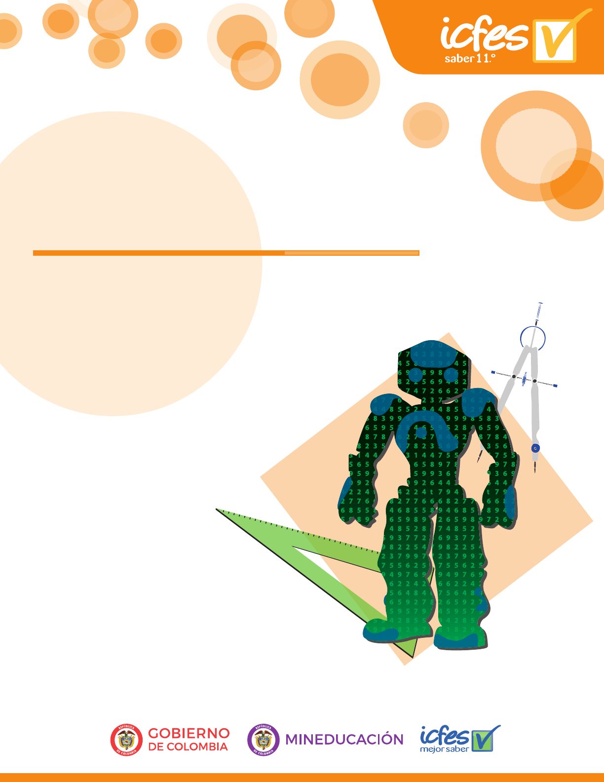 .° Prueba de matemáticas Cuadernillo de preguntas Saber 11 ADVERTENCIA Todo el contenido es propiedad exclusiva y reservada del Icfes y es el resultado de investigaciones y obras protegidas por la legislación nacional e internacional. No se autoriza su reproducción, utilización ni explotación a ningún tercero. Solo se autoriza su uso para fines exclusivamente académicos. Esta información no podrá ser alterada, modificada o enmendada. Publicación del Instituto Colombiano para la Evaluación de la Educación (Icfes) © Icfes, 2018. Todos los derechos de autor reservados. Gestores de la Prueba Mariam Pinto Heydler Rafael Eduardo Benjumea Hoyos David Mauricio Ruiz Ayala César Garzón Baquero Corrección de estilo Juan Camilo Gómez Barrera Diagramación Diego Fernando Ahumada Bocanegra Presidente de la República Iván Duque Márquez Ministra de Educación Nacional María Victoria Angulo González Viceministro de Educación Preescolar, Básica y Media Constanza Liliana Alarcón Párraga Directora General María Figueroa Cahnspeyer Secretaria General Liliam Amparo Cubillos Vargas Directora de Evaluación Natalia González Gómez Director de Producción y Operaciones Mateo Ramírez Villaneda Director de Tecnología Felipe Guzmán Ramírez Oficina Asesora de Comunicaciones y Mercadeo María Paula Vernaza Díaz Oficina Gestión de Proyectos de Investigación Luis Eduardo Jaramillo Flechas Subdirectora de Producción de Instrumentos Nubia Rocío Sánchez Martínez Subdirector de Diseño de Instrumentos Luis Javier Toro Baquero Subdirector de Estadísticas Jorge Mario Carrasco Ortiz Subdirectora de Análisis y Divulgación Ana María Restrepo Sáenz ISSN de la versión digital: En trámite Bogotá, D. C., noviembre de 2018 TÉRMINOS Y CONDICIONES DE USO PARA PUBLICACIONES Y OBRAS DE PROPIEDAD DEL ICFES El Instituto Colombiano para la Evaluación de la Educación (Icfes) pone a la disposición de la comunidad educativa y del público en general, DE FORMA GRATUITA Y LIBRE DE CUALQUIER CARGO, un conjunto de publicaciones a través de su portal www.icfes.gov.co. Dichos materiales y documentos están normados por la presente política y están protegidos por derechos de propiedad intelectual y derechos de autor a favor del Icfes. Si tiene conocimiento de alguna utilización contraria a lo establecido en estas condiciones de uso, por favor infórmenos al correo prensaicfes@icfes.gov.co. Queda prohibido el uso o publicación total o parcial de este material con fines de lucro. Únicamente está autorizado su uso para fines académicos e investigativos. Ninguna persona, natural o jurídica, nacional o internacional, podrá vender, distribuir, alquilar, reproducir, transformar*,1 promocionar o realizar acción alguna de la cual se lucre directa o indirectamente con este material. Esta publicación cuenta con el registro ISBN (International Standard Book Number, o Número Normalizado Internacional para Libros) que facilita la identificación no solo de cada título, sino de la autoría, la edición, el editor y el país en donde se edita. En todo caso, cuando se haga uso parcial o total de los contenidos de esta publicación del Icfes, el usuario deberá consignar o hacer referencia a los créditos institucionales del Icfes respetando los derechos de cita; es decir, se podrán utilizar con los fines aquí previstos transcribiendo los pasajes necesarios, citando siempre al Icfes como fuente de autor. Lo anterior siempre que los pasajes no sean tantos y seguidos que razonadamente puedan considerarse como una reproducción simulada y sustancial, que redunde en perjuicio del Icfes. Asimismo, los logotipos institucionales son marcas registradas y de propiedad exclusiva del Icfes. Por tanto, los terceros no podrán usar las marcas de propiedad del Icfes con signos idénticos o similares respecto de cualesquiera productos o servicios prestados por esta entidad, cuando su uso pueda causar confusión. En todo caso queda prohibido su uso sin previa autorización expresa del Icfes. La infracción de estos derechos se perseguirá civil y, en su caso, penalmente, de acuerdo con las leyes nacionales y tratados internacionales aplicables. El Icfes realizará cambios o revisiones periódicas a los presentes términos de uso, y los actualizará en esta publicación. El Icfes adelantará las acciones legales pertinentes por cualquier violación a estas políticas y condiciones de uso. * La transformación es la modificación de la obra a través de la creación de adaptaciones, traducciones, compilaciones, actualizaciones, revisiones y, en general, cualquier modificación que de la obra se pueda realizar, de modo que la nueva obra resultante se constituya en una obra derivada protegida por el derecho de autor, con la única diferencia respecto de las obras originales de que aquellas requieren para su realización de la autorización expresa del autor o propietario para adaptar, traducir, compilar, etcétera. En este caso, el Icfes prohíbe la transformación de esta publicación. 4 ¿Qué contiene este cuadernillo? Este es un cuadernillo con preguntas de la Prueba de matemáticas de Saber 11.° que fueron utilizadas en exámenes anteriores. Estas serán útiles para familiarizarte y conocer aún más la prueba. Al final del documento encontrarás la respuesta correcta de cada una de las preguntas. ¡Recuerda! Los exámenes Saber evalúan competencias, por tanto, en las preguntas encontrarás una situación (que debes tratar de entender) en la que tendrás que aplicar tus conocimientos para tomar decisiones y elegir la mejor respuesta. 5Prueba de matemáticas PRUEBA DE MATEMÁTICAS Un sistema de transporte masivo tiene varias estaciones (E1, E2,…) sobre una avenida. En condiciones normales, de una estación a otra, un bus se demora 4 minutos, y en cada parada, 30 segundos. En la figura, los círculos sombreados representan las paradas de cada ruta (R1, R2,...). Un usuario que quiere ir de E1 a E10 en el menor ti
