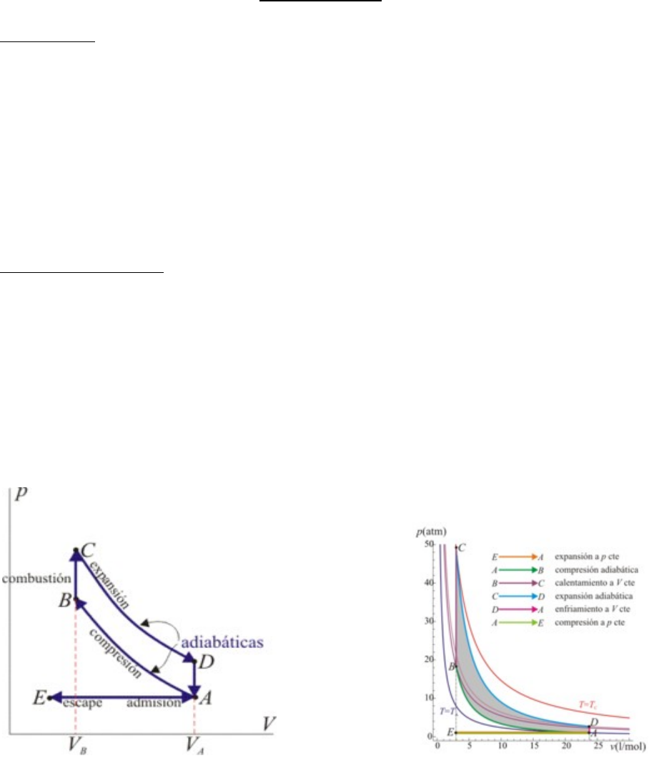 Ciclo de Otto Introducción: Los motores son máquinas termodinámicas, que utilizan la energía de la combustión transformándola en movimiento. A lo largo del desarrollo tecnológico, el hombre ha producido diferentes tipos de motores, cada uno adecuado a diferentes necesidades y condiciones de utilización. Los distintos tipos de motor tienen requerimientos específicos para su alimentación energética. La industria petrolera ha sabido dar respuesta a esta necesidad, desarrollando combustibles adecuados a cada tipo de motor. Existen motores de combustión externa, como la máquina de vapor, donde la fuente de calor (caldera) es exterior al mecanismo. En los de combustión interna, por el contrario, la fuente térmica está dentro de la máquina. Los principales tipos de motores de la actualidad son: motores de Ciclo Otto, motores de Ciclo Diesel y Turbinas. El ciclo Otto, definicion.- es el ciclo termodinámico (Se denomina ciclo termodinámico a cualquier serie de procesos termodinámicos tales que, al transcurso de todos ellos, el sistema regrese a su estado inicial; es decir , que la variación de las magnitudes termodinámicas propias del sistema sea nula.) que se aplica en los motores de combustión interna (Un motor de combustión interna, motor a explosión o motor a pistón, es un tipo de máquina que obtiene energía mecánica directamente de la energía química de un combustible que arde dentro de una cámara de combustión. Su nombre se debe, a que dicha combustión se produce dentro de la máquina en si misma, a diferencia de, por ejemplo, la máquina de vapor) de encendido provocado (motores de gasolina). Se caracteriza porque en una primera aproximación teórica, todo el calor se aporta a volumen constante. Esquema de un ciclo Otto de 4 Ciclo Otto con valores exactos tiempos en un diagrama PV. Motor de Otto.- El motor de encendido por chispa está basado en principios teóricos enunciados por BEAU DE ROCHAS, según los cuales la combustión se verifica a volumen constante, y fue realizado prácticamente por el alemán OTTO, en 1862. Suele llamarse, en general, motor de ciclo Otto. A la categoría de encendido por chispa pertenece la mayor parte de los motores de automovilismo, una gran parte de los motores para tracción industrial, todos los motores para motociclos y aeronaves y una buena parte de los motores para aplicaciones náuticas y grícolas. Los motores de encendido por chispa funcionan a 4 o a 2 tiempos, pero el ciclo de 2 tiempos es poco usado a causa de las pérdidas de mezcla que se producen a través del escape y del consiguiente elevado consumo del combustible. Por tanto, la gran mayoría de los motores de encendido por chispa funcionan según el ciclo operatorio de 4 tiempos. El de 2 tiempos se adopta solamente en casos particulares, como son los motores fuera-borda y los pequeños motores de motocicleta. El combustible es la gasolina, esto es: hidrocarburos ligeros de elevado poder calorífico, que se evaporan fácilmente. Pueden usarse también combustibles gaseosos o asimismo gas licuado, pero su empleo es menos práctico y, por ello, mucho menos difundido. Los motores de encendido por chispa pueden ser alimentados por carburación o por Inyección. En este segundo caso, el combustible se mezcla al aire inyectándolo en el conducto de aspiración en la toma de la válvula, o bien directamente en la cámara de combustión; con todo, este último método es el menos empleado. La alimentación por inyección tiene la ventaja, en el caso de los motores pluricilíndricos, de distribuir de manera uniforme el combustible en los diversos cilindros, de no ser sensible a la aceleración y de no estar sujeto a formaciones de hielo, pero es más complicada y costosa, especialmente por lo que respecta a la regulación y, por ello, no ha tenido todavía una gran difusión. Clasificación del Ciclo de Otto: Por ciclo operativo entendemos la sucesión de operaciones que el fluido activo ejecuta en el cilindro y repite con ley periódica. La duración del ciclo operativo es medida por el número de carreras efectuadas por el pistón para realizarlo. Se dice que los motores alternativos son: * 4 tiempos * El ciclo se realiza en 4 carreras del pistón * Realizan un ciclo cada dos revoluciones del árbol motor * 2 tiempos * El ciclo se realiza solamente en 2 carreras del pistón * Realizan un ciclo a cada revolución Se han ideado, sin embargo, motores en los cuales el ciclo operativo se verifica en 6 carreras del pistón. En este caso particular, cuatro de las seis carreras son empleadas para ejecutar las mismas operaciones del ciclo de cuatro tiempos, y las dos restantes sirven para retener la mezcla combustible en el interior del cilindro con objeto de permitir al combustible, cuando es poco volátil, vaporizarse por completo y difundirse en el aire comburente, o bien realizar un barrido del cilindro con aire puro. Estos motores no han tenido, sin embargo, una difusión práctica. Motor a 4 Tiempo. La gran mayoría de los motores endotérmicos son de 4 tiempos y a ellos nos referiremos también con preferencia porque se prestan a una más fácil comprensión. El ciclo de 4 tiempos comprende las fases siguientes: * Admisión de la carga en el cilindro * Compresión de la carga * Combustión y expansión * Expulsion o escape de los productos de la combustión Cada fase corresponde aproximadamente a una carrera del pistón. Admisión.- Al inicio de este tiempo el pistón se encuentra en el PMS (Punto Muerto Superior). En este momento la válvulade admisión se encuentra abierta y el pistón, en su carrera o movimiento hacia abajo va creando un vacío dentro de la cámara de combustión a medida que alcanza el PMI (Punto Muerto Inferior), ya sea ayudado por el motor de arranque cuando ponemos en marcha el motor, o debido al propio movimiento que por inercia le proporciona el volante una vez que ya se encuentra funcionando. El vacío que crea el pistón en este tiempo, 