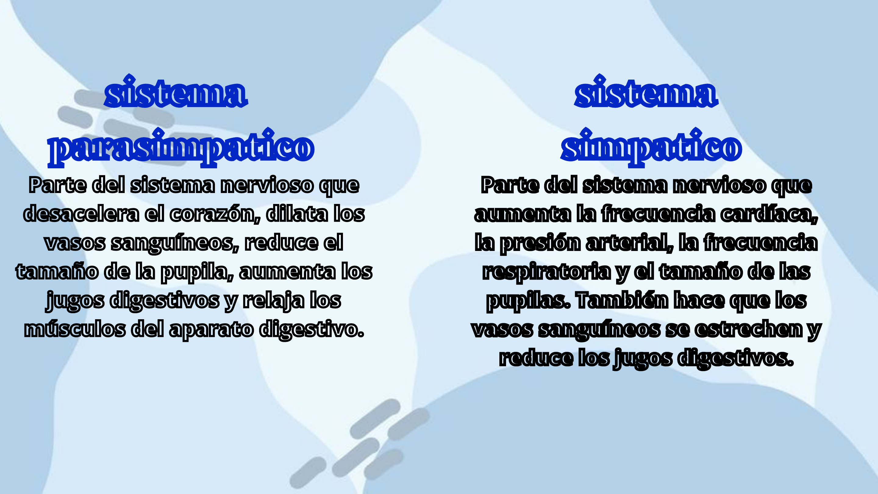 CUADRO COMPARATIVO sistema parasimpatico sistema parasimpatico sistema simpatico sistema simpatico Parte del sistema nervioso que desacelera el corazón, dilata los vasos sanguíneos, reduce el tamaño de la pupila, aumenta los jugos digestivos y relaja los músculos del aparato digestivo. Parte del sistema nervioso que desacelera el corazón, dilata los vasos sanguíneos, reduce el tamaño de la pupila, aumenta los jugos digestivos y relaja los músculos del aparato digestivo. Parte del sistema nervioso que aumenta la frecuencia cardíaca, la presión arterial, la frecuencia respiratoria y el tamaño de las pupilas. También hace que los vasos sanguíneos se estrechen y reduce los jugos digestivos. Parte del sistema nervioso que aumenta la frecuencia cardíaca, la presión arterial, la frecuencia respiratoria y el tamaño de las pupilas. También hace que los vasos sanguíneos se estrechen y reduce los jugos digestivos. YANEY YRIDIAN URIBE SANCHEZ