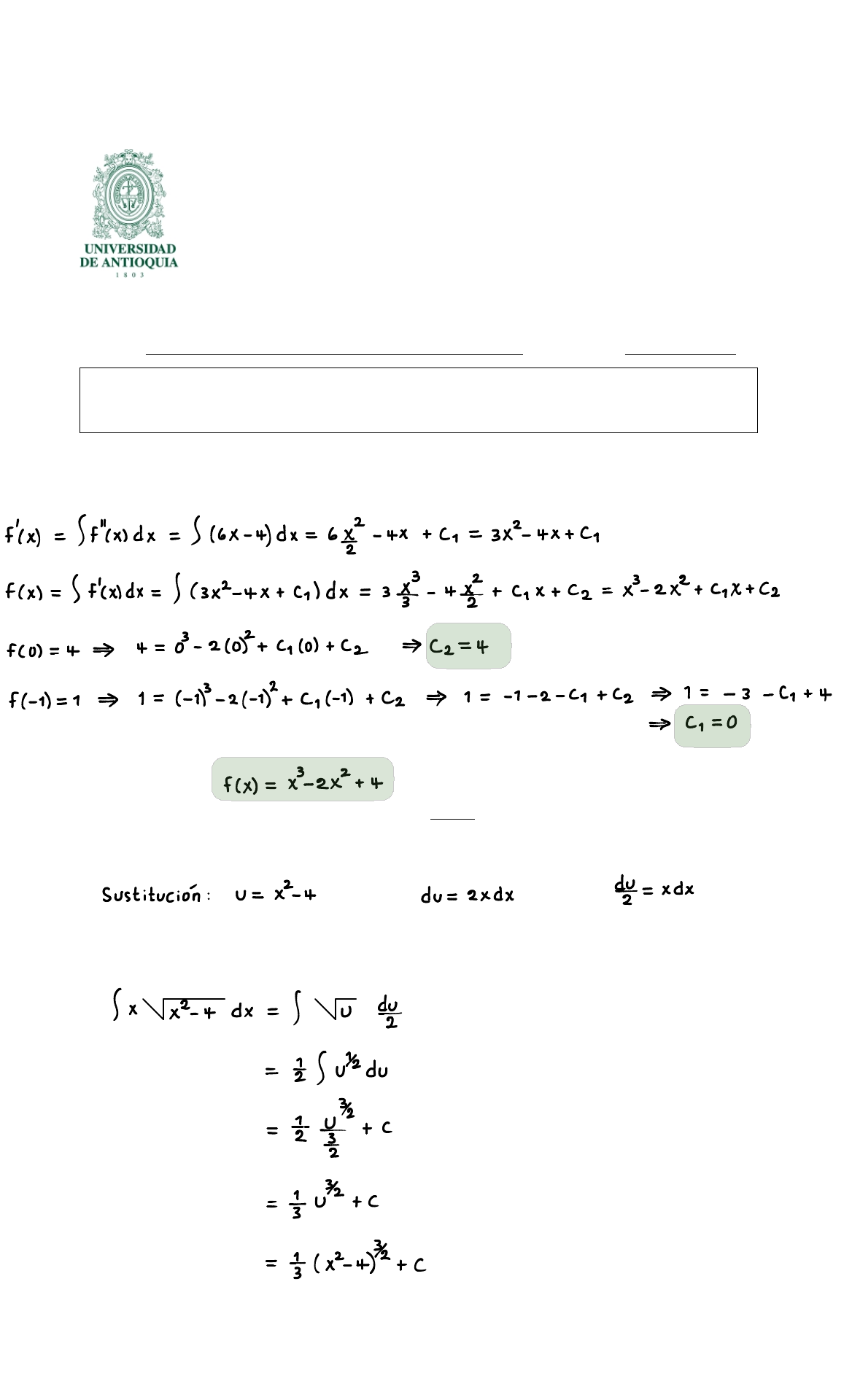 UNIVERSIDAD DE ANTIOQUIA Facultad de Ciencias Económicas Matemáticas II Parcial 2 Fecha Prof. Jaiberth Porras B. Nombre: Documento: * La interpretación hace parte de la evaluación, no se responden preguntas durante el parcial. * Se puede usar calculadora pero no celulares, tabletas y portátiles. * El examen debe ser resuelto en un tiempo máximo de 1 hora y 40 minutos. 1. (20%) Suponga que f 00 (x) = 6x� 4. Si f(0) = 4 y f(�1) = 1, encuentre f . 2. (20%) Calcular la integral indefinida Z x p x 2 � 4 dx. 3. (20%) Calcular por el método de sumas de Riemann Z (x 2 + 3) dx. Graficar la función f(x) = x 2 + 3 y sombrear el área determinada por la integral anterior. 4. (20%) Calcular la integral definida Z 1 0 x(x 2 + 1) 10 dx. 5. (20%) Sea f prom el valor promedio de la función f(x) = x 2 +1 en el intervalo [0, 1]. Encontrar el valor de c tal que f(c) = f prom .