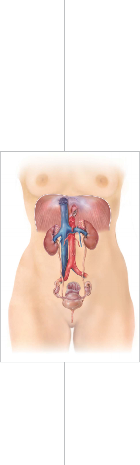 El aparato urinario está constituido por dos riñones, dos uréteres, la vejiga y la uretra (Figura 26.1). Después de que los riñones filtran el plas- ma sanguíneo, devuelven la mayor parte del agua y los solutos a la corriente sanguínea. El agua y los solutos remanentes constituyen la orina, que transcurre por los uréteres y se almacena en la vejiga urina- ria hasta que se excreta a través de la uretra. La nefrología (nephro-, riñón; y -logía, estudio) es el estudio científico de la anatomía, la fisiolo- gía y las enfermedades de los riñones. La rama de la medicina que estu- dia los aparatos urinarios masculino y femenino y el aparato reproductor masculino es la urología (oûro-, orina). El médico que se especializa en esta rama de la medicina es el urólogo. 1065 EL APARATO URINARIO26 APARATO URINARIO Y HOMEOSTASIS El aparato urinario contribuye con la homeostasis mediante la alteración de la composición de la sangre, el pH, el volumen y la presión, el mantenimiento de la osmolaridad de la sangre, la excreción de desechos y sustancias extrañas y la producción de hormonas. ¿Alguna vez pensó en qué forma actúan los diuréticos y por qué se utilizan?? 93126-26.qxd 10/1/12 11:08 AM Page 1065 http://booksmedicos.org 1066 CAPÍTULO 26 • EL APARATO URINARIO Diafragma Esófago Glándula suprarrenal izquierda Aorta abdominal Vena cava inferior Recto RIÑÓN DERECHO Arteria renal derecha URÉTER DERECHO URÉTER IZQUIERDO RIÑÓN IZQUIERDO Vena renal izquierda VEJIGA URETRA Ovario izquierdo Útero MEDIALLATERAL (b) Vista anterior URÉTER Vena renal RIÑÓN Arteria renal Arterias suprarrenales Vena cava inferior Glándula suprarrenal FUNCIONES DEL APARATO URINARIO 1. Los riñones regulan el volumen y la composición de la sangre, ayudan a regular la presión arterial, el pH y la glucemia, producen dos hormonas (calcitriol y eritropoyetina) y excretan los desechos en la orina. 2. Los uréteres transportan la orina desde los riñones hasta la vejiga. 3. La vejiga almacena la orina y la excreta a través de la uretra. 4. La uretra expulsa la orina del cuerpo. La orina que se forma en los riñones primero ingresa en los uréteres, luego en la vejiga para su almacenamiento y, por último, atraviesa la uretra para su evacuación. ¿Qué órganos constituyen el aparato urinario? Figura 26.1 Órganos del aparato urinario en la mujer. 93126-26.qxd 10/1/12 11:08 AM Page 1066 http://booksmedicos.org 26.1 GENERALIDADES DE LAS FUNCIONES DEL RIÑÓN O B J E T I V O • Enumerar las funciones de los riñones. Los riñones realizan el trabajo principal de la actividad del apa- rato urinario. Las otras regiones son, sobre todo, vías de paso y órganos de almacenamiento. Las funciones de los riñones son las siguientes: • Regulación de la composición iónica de la sangre. Los riñones ayudan a regular los niveles plasmáticos de diversos iones, en especial sodio (Na+), potasio (K+), calcio (Ca2+), cloruro (Cl–) y fosfato (HPO4 2–). • Regulación del pH sanguíneo. Los riñones excretan una cantidad variable de iones hidrógeno (H+) hacia la orina y conservan los iones bicarbonato (HCO3 –), que son importantes para amortiguar los H+ de la sangre. Estas dos funciones contribuyen a mantener el pH sanguíneo. • Regulación de la volemia. Los riñones regulan la volemia a tra- vés de la conservación o la eliminación de agua en la orina. El aumento de la volemia incrementa la tensión arterial y un descen- so de ésta disminuye la tensión arterial. • Regulación de la tensión arterial. Los riñones también intervie- nen en la regulación de la tensión arterial, mediante la secreción de la enzima renina, que activa el sistema renina-angiotensina- aldosterona (véase la Figura 18.16). El aumento de la renina eleva la tensión arterial. • Mantenimiento de la osmolaridad de la sangre. A través de la regulación de la pérdida de agua y, por otro sistema, de la pérdida de solutos en la orina, los riñones mantienen la osmolaridad san- guínea relativamente constante alrededor de 300 miliosmoles por litro (mOsm/L)*. • Producción de hormonas. Los riñones producen dos hormonas. El calcitriol, la forma activa de la vitamina D, ayuda a regular la homeostasis del calcio (véase la Figura 18.14), y la eritropoyetina estimula la producción de eritrocitos (véase la Figura 19.5). • Regulación de la glucemia. Al igual que el hígado, los riñones pueden utilizar el aminoácido glutamina para la gluconeogéne- sis, que es la síntesis de nuevas moléculas de glucosa, y luego liberar glucosa hacia la sangre para mantener una glucemia nor- mal. • Excreción de desechos y sustancias extrañas. Mediante la forma- ción de la orina, los riñones contribuyen a la excreción de des- echos, o sea sustancias que no cumplen una función útil en el cuerpo. Algunos de los desechos excretados con la orina son el producto de reacciones metabólicas, como el amoníaco y la urea, que se forman luego de la desaminación de los aminoácidos, la bilirrubina procedente del catabolismo de la hemoglobina, la cre- atinina de la degradación de la creatina fosfato en las fibras mus- culares y el ácido úrico del catabolismo de los ácidos nucleicos. Otros residuos que se excretan con la orina son sustancias extra- ñas incorporadas con los alimentos, como fármacos y toxinas ambientales. P R E G U N T A S D E R E V I S I Ó N 1. ¿Qué son los desechos y cómo participan los riñones en su eliminación del cuerpo? 26.2 ANATOMÍA E HISTOLOGÍA DE LOS RIÑONES O B J E T I V O S • Describir las características anatómicas macroscópicas externas e internas de los riñones. • Señalar la trayectoria del flujo sanguíneo que atraviesa los riñones. • Describir la estructura de los corpúsculos renales y los túbulos renales. Los riñones son órganos pares, de color rojizo y con forma de alubia (poroto, frijol o judía), situados en los flancos, entre el peri- toneo y la pared posterior d