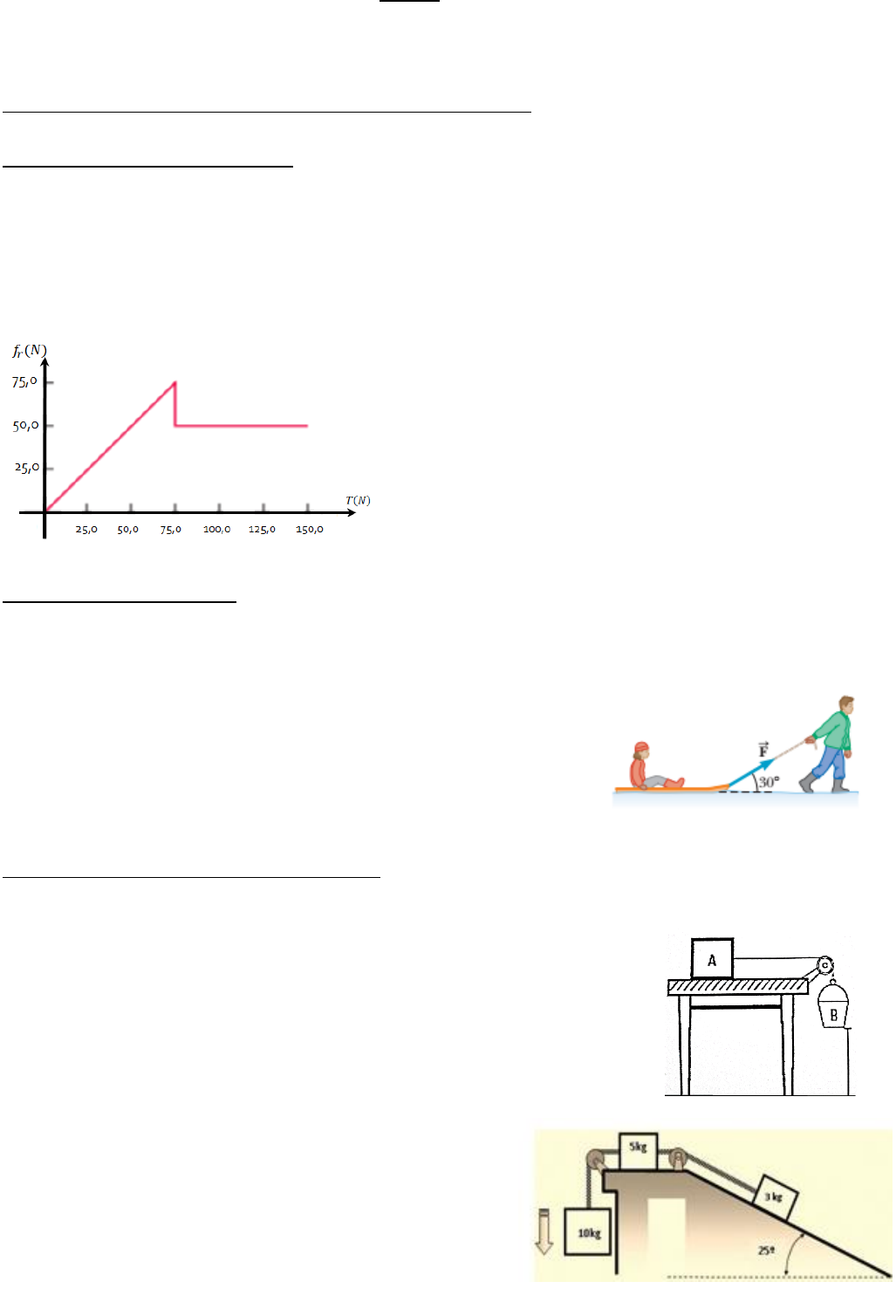 Facultad de Ingeniería FISICA I AÑO 2023 Universidad Nacional de Jujuy – U.N.Ju 1 TRABAJO PRÁCTICO Nº 5: Dinámica de la partícula –Fuerza de Rozamiento A – PROBLEMAS PARA RESOLVER EN CLASE TEÓRICO – PRÁCTICA Ejercicio 1: Gráfico de Fuerzas de roce En un experimento de laboratorio acerca de la fricción, se tira de un bloque de 135 N que descansa sobre una mesa horizontal áspera con ayuda de un cable horizontal. El tirón aumenta gradualmente hasta que el bloque comienza a moverse y continúa aumentando a partir de entonces. La figura muestra una gráfica de la fuerza de fricción sobre este bloque en función del tirón. a) Identifique el movimiento que realiza el bloque en cada una de las zonas de gráfico. b) Calcule los coeficientes de fricción estática y cinética entre el bloque y la mesa. c) ¿Por qué la gráfica se dirige hacia arriba en la primera parte, pero luego se nivela? Ejercicio 2: Paseando en trineo Suponga que una estudiante de Física de masa m1 está sobre un trineo de masa m2 y le pide a su amigo Ricardo que la traslade a través de una superficie horizontal y plana. Ella asegura que si consideramos la masa del trineo, el valor de la fuerza de rozamiento del sistema es igual a μk mT g, siendo mT = m1 + m2 • A) ¿Es válida la afirmación? Justifique su respuesta. • B) Deduzca la ecuación de la fuerza mínima F necesaria que debe hacer Ricardo para empezar a mover al trineo y su amiga, siendo μe el coeficiente de rozamiento estático entre la superficie y el trineo. B - PROBLEMAS PARA LA CLASE DE SEMINARIO 1. Rompiendo el equilibrio. Se realiza el siguiente experimento. Se arma el sistema de la figura donde el bloque A de 2,00 kg está y permanece en reposo sobre la mesa horizontal. Se va agregando arena en el balde B, de modo que en cierto instante se rompe el equilibrio, y el sistema acelera. Sabiendo que en B se ha totalizado una masa de 1,20 kg y que tarda 0,80 s en llegar al piso, hallar los coeficientes de rozamiento entre el bloque A y la mesa, despreciando la masa de la cuerda y los rozamientos en la polea. 2. Bloques acelerados. Los tres bloques de la siguiente figura están conectados por medio de cuerdas ligeras que pasan sobre las poleas sin fricción. La aceleración del sistema es de 2,00 m/s2 hacia la izquierda y las superficies son ásperas. Determine a) las tensiones en las cuerdas y b) el coeficiente de rozamiento cinético entre el bloque y la superficie horizontal sabiendo que el coeficiente de rozamiento entre el bloque de 3,00 kg y el plano inclinado es de 0,68. 0,8m Facultad de Ingeniería FISICA I AÑO 2023 Universidad Nacional de Jujuy – U.N.Ju 2 3. Bloques rugosos. Para el diagrama mostrado, hallar la intensidad máxima que podrá tener la fuerza F antes que algún bloque se mueva, y la aceleración que adquieren una vez iniciado el movimiento, si se mantiene aplicada F con la intensidad calculada. Las masas son m1 = 30,0 kg y m2 = 20,0 kg, y los coeficientes de rozamiento entre bloques y con el piso son µe = 0,6 µd = 0,25. 4. Que no caiga el bloque B. El sistema de la figura está compuesto de dos bloques, A y B, de masa 16,0 kg y 4,0 kg respectivamente. La superficie horizontal no presenta fricción y el coeficiente de rozamiento estático entre los bloques es 0,5. ¿Cuál es la mínima fuerza F que se debe aplicar al bloque A para que B no caiga por acción de la gravedad? (usar g = 10 m/s2 ) □ a) 50 N □ b) 100 N □ c) 200 N □ d) 400 N □ e) 800 N □ f) 1600 N 5. Cinta Transportadora. Ud. trabaja como asistente técnico en el sector de producción y el gerente de producción le pide que seleccione el material más adecuado para la cinta transportadora, teniendo en cuenta el costo y que se cumplan los requerimientos correspondientes a la función que se busca, es decir, que el traslado de estas cajas sea lo más eficiente posible, en las condiciones dadas. La inclinación de la cinta transportadora es de 20° con respecto a la horizontal su ancho es de 50 cm, las cajas pesan 30 kgf y recorren una distancia de 20 m a lo largo de la pendiente de la cinta. La longitud de la cinta necesaria para armar el circuito de transporte es de 50 m aproximadamente. Las cintas de uso general abarcan un amplio rango, el proveedor, en este caso le ofrece tres materiales con ese ancho donde proporciona costo por metros lineales y los factores de fricción 1) tela plástica µe = 0,4 y µd = 0,3; $ 200 el metro 2) lona µe = 0,6 y µd = 0,4; $ 350 el metro 3) goma µe = 0,8 y µd = 0,5; $ 500 el metro. 6. Montaña Rusa. Un carrito de una montaña rusa con sus ocupantes tiene una masa de 500 kg. La ruta de la montaña rusa va desde su punto inicial que se muestra en la figura hasta el punto B. a) Si el vehículo tiene una rapidez de 20,0 m/s en el punto A, ¿cuál es la fuerza que ejerce la vía sobre el carrito en este punto? b) ¿Cuál es la rapidez máxima que el vehículo puede tener en el punto B y permanecer en la vía? Suponga que las pistas de la montaña rusa en los puntos A y B son partes de círculos verticales de radio 𝑟𝐴 = 10,0 m y 𝑟𝐵 = 15,0 m respectivamente. 7. Péndulo cónico. Considere un péndulo cónico con un peso de 80,0 kgf sujetado a un alambre de 10,0m que forma un ángulo de 5,0º con la vertical. Determine a) las componentes horizontal y vertical de la fuerza ejercida por el alambre en el péndulo y b) la aceleración radial del peso. 8. Sillas Voladoras. El Columpio Gigante de una feria consiste en un eje vertical central con varios brazos horizontales en su extremo superior. Cada brazo sostiene un asiento suspendido de un cable de 5 m de longitud sujeto al brazo en un punto a 3,00m del eje central. a) Calcule el tiempo de una revolución del columpio si el cable forma un ángulo de 30° con la vertical. b) ¿Depende el ángulo del peso del pasajero para una rapidez de giro dada? F F A B 1 2 F Facultad de Ingeniería FISICA I AÑO 2023 Universidad Nacional de Jujuy – U.N.Ju 3 9. U