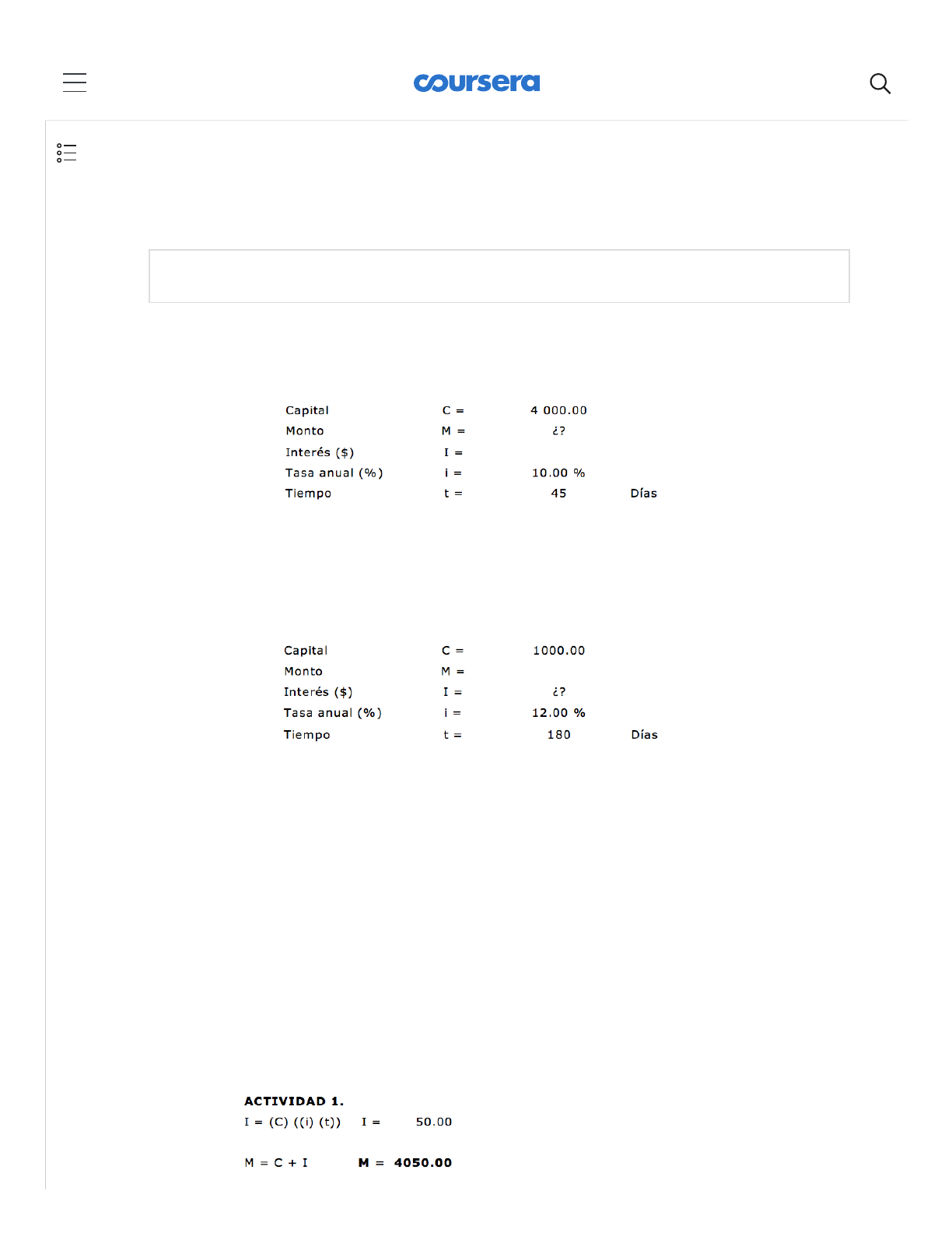 13/5/2020 Actividad adicional. Interés simple | Coursera https://www.coursera.org/learn/matematicas/supplement/tj0Uc/actividad-adicional-interes-simple 1/1 1. Descarga la hoja de cálculo Actividad_adicional_m1 para realizar los cálculos que se solicitan a continuación, empleando las fórmulas de interés simple. Actividad_adicional_m1.xlsx 2. Primero determina el monto a recibir en una inversión con los siguientes datos y utiliza la pestaña actividad1 de la hoja de cálculo que descargaste previamente. 3. La segunda actividad es que determines el importe de los intereses a pagar en un financiamiento con los siguientes datos; utiliza el formato de la pestaña actividad2 de la hoja de cálculo que descargaste previamente. Retroalimentación Estimado participante: El interés simple es utilizado en la inversión y el financiamiento, por ejemplo, en una inversión podemos definir el monto a recibir si se invierte un capital, a una tasa de interés simple; en el caso del financiamiento, podemos conocer el importe de los intereses que pagaremos por el financiamiento. Es importante que durante el curso utilices las fórmulas del tema de interés simple para su aplicación en microcasos de inversión o de financiamiento. Te presento la solución al planteamiento. https://d3c33hcgiwev3.cloudfront.net/_64c7fc3883d3be70a2504419640c4d45_Actividad_adicional_m1.xlsx?Expires=1589587200&Signature=hRiQ9VJ5qBl2wovXhnm1Y1DBHcjN3-9A5uSvMjoeg0vUJlopMFObb5Kv2ZdQ1D3CVp6jEz1eYbxXN7BXHCI9KHzjuxl9JcugVhwoqEr6JdZJYD9sJCNDiWY4DmQJSLDfm~df0hLl~PIoJ7vwJI5pku6DXhmo~ErHydkOCrS4Bzc_&Key-Pair-Id=APKAJLTNE6QMUY6HBC5A https://www.coursera.org/