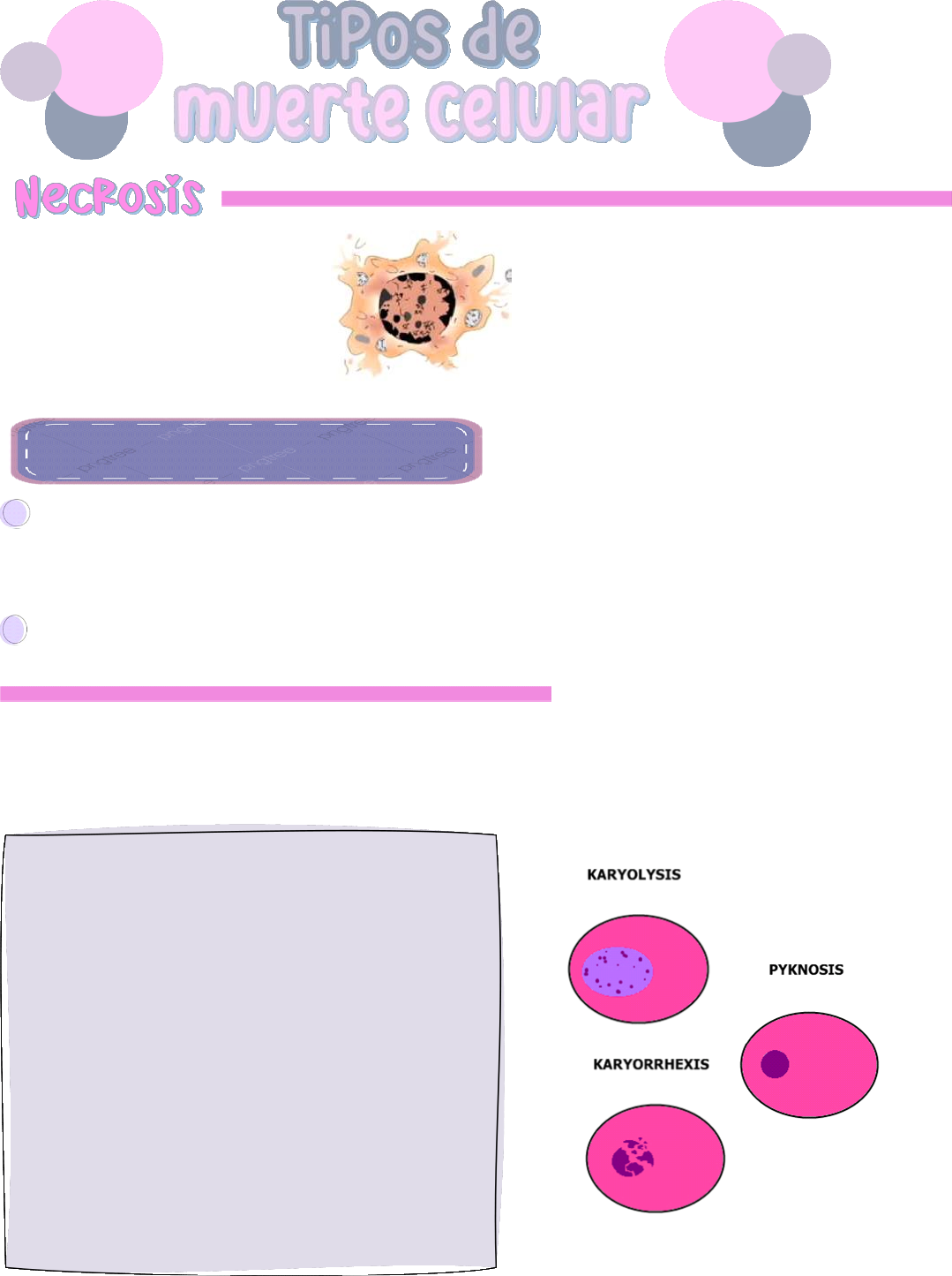 Tipos de muerte celular Desnaturalización de las proteínas ---> Da forma especial de necrosis (recibe el nombre de necrosis de coagulación. Toda necrosis es por coagulación excepto las del sistema nervioso central aunque a nivel cerebral si se puede presentar una necrosis de este tipo (es la excepción) Ejemplo, forma de necrosis de coagulación: Infarto de miocarditis Cuando el daño en las membranas es intenso, las enzimas salen de los lisosomas, penetran en el citoplasma y digieren la célula. Los contenidos celulares salen también a través de la membrana plasmática dañada y desencadenan una reacción en el huésped (inflamación). La necrosis es la vía principal de muerte celular en las lesiones más comunes, como las resultantes de isquemia, exposición a toxinas, diversas infecciones y traumatismos. Es un evento posterior a la muerte celular (4 a 6 horas después) Patrones morfológicos de la necrosis Necrosis de licuefacción ---> Característica mayormente del sistema nervioso central (Ejemplo: Acceso) Pus ---> células muertas, componente inflamatorio y bacteriano Gangrena ---> Ejemplo hipóxico. Presentación de necrosis Infectada: Húmeda✓ No infectada: Seca✓ Pancreatitis ---> ruptura ---> liberación de enzimas ---> de aquí lo importante es la lipasa que produce necrosis grasa Calcio atrapado en retículo endoplasmático y mitocondrias ---> cuando estos se rompen las células pueden calcificarse Destrucción de la membrana citoplasmática: cuando esto sucede se forman cuerpos de mielina (son fosfolípidos) estos son característicos de las células muertas. • Entra suficiente agua y la célula se hincha• En el núcleo pueden darse 3 eventos Cariolisis: disolución de la cromatina del núcleo en el jugo nuclear, que acaba de desaparecer diluida en el citoplasma. ○ Cariorrexis: o fragmentación del núcleo se produce porque el ADN se fractura en segmentos múltiples de aproximadamente 185 bp (pares de bases ○ Picnosis: o cariopicnosis es la condensación irreversible de la cromatina en el núcleo de una célula que experimenta necrosis o apoptosis. ○ • Cuando los lisosomas de llenan de agua se rompen y liberan enzimas hidrolíticas que se activan con el calcio y puede producirse la lisis de ADN u otras estructuras de la célula. • PATOLOGIA página 4 Ubiquitina ---> Se une a la parte de la proteína dañada, la aparta y desecha, el resto de la proteína sigue funcionando. La rozón de esto es que el retículo endoplasmático rugoso puede producir más fácil el trozo dañado desechado y reemplazarlo a producir toda la proteína. Ácido láctico ---> Trabaja el pH celular F.H.P 60 y 70 ---> ruptura ---> liberación de enzimas ---> de aquí lo importante es la lipasa que produce necrosis grasa En el corazón la causa de hipoxia generalmente es un trombo • P53, P63 y P73 ---> Tienen prácticamente la misma función. Cuando una célula carece de factores de crecimiento o cuando el ADN de la célula o las proteínas resultan dañados sin posibilidad de reparación la célula se mata a sí misma mediante este otro tipo de muerte. Es la forma del organismo para deshacerse de los elementos que están de más o dañados en el organismo. Heteólisis ---> Muerte de bacterias y células a la vez• Autolisis ---> La célula se autodestruye• Si entra una bacteria, se unen el fagosoma con el lisosoma y la destruyen La apoptosis se inicia por dos vías principales: -Vía mitocondrial (intrínseca) activada por la pérdida de las señales de supervivencia, las lesiones del ADN y la acumulación de proteínas mal plegadas (estrés del RE); asociada a la fuga de proteínas proapoptósicas de la membrana mitocondrial hacia el citoplasma, donde activan las caspasas; inhibida por los miembros antiapoptósicos de la familia Bel, que son inducidos por señales de supervivencia, incluidos los factores de crecimiento. -La vía del receptor de muerte (extrínseca) es responsable dela eliminación de los linfocitos autorreactivos y dela lesión por los LTC; se inicia cuando se unen los receptores de muerte (miembros dela familia del receptor de TNF) por los ligandos en las células adyacentes. Apoptosis PATOLOGIA página 5 Causas de apoptosis Isquemia• Radiación• Fármacos• Toxinas• Ejemplo: Ingestión de alcohol mata hepatocitos por apoptosis Dependiendo de la cantidad de oxígeno, el flujo sanguíneo y el órgano la célula se puede dirigir hacia la necrosis o hacia la apoptosis La radiación (quimioterapias) producen mutación de células ---> Si P53, P63 o P73 funcionan bien estas células serán destruidas por apoptosis La apoptosis es producto de un factor trófico en nuestro organismo Es un proceso individual de las células El cuerpo apoptótico se produce para que no se reconozca como célula extraña y no produzca un efecto inflamatorio La hipoxia y la isquemia agotan el ATP y provocan un fracasode muchas funciones dependientes de energía, que primero se asocian a una lesión reversible y, cuando no se corrigen, a necrosis. • En las lesiones por isquemia-reperfusión, la recuperación del flujo hacia un tejido isquémico agrava las lesiones porque aumenta la producción de ERO y por inflamación. • El estrés oxidativo es la acumulación de ERO, que pueden lesionar los lípidos, las proteínas y el ADN de las células; pueden asociarse a muchas causas iniciales. • El mal plegamiento de las proteínas agota proteínas esencialesy su acumulación dentro de las células conduce a la apoptosis. • La lesión del ADN (p. ej., mediante radiación) también puede inducir apoptosis si no se repara. • La inflamación se asocia a lesiones celulares por las acciones lesivas de los productos de los leucocitos inflamatorios • Dos vías menos frecuentes de muerte celular son la necroptosis (que como su propio nombre indica incluye rasgos tanto de necrosis como de apoptosis y se regula por unas vías de transmisión de señales concretas) y la piroptosis, q