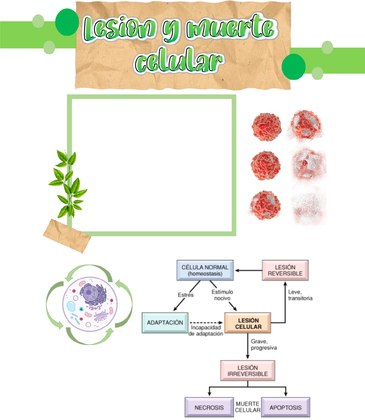 Lesión y muerte celular La lesión celular se produce cuando las células se someten a un estrés tan importante que no pueden adaptarse ya cuando se exponen a agentes con capacidad lesiva inherente o cuando presentan alteraciones intrínsecas Lesión celular reversible: En las fases precoces o formas leves de lesión, los cambios funcionales y morfológicos son reversibles si se elimina el estímulo lesivo. Ejemplo: tumefacción celular, cambio graso Lesión celular irreversible: Si persiste el estímulo tiene suficiente fuerza desde el comienzo, las células sufren una lesi0on irreversible y al final se produce la muerte celular PATOLOGIA página 2 Entre una célula y otra hay un espacio que las separa y sostiene (tejido de sostén o estroma) Hay fibras que ayudan a que no se colapse el contenido de la célula. Ejemplo: Merculina Desaparición de la célula por: Necrosis (inflamación y dolor) ---> Sino se amputa el sitio dañado puede llevar a la presencia de gangrena debido a que facilita la producción de bacterias) • Apoptosis• Ligamento de cooper ---> Es el encargado de la sujeción de la glándula mamaria. Se trata de una estructura formada por fibras de tejido conectivo que discurren de la fascia del músculo pectoral mayor a la parrilla costal. Procesos de adaptación del ser humano Hipertrofia (Crecimiento del músculo) Atrofia (Debilitamiento, encogimiento y pérdida de músculo con la edad o por la falta de uso Ejemplo: la mama de la mujer) Cuando la mitocondria no produce la cantidad de oxígeno necesaria se produce HIPOXIA. Cuando aumentan los solutos, más agua ingresa a la célula y aumenta su tamaño hasta que se produce la lisis celular Causas de la lesión celular: Radicales libres Son moléculas inestables elaboradas durante el metabolismo normal de las células (cambios químicos que ocurren en una célula). Los radicales libres a veces se acumulan en las células y dañan otras moléculas, como el ADN, los lípidos y las proteínas. Es posible que este daño aumente el riesgo de cáncer y otras enfermedades Privación de oxigeno• Agentes físicos• Agentes químicos y fármacos • Agentes infecciosos• Angiogénesis ---> Es la formación de vasos sanguíneos nuevos. PATOLOGIA página 3