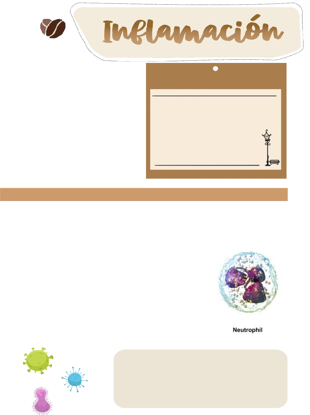 Inflamación Es una respuesta defensiva del huésped ante invasores extraños y tejido necrótico, aunque, por sí misma, también puede ser capaz de ocasionar lesiones tisulares. ⚫ Los principales componentes de la inflamación son una reacción vascular (salida de elementos formes (leucocitos y eritrocitos) a través del vaso) y una respuesta celular; ambas se activan gracias a mediadores derivados de proteínas plasmáticas y diversas células. ⚫ La evolución de la inflamación aguda puede ser eliminación del estímulo nocivo, seguida de una reducción de la reacción y reparación del tejido lesionado o de daño persistente con inflamación crónica. ⚫ Pasos de la respuesta inflamatoria (Las cinco R) 1) reconocimiento del agente lesivo 2) reclutamiento de los leucocitos 3) retirada del agente 4) regulación (control) de la respuesta 4) resolución (reparación). INFLAMACIÓN AGUDA Permite la Llegada rápida de leucocitos y proteínas plasmáticas al lugar de la lesión. Cuando llegan, los leucocitos eliminan los invasores e inician el proceso de digestión para liberarse de los tejidos necróticos La inflamación aguda tiene dos componentes fundamentales Cambios vasculares --> alteraciones en el calibre de los vasos (incrementan el flujo de sangre (vasodilatación) y cambios en la pared vascular (permiten la salida de la circulación de las proteínas plasmáticas (aumento de la permeabilidad vascular)). Acontecimientos celulares --> migración de los leucocitos desde la circulación y su acumulación en el foco de la lesión (reclutamiento celular), seguida de la activación de leucocitos, que les permite eliminar el agente lesivo. Los principales leucocitos en la inflamación aguda son los neutrófilos (leucocitos polimorfonucleares). Se da de forma abrupta, tiene 4 elementos característicos: Calor• Rubor• Dolor• Tumor (cambia por el termino tumefacción) • Estímulos para la inflamación aguda Infecciones (bacterianas, fúngicas, víricas, parasitarias) Traumatismos Necrosis tisular Cuerpos extraños Reacciones inmunitarias PATOLOGIA página 9 INFLAMACION Salpingitis ---> I. de las trompas de Falopio Colpitis ---> I. de la vagina Cerebritis ---> I. localizada en el cerebro Encefalitis ---> I. de todo el encéfalo Ooforitis ---> I. de los ovarios Orquitis ---> I. de los testículos Granulocitos de 3 tipos Neutrófilos (No se tiñen con hematoxilina eosina) • Eosinófilos (Se tiñen de rojo con hematoxilina eosina) • Basófilos (Se tiñen de azul con hematoxilina eosina) • Monocitos ---> Macrófagos Residentes (se mantienen quietos)a. Funcionalesb. • Linfocitos• Fibroblasto• Estos deben estar en contacto con la matriz extracelular (MEC) la cual constituyen. Aumento de eosinófilos --->Eosinofilia (alergias y parasitosis) Disminución de eosinófilos ---> Eosinopenia Aumento de neutrófilos ---> Neutrofilia Disminución de neutrófilos ---> Neutropenia (disminución de la funcionalidad de sus movimientos) El proceso inflamatorio se caracteriza por la salida del líquido al intersticio y por la salida de una parte de los elementos formes Después de un golpe ---> Vasoconstricción momentánea producida por las células cebadas que se rompen y liberan una proteína (histamina), luego de esto ocurre una vasodilatación) Concentración de proteína < 1012 ---> Trasudado Concentración de 1020 ---> Exudado Edema ---> Acumulación de líquido intravascular por fuera de los vasos Quemaduras ---> Producción de trombos Cuantificando la cantidad de proteínas podemos saber si hay un proceso inflamatorio >= 1020 (Si) < 1020 (NO) Diapédesis ---> Proceso de migración del neutrófilo hacia la bacteria que detecta PATOLOGIA página 10 MOLECULAS DE ADHESION Selectinas (endotelio), P selectinas (endotelio y plaquetas), L selectina (leucocitos)• Inmunoglobulinas I-CAM (molécula de adhesión intracelular, median interacciones heterofilias independientes de Ca2+ en células endoteliales) ○ V-CAM (no permite adhesión entre célula y célula sino de célula a membrana basal, median interacciones heterofilias independientes de Ca2+ en células endoteliales, macrófagos y células inmunitarias) ○ P-CAM (median interacciones heterofilias independientes de Ca2+ en células endoteliales, leucocitos y plaquetas) ○ N-CAM (median interacciones heterofilias independientes de Ca2+ en células nerviosas (gliales y neuronas) ○ • Integrinas ---> Son mediadoras de las interacciones célula-célula y célula-matriz• Óxido Nítrico (NO Células que lo producen ---> células del sistema nervioso (neuronas y macrófagos) Vasodilatador Acción de segundos ---> relaja el musculo liso Activación de las colagenasas por necesidad de romper la membrana basal Nicotinamida adenina dinucleótido fosfato (NADPH) ---> Forma oxidasa ---> que forma peróxido de hidrogeno Los neutrófilos producen su propia agua oxigenada para combatir las bacterias La unión de mieloperoxidasa y peróxido de hidrogeno es el mayor bactericida de nuestro organismo Neutrófilos producen engrosamiento del vaso En casos de emergencia el organismo a veces también envía neutrófilos inmaduros PATOLOGIA página 11 El proceso inflamatorio se caracteriza por la salida del líquido al intersticio y por la salida de una parte de los elementos formes Después de un golpe ---> Vasoconstricción momentánea producida por las células cebadas que se rompen y liberan una proteína (histamina), luego de esto ocurre una vasodilatación) Concentración de proteína < 1012 ---> Trasudado Concentración de 1020 ---> Exudado Edema ---> Acumulación de líquido intravascular por fuera de los vasos Quemaduras ---> Producción de trombos Cuantificando la cantidad de proteínas podemos saber si hay un proceso inflamatorio >= 1020 (Si) < 1020 (NO) Diapédesis ---> Proceso de migración del neutrófilo hacia la bacteria que detecta PATOLOGIA página 12 INFLAMACIÓN CRÓNICA Proceso prolongado que puede durar toda la vida, general