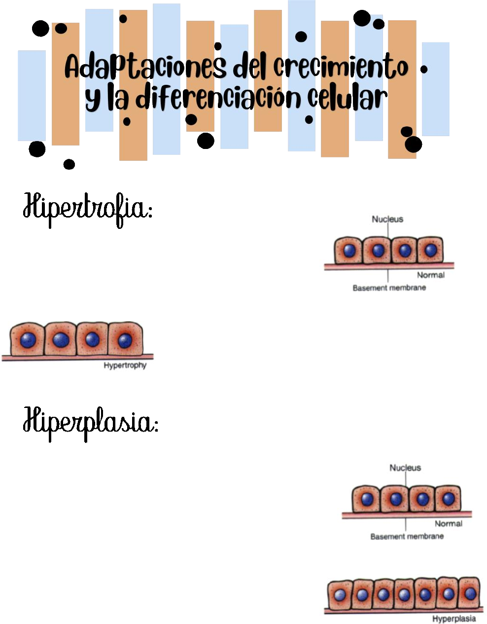 Adaptaciones del crecimiento y la diferenciación celular Mecanismo de adaptación reversible por el cual las células permiten una preparación para un nuevo trabajo. Se presenta con el aumento del tamaño de las células por ende el aumento del tamaño del órgano pero no aumenta el número de las células. La hipertrofia puede ser fisiológica o patológica, Es el aumento del número de células y por ende aumento del órgano en respuesta a las hormonas u otros factores de crecimiento; Se produce en tejidos cuyas células pueden dividirse o que contienen numerosas células madre tisulares. Hiperplasia fisiológica La hiperplasia fisiológica se puede clasificar en: 1) hiperplasia hormonal, que aumenta la capacidad funcional de un tejido que lo necesita (Ejemplo: aumento de las mamas) 2) hiperplasia compensadora, que aumenta la masa tisular tras una lesión o resección parcial. Hiperplasia patológica La mayor parte de las hiperplasias patológicas se deben a la actividad de un exceso de hormonas o factores de crecimiento sobre las células diana. La hiperplasia endometrial es un ejemplo de hiperplasia anormal inducida por hormonas. Es inducida por factores de crecimiento producidos en respuesta a un estrés mecánico u otros estímulos; afecta a tejidos que no se pueden dividir. El estímulo más habitual para la hipertrofia muscular es el aumento del esfuerzo. Ejemplo: El aumento del grosor de los ventrículos del corazón, lo que representa un mayor esfuerzo para la eyección. PATOLOGIA página 7 Forma de la célula para defenderse. Disminución de los elementos (retículo endoplasmático, mitocondrias, etc.) por lo que la célula disminuye su tamaño. Se asocia a una menor síntesis de las moléculas sintéticas celulares y un aumento de la degradación de los orgánulos celulares y la autofagia. Puede ser fisiológica o patológica. La atrofia fisiológica Es frecuente durante el desarrollo normal. Algunas estructuras embrionarias, como el notocordio o el conducto tirogloso, experimentan atrofia durante el desarrollo fetal. El tamaño del útero disminuye al poco tiempo del parto y esto es una forma de atrofia fisiológica. La atrofia patológica Depende de la causa de base y puede ser local o generalizada. Las causas frecuentes de atrofia son: Reducción de la carga de trabajo (atrofia por desuso).• Pérdida de la inervación (atrofia por denervación).• Reducción de la irrigación. (isquemia) • Nutrición inadecuada• Pérdida de la estimulación endocrina• Presión• Atrofia Es un cambio reversible en el que una célula diferenciada (epitelial o mesenquimal) se sustituye por otro tipo celular. Puede ser una sustitución adaptativa de las células que son sensibles al estrés por otros tipos celulares que resisten mejor este entorno adverso. Ejemplo: La metaplasia epitelial más frecuente es la cilíndrica a escamosa, se da la vía respiratoria en respuesta a la irritación crónica. En los fumadores habituales, el epitelio cilíndrico ciliado normal de la tráquea y los bronquios se sustituye por un epitelio escamoso estratificado. En la vagina (epitelio escamoso queratinizante) ---> Produce glucógeno, las bacterias en vagina toman este glucógeno y lo vuelven ácido láctico causando un pH de 4.5 En la cavidad endometrial ---> Se produce moco gracias a las glándulas endocervicales que facilitan la entrada de los espermatozoides Dihidrotestosterona ---> 10 veces mayor estimulo que la testosterona en la próstata Fibroplasia ---> Se refiere al proceso de producción de colágeno y al aumento de la fuerza tensil de la cicatriz Cirrosis ---> Proceso cicatricial del hígado NOTAS PATOLOGIA página 8