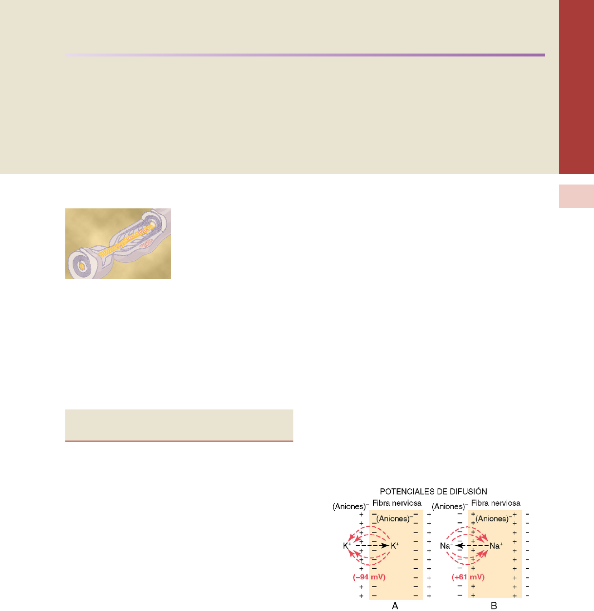 U N ID A D II 57© 2011. Elsevier España, S.L. Reservados todos los derechos CApítUlo 5 Potenciales de membrana y potenciales de acción Hay potenciales eléctricos a través de las membranas de prácticamente todas las célu las del cuerpo. Además, algu nas células, como las células nerviosas y musculares, son capaces de generar impulsos electroquímicos rápidamente cambiantes en sus membranas, y estos impulsos se utilizan para transmitir señales a través de las membranas de los ner vios y de los músculos. En otros tipos de células, como las células glandulares, los macrófagos y las células ciliadas, los cam bios locales de los potenciales de membrana también activan muchas de las funciones de las células. Este análisis se refiere a los potenciales de membrana que se generan tanto en reposo como durante la acción en las células nerviosas y musculares. Física básica de los potenciales de membrana Potenciales de membrana provocados por difusión «Potencial de difusión» producido por una difere ncia de concentración iónica a los dos lados de la membrana. En la figura 51A la concentración de potasio es grande dentro de la membrana de una fibra nerviosa, pero muy baja fuera de la misma. Consideremos que en este caso la membrana es permeable a los iones potasio, pero no a ningún otro ion. Debido al gran gradiente de concentración de pota sio desde el interior hacia el exterior hay una intensa tendencia a que cantidades adicionales de iones potasio difundan hacia fuera a través de la membrana. A medida que lo hacen trans portan cargas eléctricas positivas hacia el exterior, generando de esta manera electropositividad fuera de la membrana y electronegatividad en el interior debido a los aniones negati vos que permanecen detrás y que no difunden hacia fuera con el potasio. En un plazo de aproximadamente 1 ms la diferencia de potencial entre el interior y el exterior, denominada poten cial de difusión, se hace lo suficientemente grande como para bloquear la difusión adicional neta de potasio hacia el exte rior, a pesar del elevado gradiente de concentración iónica de potasio. En la fibra nerviosa normal del mamífero la diferen cia de potencial necesaria es de aproximadamente 94 mV, con negatividad en el interior de la membrana de la fibra. La figura 51B muestra el mismo fenómeno que la figu ra 51A, pero esta vez con una concentración elevada de iones sodio fuera de la membrana y una concentración baja de sodio dentro. Estos iones también tienen carga positiva. Esta vez la membrana es muy permeable a los iones sodio, aunque es impermeable a todos los demás iones. La difusión de los iones sodio de carga positiva hacia el interior crea un potencial de membrana de polaridad opuesta al de la figura 51A, con nega tividad en el exterior y positividad en el interior. Una vez más el potencial de membrana se hace lo suficientemente elevado en un plazo de milisegundos como para bloquear la ulterior difusión neta de iones sodio hacia el interior; sin embargo, esta vez, en la fibra nerviosa del mamífero, el potencial es de aproxi madamente 61 mV positivos en el interior de la fibra. Así, en las dos partes de la figura 51 vemos que una diferencia de concentración de iones a través de una mem brana puede, en condiciones adecuadas, crear un potencial de membrana. Más adelante en este capítulo mostramos que muchos de los rápidos cambios de los potenciales de mem brana que se observan durante la transmisión de los impul sos nerviosos y musculares se deben a la aparición de estos potenciales de difusión rápidamente cambiantes. Figura 5-1 A. Establecimiento de un potencial de «difusión» a través de la membrana de una fibra nerviosa, producido por la difu- sión de iones potasio desde el interior de la célula hacia el exte- rior a través de una membrana que es permeable selectivamente sólo al potasio. w Establecimiento de un «potencial de difusión» cuando la membrana de la fibra nerviosa sólo es permeable a los iones sodio. Obsérvese que el potencial de la membrana interna es negativo cuando difunden los iones potasio y positivo cuando difunden los iones sodio debido a los gradientes de concentración opuestos de estos dos iones. Unidad II Fisiología de la membrana, el nervio y el músculo 58 Relación del potencial de difusión con la diferen cia de concentración: potencial de Nernst. El nivel del potencial de difusión a través de una membrana que se opone exactamente a la difusión neta de un ion particular a través de la membrana se denomina potencial de Nernst para ese ion, un término que se introdujo en el capítulo 4. La magnitud de este potencial de Nernst viene determinada por el cociente de las concentraciones de ese ion específico en los dos lados de la membrana. Cuanto mayor es este cociente, mayor es la tendencia del ion a difundir en una dirección y, por tanto, mayor será el potencial de Nernst necesario para impedir la difusión neta adicional. Se puede utilizar la siguiente ecua ción, denominada ecuación de Nernst, para calcular el poten cial de Nernst para cualquier ion univalente a la temperatura corporal normal (37 °C): FEM (milivoltios): 61 × log Concentración interior _______________________ Concentración exterior donde FEM es la fuerza electromotriz. Cuando se utiliza esta fórmula habitualmente se asume que el potencial del líquido extracelular que está fuera de la membrana se mantiene a un nivel de potencial cero, y que el potencial de Nernst es el potencial que está en el interior de la membrana. Además, el signo del potencial es positivo (+) si el ion que difunde desde el interior hacia el exterior es un ion negativo, y es negativo (–) si el ion es positivo. Así, cuando la concentración de iones potasio positivos en el interior es 10 veces mayor que la del exterior, el logaritmo de 10 es 1, de modo que se calcula que el potencial de Nernst es de –61 mV en el interior de la membrana. Cálculo del potenc