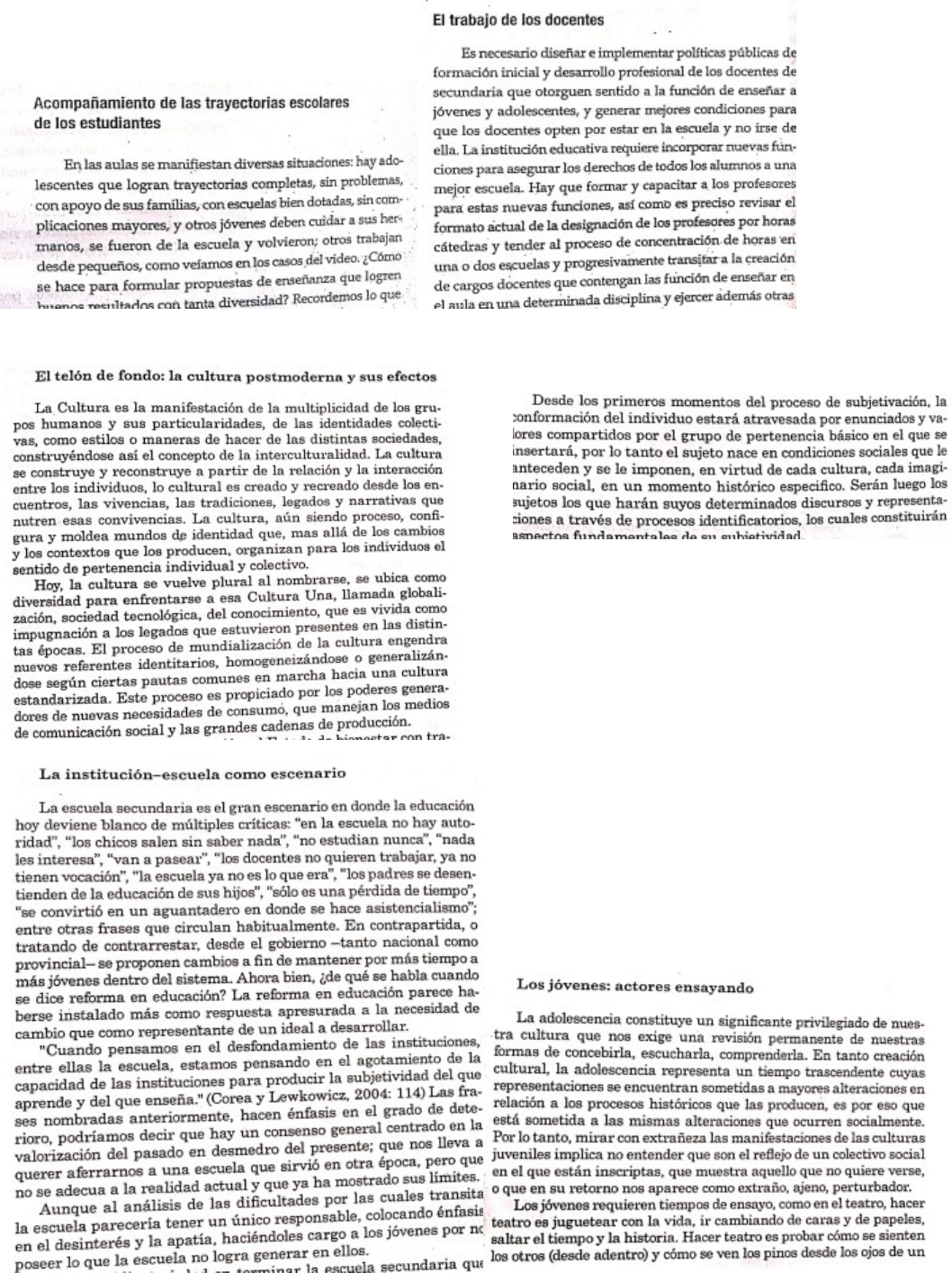 4.1 la escuela secundaria: entre el grito y el silencio MAria ines abriles de wollmer Juventud (es) en plural, pliegues y despliegues entre culturas, Silvina Carmona Ana maría vilscano Si la educacion se constituye como unos de los emncanismos sociales por excelencia que posibilitan la transmision de la herencia cultural y el fortalecimiento de los procesos filiatorios que identifican a un sujeto como semejante “que formas adoptariaestos procesos en el caso de los jovenes que no se incoporan a la escuela secundara o dejen antes de concluirla”. La prensencia de un rechazo a la propuesta, por parte de algunos jovenes, se instala al menos con esta parte de la oferta filiatoria que significaria la educacion secundaria, ya que en la mayoria de kis casos han concluido con los estuidos primarios y recibidos como contraparte de el elgado social. 4.2 Pineau Pablo Política socioeducativa y formación docente Históricamente en las sociedades occidentales, la infancia y la juventud fueron etapas signadas por una moratoria social que permitía a esos sujetos retrasar su participación en la totalidad de las experiencias de la vida social -el trabajo, la obtención de recursos, la reproducción, el cuidado de otros- para dedicar ese periodo a su preparación y formación para la vida adulta. Niños y jóvenes debían educarse para volverse hombres y mujeres en el futuro, la adultez era el resultado de un proceso educativo que los habilita para el ingreso pleno a la vida social. Los alumnos como sujetos de derechos Poner el foco en comprender la educación como derecho implica tener como punto de partida la comprensión del otro como sujeto de derechos. El otro-alumno no es un sujeto incompleto, un futuro peligro social o un portador de intereses, sino alguien que posee ciertos derechos y cuenta con derechos para ejercerlos, ampliarlos y sumar nuevos. Entendemos entonces que la función de la educación es brindar herramientas, experiencias, saberes estrategias, etc para llevar este plan a cabo. Recuperar los derechos de los sujetos nos lleva a revisar algunas posiciones pedagógicas vigentes que ponen el centro en los intereses de los sujetos como garantes de la construcción de mejores sociedades. Creemos que pasar de una educacion basada en los intereses del alumno a otra basada en los derechos del alumno amplia el tamaño de la operación pedagogica en la construccion de sociedades mas justas. Por eso, la pregunta principal para ubicar a los sujetos en el centro de la propuesta no es “que le interesa aprender” sino “que tiene derecho a aprender”. Enseñarles solo lo que la les interesa es dejarlos en un estado de dependencia. El interes debe ser, en el mejor de los casos, el punto de llegado y no el punto de partida de nuestra tarea, la idea no es hallar sino generar intereses. 4.4 El vinculo educativo – violeta nuñez El triangulo herbartiano de trabajo educativo servirá a propósitos de dar cuenta de como el vinculo educativa se compone, como funciona y cuales son los roles funcionales que allí participan. El primer elemento a considerar es el sujeto de la educación, el cual debe disponerse al arduo trabajo civilizatorio. Esto es, debe consentir o admitir una cierta violencia o coacción pedagógica: ha de separarse de lo instintual, limitar las apetencias, para canalizarlos en dirección y maneras que cada cultura establece. El segundo elemento corresponde al agente de la educación. Representante del mundo, de las generaciones adultas, su responsabilidad consiste en transmitir elementos de los patrimonios culturales a las nuevas generaciones, a cada uno de los sujetos con los que trabaja. Es a quien corresponder sostener el acto pedagógico, para que algo del orden de la educación pueda darse. El tercer elemento lo constituyen los bienes culturales que son seleccionadas para su transmisión, según las premisas de la época. Se trata entonces de los contenidos de la educación, cuya transmisión garantiza el acceso de los recién llegados a la cultura en un sentido que es posible articular a los dos elementos anteriores. En efecto, este tercer elemento es lo que media entre sujeto y agente, une, precisamente en la medida que separa.