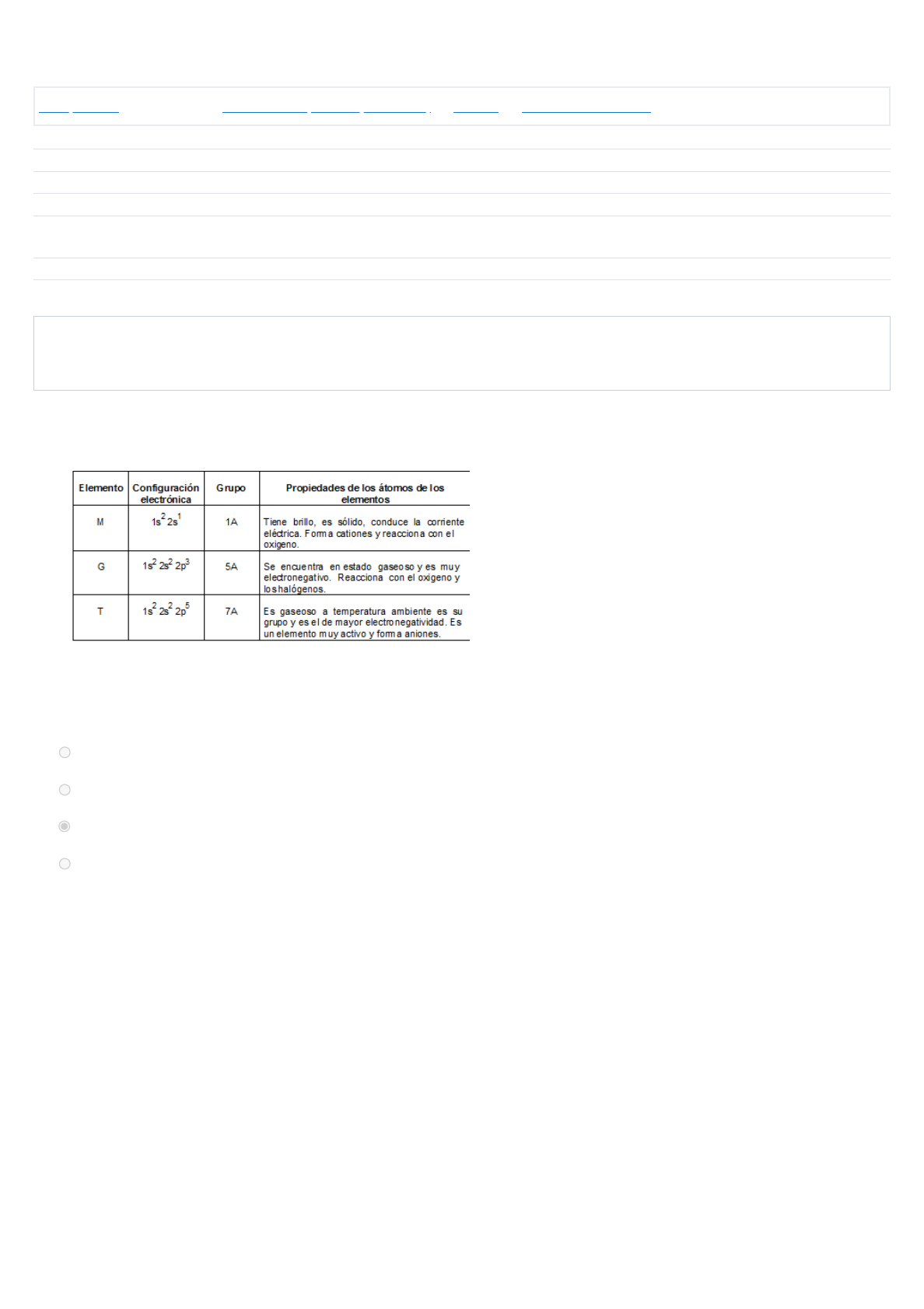 Área personal / Mis cursos / Química 2021 (Práctica y Exámenes) / General / EXAMEN PRE-GLOBAL Comenzado el miércoles, 23 de junio de 2021, 14:05 Estado Finalizado Finalizado en miércoles, 23 de junio de 2021, 14:15 Tiempo empleado 10 minutos 22 segundos Puntos 130,00/320,00 Calificación 40,63 de 100,00 Pregunta 1 Incorrecta Puntúa 0,00 sobre 15,00 En la siguiente tabla, se muestra la configuración electrónica, el grupo en la tabla periódica y algunas propiedades de tres elementos, que se han simbolizado como M, G y T. El número del grupo indica el número de electrones de valencia. De acuerdo con la información anterior de la tabla, un catión del elemento M se puede representar como M y su configuración electrónica es 1s . La configuración electrónica más probable para el anión J del elemento J con Z = 17 es: Seleccione una: a. 1s 2s 2p 3s 3p 4s b. 1s 2s 2p 3s 3p 4s c. 1s 2s 2p 3s 3p d. 1s 2s 2p 3s 3p +1 2 -1 2 2 6 2 6 1 2 2 6 2 6 2 2 2 6 2 5 2 2 6 2 6 Respuesta incorrecta. La respuesta correcta es: 1s 2s 2p 3s 3p2 2 6 2 6 https://www.campusvirtual.frm.utn.edu.ar/my/ https://www.campusvirtual.frm.utn.edu.ar/course/view.php?id=1474 https://www.campusvirtual.frm.utn.edu.ar/course/view.php?id=1474§ion=0 https://www.campusvirtual.frm.utn.edu.ar/mod/quiz/view.php?id=91975 Pregunta 2 Correcta Puntúa 10,00 sobre 10,00 Pregunta 3 Incorrecta Puntúa 0,00 sobre 10,00 ¿Cuál de los siguientes compuestos tiene una masa molecular igual a 98? Las masas atómicas de diferentes elementos son: S = 32; Cl = 35,5; Ag = 108; Au = 197; O = 16; H = 1. Seleccione una: a. Au O b. AgCl c. H SO Bien. d. Cl O 2 2 4 2 3 Respuesta correcta La respuesta correcta es: H SO2 4 Teniendo en cuenta que el punto de ebullición es una propiedad intensiva, al graficar el punto de ebullición (Tb) de diferentes masa de un líquido, la gráfica que se obtiene es: Seleccione una: a. A b. D c. C d. B Respuesta incorrecta. La respuesta correcta es: A Pregunta 4 Correcta Puntúa 10,00 sobre 10,00 Pregunta 5 Correcta Puntúa 15,00 sobre 15,00 La fórmula HBrO corresponde a: a. Ácido bromoso b. Bromuro de hidrógeno c. Ácido brómico d. Ácido perbrómico e. Ácido bromhídrico 3 Respuesta correcta La respuesta correcta es: Ácido brómico De acuerdo con la ecuación representada, es válido afirmar que Seleccione una: a. se conservó el número de moles. b. aumentó el número de moles. c. aumentó el número de átomos de cada elemento. d. se conservó la cantidad de materia. Bien. Respuesta correcta La respuesta correcta es: se conservó la cantidad de materia. Pregunta 6 Correcta Puntúa 15,00 sobre 15,00 Pregunta 7 Correcta Puntúa 20,00 sobre 20,00 Marque la opción que indique la geometría molecular, geometría electrónica y polaridad de la molécula de SO Seleccione una: a. Geometría molecular: Lineal Geometría electrónica: Trigonal plana Molécula polar b. Geometría molecular: Tetraédrica Geometría electrónica: Lineal Molécula polar c. Geometría molecular: Trigonal plana Geometría electrónica: Trigonal plana Molécula no polar d. Ninguna de las anteriores e. Geometría molecular: Lineal Geometría electrónica: Tetraédrica Molécula polar 3 Respuesta correcta La respuesta correcta es: Geometría molecular: Trigonal plana Geometría electrónica: Trigonal plana Molécula no polar Bajo condiciones adecuadas de concentración de iones calcio y de iones carbonato en la naturaleza se logra la formación del carbonato de calcio, CaCO , como parte del ciclo del carbono. Estos carbonatos al hacerlos reaccionar con un ácido se descomponen liberando CO La cantidad de CO recogido se almacena a condiciones normales en un recipiente de volumen constante. Si el recipiente se lleva a una temperatura de 25°C y a una presión de 1 atm, la cantidad de gas: Seleccione una: a. permanece constante porque la masa no depende de la temperatura y la presión. Bien. b. aumenta porque aumenta la temperatura y disminuye la presión. c. disminuye porque disminuye la temperatura y aumenta la presión. d. permanece constante porque aumentan la temperatura y presión. 3 2. 2 Respuesta correcta La respuesta correcta es: permanece constante porque la masa no depende de la temperatura y la presión. Pregunta 8 Correcta Puntúa 15,00 sobre 15,00 Pregunta 9 Incorrecta Puntúa 0,00 sobre 20,00 A 20°C, un recipiente contiene un gas seco X. En el siguiente dibujo se muestra el volumen del gas a diferentes presiones. La gráfica que mejor describe la variación del volumen cuando cambia la presión es Seleccione una: a. B. b. D. Bien. c. C. d. A. Respuesta correcta La respuesta correcta es: D. Si una mezcla gaseosa está formada por masas idénticas de helio y monóxido de carbono, ¿Cómo serán sus presiones parciales? a. Iguales. b. La del helio será mayor por contener un mayor número de moléculas de He2. c. La del helio será mayor por contener un mayor número de partículas. d. La del CO será mayor por ser más grande su molécula. Respuesta incorrecta. La respuesta correcta es: La del helio será mayor por contener un mayor número de partículas. Pregunta 10 Correcta Puntúa 20,00 sobre 20,00 Pregunta 11 Incorrecta Puntúa 0,00 sobre 15,00 Determine aplicando la Ley de Hess la ΔH de reacción de la siguiente: Cl (g) + C H (g) →C H Cl (L) Sabiendo que: 4HCl (g) + O (g) → 2Cl (g) + 2H O (L) ΔH= -202,4 kJ/mol 2HCl (g) + C H (g) +(1/2) O (g) →C H Cl (L) +H O (L) ΔH=-318,7 kJ/mol Seleccione una: a. -217,5 kJ/mol b. -108,75kJ/mol c. -521,1 kJ/mol d. -116,3kJ/mol 2 2 4 2 4 2 2 2 2 2 4 2 2 4 2 2 Respuesta correcta La respuesta correcta es: -217,5 kJ/mol Respecto de las propiedades de los líquidos y a los cambios de fases de los mismos, se puede asegurar que: (una sola respuesta es correcta). Seleccione una: a. Ninguna respuesta anterior es correcta b. El punto de ebullición normal de un líquido aumenta si aumenta la presión exterior. c. La presión de vapor de un líquido aumenta con la temperatura. d. El a