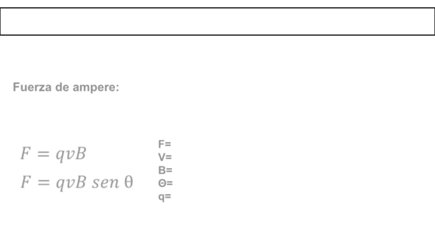 Fuerzas sobre cargas eléctricas en movimiento dentro de campos magnéticos Todo conductor por el cual circula una corriente eléctrica esta rodeada de un campo magnético Fuerza de ampere: Cuando un electrón en movimiento en movimiento con su propio campo magnético penetra en forma perpendicular dentro de otro campo producido por otro imán o una corriente eléctrica, los campos magnéticos interactúan entre sí. 𝐹 = 𝑞𝑣𝐵 𝐹 = 𝑞𝑣𝐵 𝑠𝑒𝑛 θ F= Fuerza recibida por una partícula cargada en movimiento, (N) V= velocidad que lleva la carga (m/s) B= inducción magnética del campo (T) Θ= angulo q= Carga em movimiento, medido en coulombs