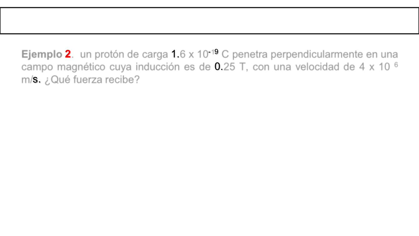 Fuerzas sobre cargas eléctricas en movimiento dentro de campos magnéticos Ejemplo 2. un protón de carga 1.6 x 10-19 C penetra perpendicularmente en una campo magnético cuya inducción es de 0.25 T, con una velocidad de 4 x 10 6 m/s. ¿Qué fuerza recibe?