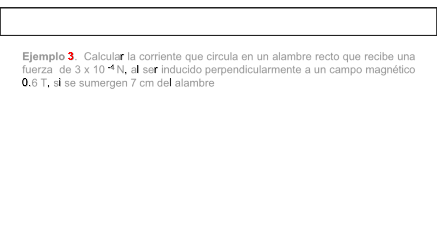 Fuerzas sobre cargas eléctricas en movimiento dentro de campos magnéticos Ejemplo 3. Calcular la corriente que circula en un alambre recto que recibe una fuerza de 3 x 10 -4 N, al ser inducido perpendicularmente a un campo magnético 0.6 T, si se sumergen 7 cm del alambre