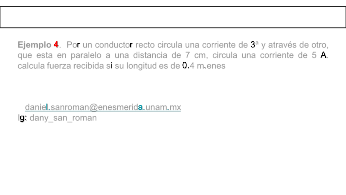 Ejemplo 4. Por un conductor recto circula una corriente de 3ª y através de otro, que esta en paralelo a una distancia de 7 cm, circula una corriente de 5 A. calcula fuerza recibida si su longitud es de 0.4 m.enes daniel.sanroman@enesmerida.unam.mx Ig: dany_san_roman Fuerzas sobre cargas eléctricas en movimiento dentro de campos magnéticos mailto:daniel.sanroman@enesmerida.unam.mx