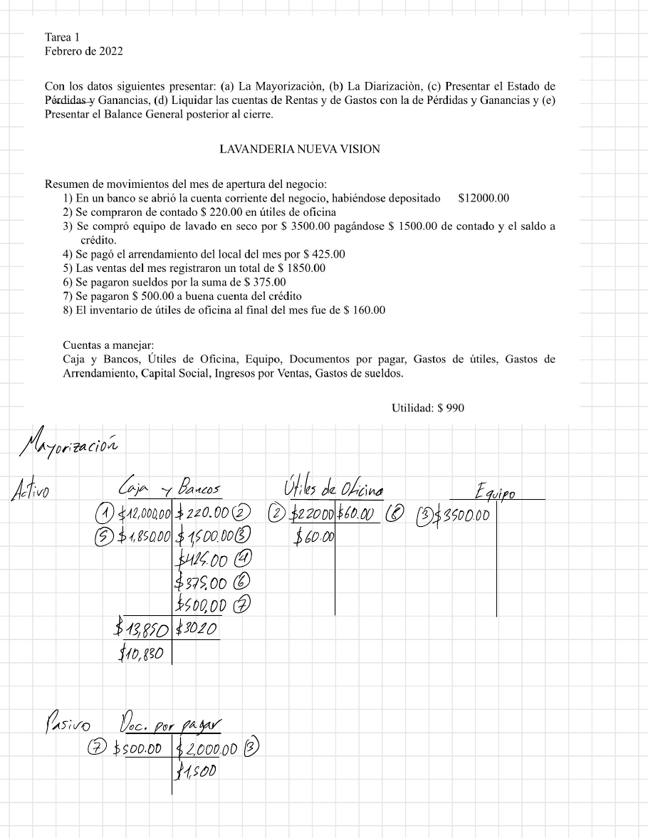 - Mayorización Activo Lain y Bancos útiles de Oficina Equipo~ ① 512,000.005220.00 & +220.00+60.000 8+3500.00 ⑤+1,850.00 f 1,500.00 ↑60.00& +425.00 -375000 & ↓500.00 & 13,85055020 +10,830 Parivo Poc. por pagar ⑦ 5500.00 f2000.00 BI11,500 artos de Arrendamientol Capital Social 4↓12,000.00 ④ +423.00 F42S Ingresor & Gastor de roldor bartosdoútiles ⑨ tbVsO 375.004975.0088 + 60.00 60.00S Pérolidar y Sanancian UtilidadNta& ⑩ thes 41,850 5990⑭ ⑪ 5375 ⑫ if 60 o 860 +1856 ⑭ 49904990 Pinizacion Debe Haber 1 Apertura de cuenta bancaria del Negocio Laja Y Bancor &12,000.00 CapitalSocial ↑12,000,00 2 Compra de útiles útiles ↑220.00 Caja y Bancor ↓220,00 3 Compra de Equipo Equipo 43,500.00 Laja Y Bancor ↓1,500.00 Documentos ↓2,000.00 por pagar 4 Pago de Arrenolamiento Gartos de Arrendamiento +425.00 Caja y Bancos ↓yes.00 S Ventas de Mer Registradas Laga y Bancor #1,850.00 Ingresos por Ventas +1,850.00 6 Pago de Sueldos Gartos de Sueldos ↓375.00 Caja yBancos &375,00 7Pago de Crédito Documentos por pagar +500.00 laja y Bancor ↑500.00 8 Inventario final de Utiler Gartor de útiler ↓60.00 útiles 4 60.00 Sumas Igrales 418,950.00718,930,00 LAVANDERIA_NUEVA VISION ESTAPO DEPERPIDAYGANANCIA Del mes de febrero del 2022 Ingres por Votas 51,850 menos! Gartos de Sueldor ↓375 gartos de Arrendamiento ↓425 Gastos de utiles ↓60 4860 Utilidad Nota 1990 LAVANDERIANUEVA VISION BALANCE GENERAL Al 31 de Enero de 2022 ACTIvos PASIVOS Caja I 10,830 Pocumentor por Pagur ↓1,500 Utiles 4 160 Total Parivor 41,500 Equipos & -,500 TotalActivos o 14,490 CAPITAL CapitalSocial ↓12,000 UtilidadNota & 440 Capitalcontable & 12,990 fuma Pasivoy ↓14,498 Capital Mayorizació Activos Laia Materiales Equipo +5400 5350.000 4600532S⑯ +3200 ⑥+3,600 +2000.002 5275 ③3,100 ↑140.00 56300 ↑250.000 19000 +2740 *6260 Parivo Cuentas por pagar Pocumentopor Pagar 53,000 82 52000 +3,100 ↓1,100 I Cartaal capital social Garturdofreldor Ingresos por trabajo+620004390.00 43,600 Garto de Materiales Motivo defandor ⑤4140.00 ⑦$250.00 ⑥ +325 Perdidas y ganancias Utilidad Nota +350 53,600 ↓2,785 -148 +325 +81553,600 +2,78552,785 &inigattr Debe Haber 1 Pago de Suddos Garto defueldor & 350.00 Laja & 350.00 2 Pago a Acrosdores Cuentas por pagar ↑2000.00 Caja ↓2000.00 3 Compra de Equipo Equipo ↓3,100.00 Cuentas por Pagar ↑3,100.00 A Recepción de Pagor Caja ↑3,600.00 Ingresos por trabajo ↓ 3,600.00 S SI Garto de Materiales ↓325.00 Ia pagaron materiales3arto de Materiales ↓140.00Caja ↓140.006 Inventario final del Mer Materiale & 325.00 7Retiro de fondor Retiro de Fondor ↓250.00 Laja ↓esO Sumas Igrales ↓9,765.00 ↑9,765.00 REMONTADORACENTIAL EstAPO PE peirpidas y ganancias del mes de Febrero del 2022 Ingresos por trabajo ↓3,600 monor: Gartos deSueldor 4340 Gartos de Materialor ↑140 +3255815 UtilidadNeta 52,785 REMONTADORACENTIAL BALANCEGENERAL Al of de Junio del 2022 ACTIVOS PASIVOS Laja ↓6260 Pocumentos por pagar ↓3000 Materiales ↓279 Cuentar porpagar 41100 Equipo ↓5300 Total Parivor ↑ 4,100 Total Activos ↓12,835 Capital CapitalSocial ↓6200 Utilidad Neta ↓2785 Retiro de Fondos ↑ (250 CapitalContable 48735 Fuma ParivoyCapital (19835 Activo Caja Luontas por Lobrar Equipo Edificios 42400 ↑1000 +1500+4308 +11,200 ↓10,000 2 4840043000③ $ 1070 ⑥443015000 ⑦ 17000 41600 55009 Proyector +1800 Po ④15000 119230412900 +5330 Parivo Cuentar porlagar Poc. por Pagar- ③3000 59,100 ⑪ ↑1000 412,000 43200⑧ ↓10,000 ↑3000 +12,300 ↓1000 522,000 ↓9,300 ↑21,000 Capital Capital Cine Vanguardia Ingresos por Entradas Gartor de Suddor +4000 NH1,400 584002 84 1600 +3400/ E ↓7,0000 041800 Gartor dealquiler de Policular Gartor Generales ⑧ 3200 43200 91500 tsoo ⑭ Resultados Perdidar y Ganancias Utilidad Nota ⑫ ↑3400 I ↓15,400 ⑮8300 ⑮ I 3200 M 5500 ↓7100 ↓15,400 ⑮ 58,300 ↓8,300 Piangacton Debe Haber 1 Pago de documentos Las documentos por Pagar & 1000 I 1000 2 Registro de Entradas laikIngresos por Entradar ↑8400 ↓8400 3 To pagaron crentar por pagar Cuentas por lagar ↓3000 Caja *3000 A Se compre un proyector Proyector ↓15000I & Laja ~ - I 5,000 IDocumentos porpagar 5)10,000S Pago de SuddosGartor de Tueldos ↑1600Caja ↓16006 Se recuperómonto de Cuentas por lobrar Cajomentar por Cobrar ↓430 4 430 7 I entradas durante la segunda quincena del mar La Ingravor por En tradas ↓ 7000 ↑7000 8 Alquiler de Policulas Gartos de Alquiler dePoliculas 5320043200Cuentas por Pager 9 Sopagóla dectricidad Gartor Generales &500i Caja $500 I10 Pagar de Fueldos de las Segunda Quincena Gastos de Suddor ↓1800 Laja ↓1800 Sumas Igrales ↓41,930 ↓1,930 CINE VANGUARDIA Estado depérdidas y ganancias al 31 de octubre ald2022 Ingresos por Entradas ↓8400 47000 menor. Gartor de Suddor ↓3400 Gartos deAlquiler de Policulas -3200 Gartos Generales ↑500 +7100 Utilidad Nota 4 8,300 CINE VANGUARDIA BALANCE GENERAL al 31 de octubre del 2022 ACTIVON pasivos Caja ↓5,330 Cuentas por Pagar &9300 Cuentas por lobrar ↓1,070 & 21,000 Equipo ↑ 11,200 Pormatorpor Page er 530,300 Edificio ↓10,000 Proyector ↓19,000 CAPITAL Total Activos 42,600 Capital Social 44000 UtilidadNota ↑8,300 Capital Contable +12,300 fumariode +42,600
