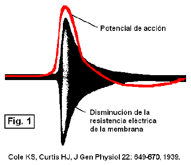 Excitabilidad y propagación del impulso nervioso Dr. Fernando D. Saraví Las respuestas pasivas de la membrana a estímulos eléctricos débiles decaen con el tiempo y la distancia, por lo cual no son suficientes para la propagación de señales a lo largo de un axón, que en el humano adulto puede llegar a tener 1 m de longitud. Un impulso propagado, o potencial de acción, es también una señal eléctrica, pero cuali y cuantitativamente diferente. El potencial de acción tiene una amplitud de decenas de milivoltios y es un fenómeno discreto que no puede sumarse temporal ni espacialmente, sino que se desplaza manteniendo su amplitud, con una velocidad del orden de m/s. En el organismo, el potencial de acción se inicia por fenómenos electrotónicos consecutivos a la activación de sinapsis o de receptores sensoriales. Experimentalmente, es común provocar un potencial de acción mediante un estímulo eléctrico. En cada axón, el potencial de acción producido por cualquiera de las formas mencionadas es igual en amplitud y velocidad de propagación. Dicho de otro modo, las propiedades del potencial de acción son independientes del estímulo que lo produjo, y su amplitud responde a la llamada ley de todo o nada: Se produce o no se produce. El potencial de acción, consiste en una rápida despolarización con inversión de la polaridad, debida a una abrupta pero breve reducción de la resistencia eléctrica de la membrana. En la Fig. 1 se muestra el registro de un potencial de acción y de una onda de alta frecuencia con la que se mide simultáneamente la impedancia de la membrana. El aumento de la amplitud de esta última onda durante el potencial de acción es proporcional a la disminución de la resistencia, o dicho de otro modo, un aumento de la conductancia de la membrana. El aumento de conductancia se debe a la apertura secuencial de canales de Na+ y de K+ operados por potencial. EXCITACIÓN Se denomina excitabilidad a la propiedad de las neuronas, fibras musculares y algunas células neuroendocrinas de responder a un estímulo con potencial de acción. En la membrana en reposo, la conductancia al K+ (GK) es decenas de veces mayor que para el Na+ (GNa) Por esta razón, el potencial de membrana VM es próximo al potencial de equilibrio electroquímico del K+ (EK). La diferencia entre VM y EK proporciona una fuerza electromotriz (fem) que impulsa la salida de este ión. El ENa es positivo y lejano a VM, por lo cual una fem elevada impulsa el ingreso de Na+. En reposo, la corriente de salida de K+ es igual en magnitud a la corriente de ingreso de Na+ (ver POTENCIAL DE REPOSO). Un aumento rápido e intenso de la GNa permite un mayor ingreso de Na+ según su gradiente electroquímico, que supera transitoriamente el egreso de K+. Como consecuencia de esto VM se desplaza hacia el potencial de equilibrio del Na+ (ENa). Como se dijo, existen varias formas de iniciar un potencial de acción. No obstante, todas tienen en común la propiedad de causar una despolarización pasiva de la membrana. Los estímulos hiperpolarizantes no causan potenciales de acción, sin importar su amplitud (Fig. 2). Esto se debe a que los canales de Na+ responsables del aumento de GNa se abren por la despolarización de la membrana. Para que se despolarice la membrana es necesaria una corriente capacitiva que descargue la capacitancia de la membrana, como se explicó en PROPIEDADES PASIVAS DE LA MEMBRANA Y FENÓMENOS ELECTROTÓNICOS. La apertura y el cierre de los canales son procesos probabilísticos. Para un potencial transmembrana dado, un canal tiene determinada probabilidad de apertura (Po) que adquiere valores entre 0 y 1. La Po es la probabilidad que un canal permanezca abierto por unidad de tiempo. Un valor de cero significa que está siempre cerrado, y un valor de 1 que está siempre abierto. Para un ión “x” el producto del número de canales Nx por la Po de cada canal y la corriente ix (corriente que circula por cada canal) corresponde a la corriente total o “macroscópica” generada por dicho ión: xoxxx iPNI ..= Posgrado-00 Sello Excitabilidad y propagación Dr. Fernando D. Saraví 2 Visto de este modo, la despolarización tiene como resultado aumentar la probabilidad de apertura de los canales de Na+. Umbral de excitación. Para que se produzca un potencial de acción es necesario que se active de manera más o menos simultánea un número suficiente de canales de Na+ en la membrana. La despolarización mínima necesaria para provocar un potencial de acción se denomina umbral. El umbral es variable según la fibra, pero generalmente corresponde a una despolarización de 10 a 15 mV. Si el potencial de reposo es de – 70 mV, se alcanza el umbral cuando se reduce a – 60 ó – 55 mV. Si el número de canales activados es menor que el mínimo necesario, se produce una excitación local que no llega a producir un potencial de acción. En la Fig. 2 se observa que los pulsos de corriente despolarizante e hiperpolarizante provocan respuestas simétricas cuando son de baja amplitud. Con una amplitud mayor, la corriente despolarizante causa respuestas locales, no observadas con pulsos hiperpolarizantes (sombreadas en gris). Estas respuestas representan la apertura de unos pocos canales de Na+, que no basta para iniciar un impulso propagado, es decir, no alcanzan el umbral de despolarización. Esto se debe a que cuando la membrana se despolariza, aumenta la fem que impulsa la salida de K+ (VM – EK), la cual tiende a repolarizar la membrana. Cuando se abre un número suficiente de canales de Na+ como para superar la tendencia repolarizante del K+, se inicia el potencial de acción. La corriente de ingreso de Na+ acelera la descarga del capacitor, y la despolarización resultante provoca la apertura (probabilística) de más canales de Na+, generando un ciclo de retroalimentación positiva llamado ciclo de Hodgkin (Fig. 3). El Na+ que ingresa continúa proporcionando corriente para la descarga de 