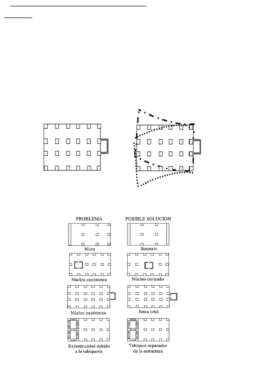 TORSIÓN EN PLANTA-INTRODUCCIÓN A CRITERIOS DE ESTRUCTURACIÓN SISMO RESISTENTE-REQUISITOS DE CONFIGURACIÓN III.- PROBLEMAS DE CONFIGURACIÓN ESTRUCTURAL TORSIÓN La torsión ha sido la causa de importantes daños y, en algunos casos, colapso de edificaciones sometidas a fuertes movimientos sísmicos. Se presenta por la excentricidad entre el centro de masa y el centro de rigidez. Cuando en una configuración, el centro de masa coincide con el centro de rigidez, se dice que existe simetría estructural. A medida que el edificio sea más simétrico, se reducirá su tendencia a sufrir concentraciones de esfuerzos y torsión, y su comportamiento ante cargas sísmicas será menos difícil de analizar y más predecible. La simetría va desde la geometría de la forma exterior, hasta las distribuciones internas de elementos resistentes y componentes no estructurales. En los casos donde existen muros, núcleos de ascensores o tabiquería, hacia un lado de la edificación, el centro de rigidez se desplaza en esa dirección. Debido a esto se generan deformaciones no previstas en el cálculo estructural (Figura 27): Figura 27.- Núcleo de Muros excéntricos – Posible deformación por Torsión debida a la excentricidad. A continuación, se muestran algunos ejemplos y su posible solución, (Figura 28): Figura 28.- Torsión: Problema-Posible Solución. La Figura 29 muestra el edificio Miramar en la ciudad de Cumaná-Venezuela. Edificio de concreto armado de 8 pisos, con muros muy rígidos en el núcleo de escaleras y ascensor ubicado a un lado de la estructura. La planta se muestra en la Figura 30. Debido a la excentricidad entre el centro de masa y de rigidez, se produjo un efecto de torsión que, al sumarse con otros problemas presentes en la edificación, ocasionó el colapso de la misma, durante el terremoto de Cariaco-1997 (Figura 31). Figura 29.- Edificio Miramar en Cariaco-Venezuela, Terremoto 1997. Figura 30.- Planta del edificio Miramar. Figura 31.- Edificio Miramar-Cumaná, después del terremoto de 1997. TRANSICIÓN EN COLUMNAS Cuando columnas de niveles adyacentes varían bruscamente de forma, se generan grandes esfuerzos y se presentan problemas de discontinuidad del acero longitudinal, ocasionando fallas en los nodos. En las fotografías mostradas se puede observar que la columna del piso superior es de sección rectangular y su acero longitudinal se encuentra por fuera de columna inferior, que es de sección circular (Figura 32). El problema de transición generó una articulación en el nodo, incapaz de transmitir momentos, lo cual convirtió la estructura en inestable ante cargas laterales. También se puede apreciar una falla por cortante en la columna superior. Figura 32.- Problema de San Fernando-California 1971-transición de Columna. AUSENCIA DE VIGAS Los sistemas estructurales formados por losas y columnas (sin vigas), presentan un pobre desempeño ante eventos sísmicos. La columna actúa como un punzón ocasionando daños severos en la losa. En la Figura 33 se muestran estructuras ubicadas en Kocaeli-Turkía, dañadas en el sismo del agosto de 1999. Los sistemas presentan losas de espesores entre 8 y 12 cm y vanos (luz libre) mayores a 4 m. Figura 33.- Ausencia de vigas. POCA CUANTÍA DE REFUERZO TRANSVERSAL La función del refuerzo transversal, estribo o ligadura, es soportar fuerzas cortantes, garantizar el adecuado confinamiento del concreto e impedir el pandeo del refuerzo longitudinal. Cuando se presenta mal armado del refuerzo transversal, el diámetro de la cabilla es insuficiente o están muy separadas, se evidencian daños en los elementos estructurales. Los ganchos en los extremos de los estribos deben tener un ángulo mayor o igual a 135º (Figura 34), para lograr un amarre adecuado. Cuando el ángulo del gancho es a 90º no es conveniente (Figura 35). Figura 34.- Ganchos en estribos adecuados. Figura 35.- Ganchos en estribos inadecuados. En la Figura 36 se observa que las columnas fallaron debido a la poca cuantía volumétrica de acero transversal lo que implicó falta de confinamiento. Es imprescindible prestar suficiente atención al refuerzo transversal en las juntas, acatando las recomendaciones indicadas en las normas. La separación de las barras determina el confinamiento del concreto y el adecuado comportamiento de las juntas ante un evento sísmico. Figura 36.- Falta de acero transversal. En la Figura 37 se observa que se evitó el colapso de la estructura gracias al refuerzo transversal en la junta. 37.- Acero transversal en junta. FUNDACIONES INADECUADAS Las fundaciones de una edificación son las bases sobre las cuales ésta se apoya de forma adecuada y estable sobre el terreno. Es imprescindible, para toda obra de ingeniería, realizar un estudio de suelos por expertos en el área. Dicho estudio dependerá de la altura, peso y uso de la edificación. Evidentemente, escoger el tipo de fundación adecuado dependerá de las características de la estructura, del estudio de suelos y la actividad sísmica probable de la zona. El sistema de fundación deberá ser capaz de transferir al suelo las acciones sísmicas y gravitatorias, sin que supere la capacidad portante de éste, correspondiente al nivel de excitación sísmica previsto y sin que se produzcan movimientos relativos entre los elementos de fundación que puedan originar deformaciones inaceptables en la estructura. Los desplazamientos relativos que eventualmente pueden sufrir los distintos elementos de fundación, deberán ser tales que no comprometan la estabilidad y funcionalidad de la estructura. Cada uno de los bloques estructuralmente independientes de una construcción, tendrá un sistema de fundación único (homogéneo). No se admitirán sistemas diversos dentro de una misma unidad, por ejemplo: algunas columnas sobre pilotes y otras sobre fundaciones directas. Los apoyos de la estructura deben vincularse entre sí mediante un sistema de riostras o losa que asegure el movimiento conju