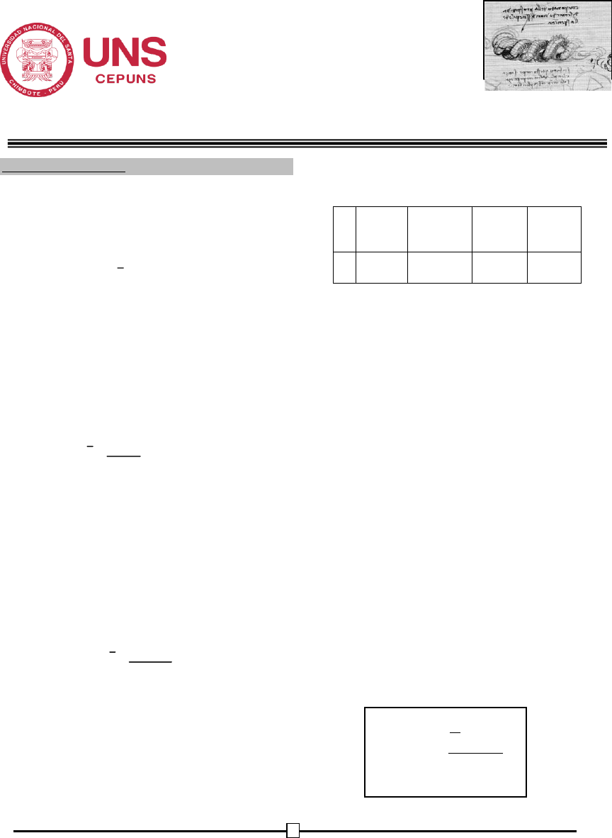 1 Centro Preuniversitario de la UNS S-14 Ingreso Directo ARITMÉTICA CICLO 2022 – II “ESTADÍSTICA II” DOCENTE: EQUIPO DOCENTE Semana Nº 16 MEDIDAS DE POSICION: La medida de posición refleja la tendencia central y la localización de los datos. Las medidas de tendencia central, denominados también promedios, ubican el centro de los datos, como la media, mediana y moda. 1. Media aritmética )x( : Simplemente llamado media, es la suma de los valores observados de la variable, dividido por el número de observaciones. a) Media aritmética de datos no tabulados. Sean “n” valores: n321 x;......;x;x;x : de la variable x. n x x n 1i i Ejemplo: Sean los datos: 7; 15; 18; 30; 10 x= ............................... = b) Media para datos tabulados por intervalos: n mf x n 1i ii Donde: n: número de datos i f : frecuencia absoluta i m : marcas de cada clase k: número de intervalos Ejemplo: Dada la siguiente distribución: i I 24;10[ 38;24[ 52;38[ 66;52[ i f 14 26 24 16 Hallar la media. 2. Mediana (Me) La mediana o valor mediano, es el número que separa a la serie de datos ordenados en forma creciente (o decreciente) en dos partes de igual número de datos. a) Mediana de dato no tabulados: Ejemplo: I) Si el número de datos es impar: Sean los datos: 17 ; 31; 24; 18; 60; 5; 56 Hallar la mediana II) Si el número de datos es par: Sean los datos: 26; 8; 46; 34; 18; 62 Hallar la mediana b) Mediana de datos tabulados: En éste caso, la mediana se calcula con la siguiente formula: C f F n LMe i i i 1 2 Equipo de Docente Ciclo2022 – II SEMANA: (16) 2 Centro Preuniversitario de la UNS S-14 Ingreso Directo 3. Moda: La moda (Mo) de una serie de datos, se define como el dato que más se repite. La moda no siempre existe y si existe, no siempre es única. Ejemplo Calcular la moda en cada caso: I) 7; 9; 7; 8; 7; 4; 7; 13; 7 Mo = II) 5; 3; 4; 5; 7; 3; 5; 6; 3 Mo = III) 31; 11; 12; 19 Mo = Moda de datos tabulados: Para calcular la moda de “n” datos tabulados en una distribución de frecuencias por intervalos, se utiliza siguiente fórmula: de interpolación. CLMo 21 1 i Donde: i L : Es el límite inferior de la clase modal. 1 : Es la diferencia de frecuencias entre la clase modal y premodal. 2 : Es la diferencia de frecuencias entre la clase modal y postmodal PROBLEMAS PROPUESTOS 1. A continuación se presenta un cuadro en el cual se registra las estaturas (en cm) de 200 deportistas. Intervalos xi fi Fi hi Hi 150 - 158 0,07 158 - 166 0,20 166 - 174 0,15 174 - 182 0,56 182 - 190 32 190 - 198 198 - 206 32 1,00 Determine: La media aritmética, la mediana y la moda. 2. Se tiene la siguiente tabla incompleta acerca de las edades de 88 profesores que laboran en la U.S.P. Edades xi fi Fi hi Hi(% ) 30 - 12,5 30 30 60 48 Considerando que los intervalos de clase tienen el mismo tamaño. Determine: La media aritmética, la mediana y la moda. 3. Una distribución de frecuencias consta de 5 intervalos de clase de igual longitud y de ella se conocen los siguientes datos: n = 110; 425113454 ff;ff;0fff;10ff límite inferior de la primera clase 12,5 y 975f.y 44 , donde 4 y es el límite inferior de la cuarta clase. Hallar el valor de la media y mediana. a) 25; 25 b) 25; 24 c) 24; 25 d) 26; 25 e) 25; 28 M. Loyola Máquina de escribir 154 M. Loyola Máquina de escribir 162 M. Loyola Máquina de escribir 170 M. Loyola Máquina de escribir 178 M. Loyola Máquina de escribir 186 M. Loyola Máquina de escribir 194 M. Loyola Máquina de escribir 202 M. Loyola Máquina de escribir 200 M. Loyola Máquina de escribir 0,07 M. Loyola Máquina de escribir 0,13 M. Loyola Máquina de escribir 0,35 M. Loyola Máquina de escribir 0,21 M. Loyola Máquina de escribir 0,16 M. Loyola Máquina de escribir 0,72 M. Loyola Máquina de escribir 0,16 M. Loyola Máquina de escribir 42 M. Loyola Máquina de escribir 30 M. Loyola Máquina de escribir 26 M. Loyola Máquina de escribir 14 M. Loyola Máquina de escribir 24 M. Loyola Máquina de escribir 0,12 M. Loyola Máquina de escribir 0,84 M. Loyola Máquina de escribir 14 M. Loyola Máquina de escribir 40 M. Loyola Máquina de escribir 70 M. Loyola Máquina de escribir 112 M. Loyola Máquina de escribir 144 M. Loyola Máquina de escribir 168 M. Loyola Máquina de escribir 200 M. Loyola Nota rápida X=180,08 Me=179,7 Mo=178,3636.. M. Loyola Máquina de escribir 88 M. Loyola Máquina de escribir 88 M. Loyola Máquina de escribir 34 M. Loyola Máquina de escribir [34-38> M. Loyola Máquina de escribir [38-42> M. Loyola Máquina de escribir [42-46> M. Loyola Máquina de escribir [46-50> M. Loyola Máquina de escribir 44 M. Loyola Máquina de escribir 40 M. Loyola Máquina de escribir 36 M. Loyola Máquina de escribir 32 M. Loyola Máquina de escribir 0,125 M. Loyola Máquina de escribir 11 M. Loyola Máquina de escribir 11 M. Loyola Máquina de escribir M. Loyola Máquina de escribir 19 M. Loyola Máquina de escribir 0,216 M. Loyola Máquina de escribir 0,341 M. Loyola Máquina de escribir 1 M. Loyola Máquina de escribir 0,25 M. Loyola Máquina de escribir 22 M. Loyola Máquina de escribir 6 M. Loyola Máquina de escribir 82 M. Loyola Máquina de escribir 0,068 M. Loyola Nota rápida X= 39,68 Me= 39,866.. Mo= 40,32 M. Loyola Rectángulo M. Loyola Máquina de escribir superior M. Loyola Máquina de escribir 25 M. Loyola Máquina de escribir 25 M. Loyola Resaltar Equipo de Docente Ciclo2022 – II SEMANA: (16) 3 Centro Preuniversitario de la UNS S-14 Ingreso Directo 4. En una encuesta se obtuvo la siguiente información: Puntaje i f i h 40;20[ [40 ; 50> [50 ; 60> [60 ; 80> [80 ; 96> 30 Total 90 Se sabe además que: 4251 hh;hh y 9/1hh 12 Determinar la media. a) 56,5 b) 57 c) 57,5 d) 58 e) N.A. 5. Dada la distribución: Clases i f [35; 45> [45; 55> [55; 65> [65; 75> [75; 85> [85; 95> 5 12 18 14 6 3 Hallar la mediana a) 61,67 b) 60,54 c) 59,72 d) 61,84 e) 62,21 6. La siguiente distribución muestra el peso en gramos de 300 paquetes de un determinado producto. Ii hI 10 - 14 15 – 19 20 – 24 25 