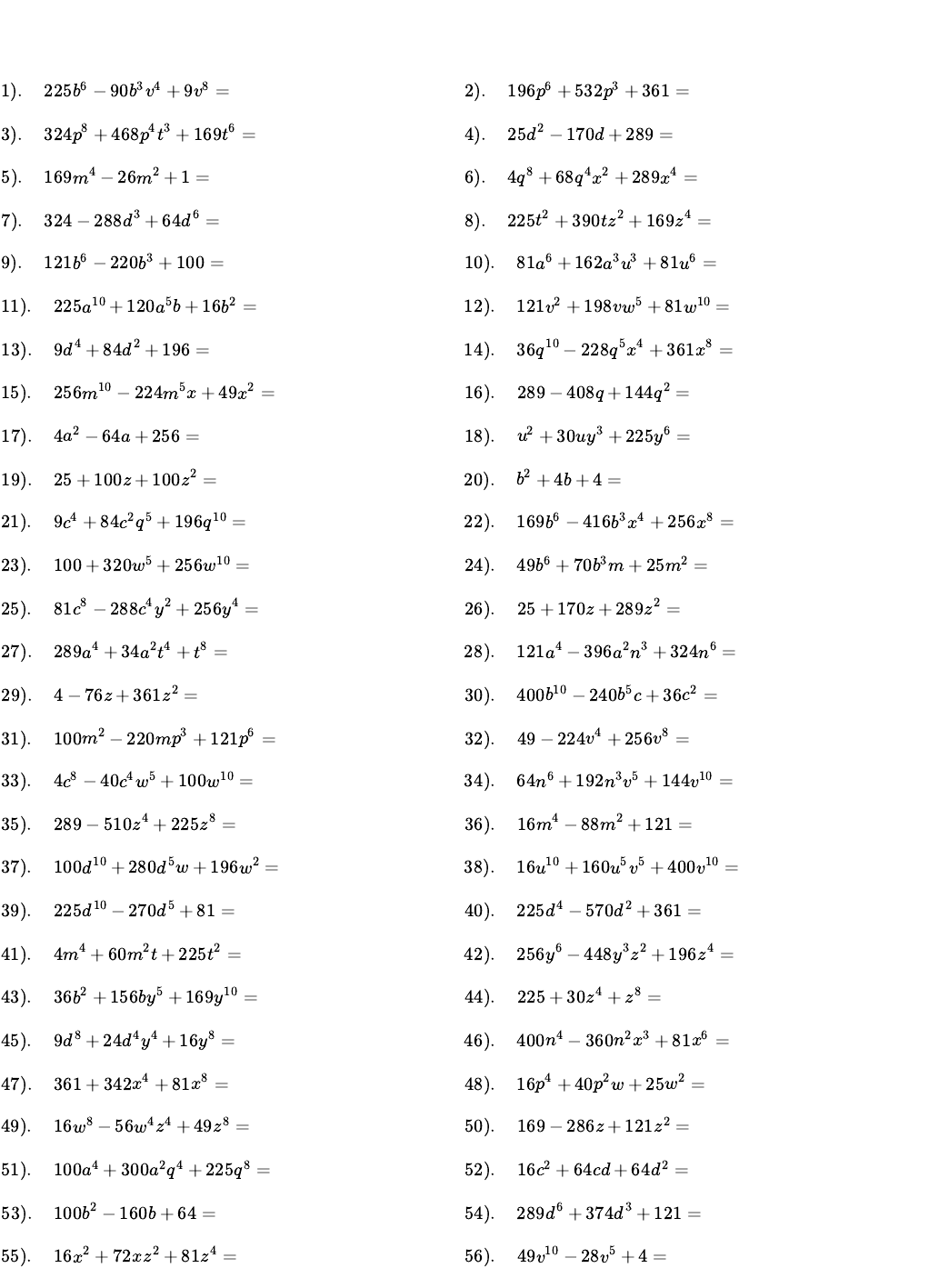 Trinomio Cuadrado Perfecto Factorizar: 1). 225 − 90 + 9 =b6 b3v4 v8 2). 196 + 532 + 361 =p6 p3 3). 324 + 468 + 169 =p8 p4 t3 t6 4). 25 − 170d + 289 =d2 5). 169 − 26 + 1 =m4 m2 6). 4 + 68 + 289 =q8 q4x2 x4 7). 324 − 288 + 64 =d3 d6 8). 225 + 390t + 169 =t2 z2 z4 9). 121 − 220 + 100 =b6 b3 10). 81 + 162 + 81 =a6 a3u3 u6 11). 225 + 120 b + 16 =a10 a5 b2 12). 121 + 198v + 81 =v2 w5 w10 13). 9 + 84 + 196 =d4 d2 14). 36 − 228 + 361 =q10 q5x4 x8 15). 256 − 224 x + 49 =m10 m5 x2 16). 289 − 408q + 144 =q2 17). 4 − 64a + 256 =a2 18). + 30u + 225 =u2 y3 y6 19). 25 + 100z+ 100 =z2 20). + 4b + 4 =b2 21). 9 + 84 + 196 =c4 c2q5 q10 22). 169 − 416 + 256 =b6 b3x4 x8 23). 100 + 320 + 256 =w5 w10 24). 49 + 70 m + 25 =b6 b3 m2 25). 81 − 288 + 256 =c8 c4y2 y4 26). 25 + 170z+ 289 =z2 27). 289 + 34 + =a4 a2t4 t8 28). 121 − 396 + 324 =a4 a2n3 n6 29). 4 − 76z+ 361 =z2 30). 400 − 240 c + 36 =b10 b5 c2 31). 100 − 220m + 121 =m2 p3 p6 32). 49 − 224 + 256 =v4 v8 33). 4 − 40 + 100 =c8 c4w5 w10 34). 64 + 192 + 144 =n6 n3v5 v10 35). 289 − 510 + 225 =z4 z8 36). 16 − 88 + 121 =m4 m2 37). 100 + 280 w + 196 =d10 d5 w2 38). 16 + 160 + 400 =u10 u5v5 v10 39). 225 − 270 + 81 =d10 d5 40). 225 − 570 + 361 =d4 d2 41). 4 + 60 t + 225 =m4 m2 t2 42). 256 − 448 + 196 =y6 y3z2 z4 43). 36 + 156b + 169 =b2 y5 y10 44). 225 + 30 + =z4 z8 45). 9 + 24 + 16 =d8 d4y4 y8 46). 400 − 360 + 81 =n4 n2x3 x6 47). 361 + 342 + 81 =x4 x8 48). 16 + 40 w + 25 =p4 p2 w2 49). 16 − 56 + 49 =w8 w4z4 z8 50). 169 − 286z+ 121 =z2 51). 100 + 300 + 225 =a4 a2q4 q8 52). 16 + 64cd + 64 =c2 d2 53). 100 − 160b + 64 =b2 54). 289 + 374 + 121 =d6 d3 55). 16 + 72x + 81 =x2 z2 z4 56). 49 − 28 + 4 =v10 v5 57). 81 − 180 + 100 =w10 w5z3 z6 58). 16 + 104 + 169 =p8 p4q5 q10 59). 121 − 374 + 289 =n8 n4q2 q4 60). 144 − 360 + 225 =q10 q5 61). 25 + 180 + 324 =m6 m3t3 t6 62). 289 − 476a + 196 =a2 p2 p4 63). − 10b + 25 =b2 64). 4 + 44m + 121 =m2 65). 64 + 144 + 81 =d4 d2t5 t10 66). 81 − 306 n + 289 =d10 d5 n2 67). 36 − 216 + 324 =a8 a4 68). 81 − 306 + 289 =w3 w6 69). 169 − 338 t + 169 =q4 q2 t2 70). 9 − 108b + 324 =b2 t3 t6 71). 25 − 80 + 64 =v4 v2 72). 225 − 570 + 361 =u4 u2x2 x4 73). 196 − 112 + 16 =u10 u5w3 w6 74). 361 + 684 + 324 =b8 b4 75). 324 − 396 + 121 =v4 v8 76). 121 + 176 + 64 =a10 a5w5 w10 77). 4 − 32 + 64 =x2 x4 78). 121 + 286 + 169 =w10 w5 79). 36 − 24 + 4 =b10 b5 80). 25 + 170 + 289 =t4 t2 81). 324 + 432 + 144 =d10 d5y5 y10 82). 81 − 360m + 400 =m2 t5 t10 83). 1 + 2 + =v3 v6 84). 121 + 88 + 16 =w6 w3z2 z4 85). 256 + 416 + 169 =x8 x4 86). 25 − 110 + 121 =p8 p4 87). 361 − 646d + 289 =d2 y2 y4 88). 36 + 204 + 289 =b8 b4n2 n4 89). 225 + 420 + 196 =d10 d5v2 v4 90). 400 + 720v + 324 =v2 z4 z8 91). 4 + 4 + 1 =n10 n5 92). 9 − 18 + 9 =q6 q3z5 z10 93). 9 − 114 + 361 =n8 n4 94). 256 − 480 t + 225 =p4 p2 t2 95). 144 − 120a + 25 =a2 p3 p6 96). + 18 + 81 =v8 v4x2 x4 97). 169 − 104a + 16 =a2 98). 289 − 306 + 81 =n10 n5q2 q4 99). 16 + 64t + 64 =t2 z2 z4 100). 49 + 126 + 81 =b10 b5y4 y8 101). 169 − 312 + 144 =n10 n5y4 y8 102). 81 − 144 + 64 =c6 c3v2 v4 103). 289 + 578 + 289 =a10 a5x3 x6 104). 100 − 320 + 256 =z2 z4 105). 49 + 112w + 64 =w2 106). − 22d + 121 =d2 t2 t4 107). 49 + 224 + 256 =x5 x10 108). 144 − 48 + 4 =c8 c4d3 d6 109). 4 + 24 x + 36 =u10 u5 x2 110). 81 − 162 u + 81 =m6 m3 u2 111). 361 + 190 + 25 =m8 m4v4 v8 112). 16 − 16 p + 4 =d6 d3 p2 113). 400 + 520bp + 169 =b2 p2 114). 100 + 400 + 400 =v10 v5y4 y8 115). 16 + 80 + 100 =p4 p2 116). 81 + 126 + 49 =c8 c4z2 z4 117). 169 + 26 + 1 =n4 n2 118). 400 + 80 + 4 =c10 c5y2 y4 119). 81 − 180 + 100 =b8 b4d2 d4 120). 64 + 208 y + 169 =b4 b2 y2 121). 196 − 448 + 256 =t10 t5x4 x8 122). 289 − 408c + 144 =c2 d5 d10 123). 25 + 200 + 400 =v10 v5y2 y4 124). 64 − 128 + 64 =q6 q3v4 v8 125). 4 + 80 + 400 =p6 p3v2 v4 126). 64 + 96 + 36 =q8 q4z4 z8 127). 169 + 26 + =m6 m3x2 x4 128). 64 + 64 n + 16 =c4 c2 n2 129). 196 − 112 + 16 =c6 c3d5 d10 130). 256 + 544 m + 289 =c8 c4 m2 131). 9 − 72m + 144 =m2 z4 z8 132). 4 − 44 + 121 =n10 n5 133). 289 + 68 + 4 =b6 b3 134). 400 − 160 + 16 =t8 t4v5 v10 135). 196 + 560 + 400 =z2 z4 136). 324 − 648 + 324 =q5 q10 137). 324 + 180 + 25 =a8 a4c4 c8 138). 4 + 40 + 100 =b6 b3p4 p8 139). 400 + 640 + 256 =x4 x2y5 y10 140). + 34 + 289 =c6 c3u4 u8 141). 169 + 494 + 361 =m8 m4y5 y10 142). 36 + 108w + 81 =w2 z3 z6 143). 361 + 76 + 4 =m4 m2t5 t10 144). 144 − 456c + 361 =c2 145). 289 + 578cx + 289 =c2 x2 146). 100 − 160 + 64 =n10 n5q4 q8 147). 25 − 120 + 144 =d4 d2p5 p10 148). 49 + 98 + 49 =n6 n3q5 q10 149). − 30u + 225 =u2 150). 81 + 144 + 64 =w10 w5z2 z4 151). 36 − 156 + 169 =n10 n5x4 x8 152). 400 − 200x + 25 =x2 y2 y4 153). 196 − 56 + 4 =x8 x4y3 y6 154). 49 − 266 c + 361 =a6 a3 c2 155). 144 − 408 + 289 =b8 b4w4 w8 156). − 6c + 9 =c2 v3 v6 157). 400 + 360 + 81 =n4 n2p3 p6 158). 169 + 520 + 400 =p10 p5y3 y6 159). 196 + 280d + 100 =d2 z5 z10 160). 49 + 14 + =d6 d3n4 n8 161). 196 + 56n + 4 =n2 y5 y10 162). 4 − 40q + 100 =q2 v3 v6 163). 121 − 308 w + 196 =u4 u2 w2 164). 4 − 80t + 400 =t2 v2 v4 165). 1 + 16 + 64 =d5 d10 166). 9 + 72 + 144 =w10 w5 167). 169 + 78 + 9 =t10 t5z4 z8 168). 196 + 28 + 1 =a6 a3 169). 100 − 20 + 1 =d6 d3 170). 100 + 280 + 196 =z5 z10 171). 361 − 722 + 361 =z4 z8 172). 4 + 52cm + 169 =c2 m2 173). 81 − 90 + 25 =p4 p2v2 v4 174). 25 − 120m + 144 =m2 v4 v8 175). 196 − 252 + 81 =n8 n4z3 z6 176). 121 + 44p + 4 =p2 177). 400 − 80 + 4 =a10 a5c4 c8 178). 64 + 144 + 81 =a8 a4n3 n6 179). 36 − 180 + 225 =a10 a5n5 n10 180). 144 + 144 x + 36 =d10 d5 x2 181). 4 + 20w + 25 =w2 x4 x8 182). 225 − 570 + 361 =x3 x6 183). 256 − 96 + 9 =n6 n3q5 q10 184). 324 + 144 + 16 =n4 n2x5 x10 185). 289 − 204w + 36 =w2 186). 4 + 44d + 121 =d2 u3 u6 187). 324 + 72c + 4 =c2 188). 9 − 78 + 169 =d10 d5p2 p4 189). 361 + 646 + 289 =q6 q3t5 t10 190). 49 − 98 + 49 =d8 d4m4 m8 191). 400 + 520 + 169 =m10 m5t2 t4 192). 324 − 288 + 64 =m8 m4w4 w8 193). 81 + 162 + 81