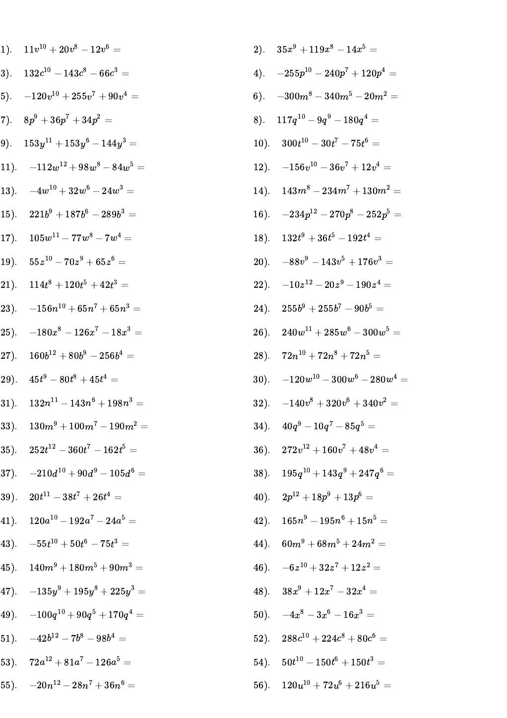 Factor Común Factorizar: 1). 11 + 20 − 12 =v10 v8 v6 2). 35 + 119 − 14 =x9 x8 x5 3). 132 − 143 − 66 =c10 c8 c3 4). −255 − 240 + 120 =p10 p7 p4 5). −120 + 255 + 90 =v10 v7 v4 6). −300 − 340 − 20 =m8 m5 m2 7). 8 + 36 + 34 =p9 p7 p2 8). 117 − 9 − 180 =q10 q9 q4 9). 153 + 153 − 144 =y11 y6 y3 10). 300 − 30 − 75 =t10 t7 t6 11). −112 + 98 − 84 =w12 w8 w5 12). −156 − 36 + 12 =v10 v7 v4 13). −4 + 32 − 24 =w10 w6 w3 14). 143 − 234 + 130 =m8 m7 m2 15). 221 + 187 − 289 =b9 b6 b3 16). −234 − 270 − 252 =p12 p8 p5 17). 105 − 77 − 7 =w11 w8 w4 18). 132 + 36 − 192 =t9 t5 t4 19). 55 − 70 + 65 =z10 z9 z6 20). −88 − 143 + 176 =v9 v5 v3 21). 114 + 120 + 42 =t8 t5 t3 22). −10 − 20 − 190 =z12 z9 z4 23). −156 + 65 + 65 =n10 n7 n3 24). 255 + 255 − 90 =b9 b7 b5 25). −180 − 126 − 18 =x8 x7 x3 26). 240 + 285 − 300 =w11 w6 w5 27). 160 + 80 − 256 =b12 b9 b4 28). 72 + 72 + 72 =n10 n8 n5 29). 45 − 80 + 45 =t9 t8 t4 30). −120 − 300 − 280 =w10 w6 w4 31). 132 − 143 + 198 =n11 n6 n3 32). −140 + 320 + 340 =v8 v6 v2 33). 130 + 100 − 190 =m9 m7 m2 34). 40 − 10 − 85 =q9 q7 q5 35). 252 − 360 − 162 =t12 t7 t5 36). 272 + 160 + 48 =v12 v7 v4 37). −210 + 90 − 105 =d10 d9 d6 38). 195 + 143 + 247 =q10 q9 q6 39). 20 − 38 + 26 =t11 t7 t4 40). 2 + 18 + 13 =p12 p9 p6 41). 120 − 192 − 24 =a10 a7 a5 42). 165 − 195 + 15 =n9 n6 n5 43). −55 + 50 − 75 =t10 t6 t3 44). 60 + 68 + 24 =m9 m5 m2 45). 140 + 180 + 90 =m9 m5 m3 46). −6 + 32 + 12 =z10 z7 z2 47). −135 + 195 + 225 =y9 y8 y3 48). 38 + 12 − 32 =x9 x7 x4 49). −100 + 90 + 170 =q10 q5 q4 50). −4 − 3 − 16 =x8 x6 x3 51). −42 − 7 − 98 =b12 b8 b4 52). 288 + 224 + 80 =c10 c8 c6 53). 72 + 81 − 126 =a12 a7 a5 54). 50 − 150 + 150 =t10 t6 t3 55). −20 − 28 + 36 =n12 n7 n6 56). 120 + 72 + 216 =u10 u6 u5 57). −8 − 6 + 13 =v9 v6 v4 58). 144 − 27 + 54 =q9 q7 q5 59). 140 − 280 − 400 =b8 b5 b3 60). 16 + 11 − 19 =b9 b7 b3 61). −56 + 280 − 252 =z12 z9 z5 62). 30 + 4 + 28 =m10 m7 m4 63). −143 + 154 + 121 =b12 b9 b6 64). −95 − 25 + 15 =p9 p8 p4 65). −266 − 247 + 285 =u11 u8 u3 66). −190 − 190 + 38 =t11 t9 t4 67). 170 − 221 + 34 =z10 z6 z5 68). 8 + 17 + 8 =b9 b8 b5 69). 6 − 2 + 10 =v12 v9 v5 70). 340 + 300 + 260 =b8 b6 b3 71). −176 + 32 − 224 =m10 m7 m5 72). −154 + 14 + 98 =c9 c6 c4 73). 38 − 152 − 285 =m10 m8 m5 74). 60 + 108 − 6 =d10 d8 d5 75). −28 + 140 − 224 =y11 y6 y4 76). 20 − 320 + 300 =y11 y9 y4 77). −35 + 63 + 77 =t10 t6 t3 78). −132 − 180 + 12 =q12 q9 q5 79). 20 − 4 + 80 =t11 t8 t5 80). 27 − 63 + 162 =q10 q9 q6 81). 361 + 266 − 380 =x9 x5 x4 82). −140 + 154 + 140 =n12 n8 n4 83). −5 + 3 + 7 =d10 d5 d4 84). −9 − 16 + 10 =w8 w6 w4 85). −49 − 70 − 35 =n9 n7 n2 86). −221 − 78 + 260 =a9 a6 a3 87). 285 + 209 − 38 =u11 u9 u4 88). −36 + 6 − 39 =b9 b7 b3 89). 91 + 77 + 112 =u9 u6 u4 90). −24 + 24 + 32 =a11 a8 a5 91). 200 + 170 − 170 =n9 n7 n3 92). 42 + 30 + 57 =n11 n7 n5 93). 20 + 60 − 15 =b11 b8 b6 94). 143 + 132 + 66 =n9 n5 n3 95). −19 − 171 + 19 =p11 p9 p4 96). 32 + 12 + 48 =d10 d7 d5 97). 6 + 12 − 20 =p9 p7 p2 98). −300 − 255 + 240 =z12 z8 z4 99). 9 + 9 + 13 =t12 t9 t4 100). 56 − 21 − 133 =x9 x8 x5 101). 96 − 36 − 204 =n10 n9 n6 102). 75 − 30 + 35 =y12 y8 y6 103). 216 − 54 − 18 =q10 q7 q4 104). 196 − 238 + 238 =w11 w9 w6 105). 57 − 209 + 19 =w10 w7 w4 106). −300 + 270 + 180 =t11 t9 t5 107). 342 − 234 + 252 =c10 c5 c3 108). −24 + 112 − 160 =b9 b7 b4 109). 306 − 85 + 153 =x9 x5 x2 110). 27 − 54 − 42 =a8 a5 a4 111). −48 − 160 − 112 =y8 y7 y3 112). 24 + 144 + 72 =z11 z8 z3 113). −105 + 140 − 70 =u9 u6 u3 114). 143 − 55 − 220 =w12 w7 w4 115). −238 + 280 − 196 =c10 c7 c6 116). 133 − 98 + 35 =w11 w8 w5 117). −16 − 76 + 40 =u9 u8 u5 118). −240 + 36 − 216 =w11 w9 w4 119). 171 − 76 + 266 =z8 z6 z4 120). 7 − 10 − 10 =x9 x6 x3 121). 240 − 180 − 165 =y10 y7 y5 122). −63 + 144 − 135 =m8 m7 m2 123). −80 + 80 − 340 =p8 p5 p3 124). −170 − 130 − 80 =d10 d7 d4 125). 44 − 132 + 176 =y12 y7 y4 126). −340 + 200 + 400 =u9 u6 u3 127). 126 − 98 + 210 =d12 d7 d5 128). −190 + 30 + 140 =b11 b8 b4 129). 42 + 56 − 98 =p12 p8 p5 130). −108 + 72 − 108 =w10 w6 w5 131). 162 + 9 − 117 =a10 a7 a4 132). 130 − 91 + 234 =u12 u7 u4 133). −187 + 119 − 51 =c10 c8 c5 134). 110 − 198 − 209 =q12 q9 q6 135). 270 − 60 + 30 =n8 n6 n3 136). 304 + 152 + 361 =y9 y6 y5 137). −10 − 60 − 70 =q12 q7 q5 138). −34 + 51 + 153 =p10 p7 p5 139). −18 − 6 + 18 =v12 v7 v6 140). −360 + 380 − 40 =c11 c7 c4 141). 119 + 221 + 323 =z10 z7 z6 142). −270 − 90 + 90 =d8 d5 d3 143). −60 − 220 + 360 =d10 d8 d5 144). −45 + 35 + 90 =z9 z7 z4 145). −220 − 66 − 110 =n11 n7 n6 146). −180 − 320 − 240 =u9 u7 u5 147). 95 + 57 − 190 =b12 b7 b4 148). −76 + 48 + 52 =t12 t9 t5 149). 36 − 30 + 32 =m11 m8 m3 150). 24 − 16 − 80 =m8 m6 m4 151). −119 + 136 + 255 =t9 t8 t5 152). −234 + 180 − 342 =a11 a8 a4 153). −13 + 7 − 13 =x9 x7 x2 154). 40 − 160 + 96 =q9 q7 q4 155). 77 + 63 − 105 =z10 z8 z6 156). 64 + 64 − 76 =d10 d7 d4 157). 160 − 110 + 110 =p10 p8 p4 158). 208 − 160 − 240 =b9 b6 b4 159). −81 − 171 − 27 =d12 d7 d6 160). 120 + 144 − 144 =p11 p7 p5 161). 198 + 18 − 324 =p11 p9 p4 162). −90 − 160 + 190 =q11 q8 q5 163). −255 + 75 + 240 =q11 q8 q6 164). 171 + 27 + 99 =p10 p7 p3 165). 18 + 33 + 36 =q11 q8 q3 166). 13 − 8 − =z11 z9 z5 167). 117 − 78 + 65 =t9 t6 t4 168). −120 − 240 − 36 =v10 v6 v3 169). −10 − 75 + 45 =q9 q6 q3 170). −160 + 300 + 220 =t10 t8 t6 171). 280 − 196 + 112 =c8 c7 c4 172). −85 − 323 − 255 =b10 b6 b3 173). −48 − 66 − 48 =n11 n8 n5 174). −28 − 2 − 24 =c12 c7 c4 175). 49 − 91 + 42 =m11 m9 m4 176). 24 + 36 + 192 =a10 a6 a3 177). −36 + 18 + 4 =m10 m7 m3 178). −24 + 30 + 72 =d10 d8 d6 179). 162 