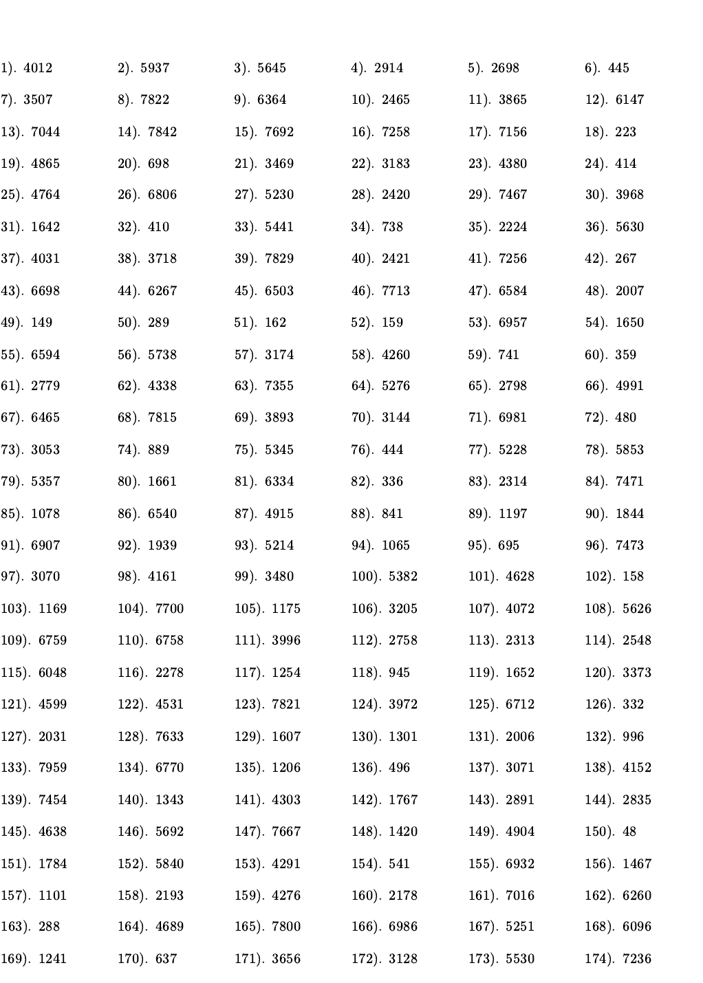 Sistema de enumeración Maya Convertir al sistema de enumeración maya: 1). 4012 2). 5937 3). 5645 4). 2914 5). 2698 6). 445 7). 3507 8). 7822 9). 6364 10). 2465 11). 3865 12). 6147 13). 7044 14). 7842 15). 7692 16). 7258 17). 7156 18). 223 19). 4865 20). 698 21). 3469 22). 3183 23). 4380 24). 414 25). 4764 26). 6806 27). 5230 28). 2420 29). 7467 30). 3968 31). 1642 32). 410 33). 5441 34). 738 35). 2224 36). 5630 37). 4031 38). 3718 39). 7829 40). 2421 41). 7256 42). 267 43). 6698 44). 6267 45). 6503 46). 7713 47). 6584 48). 2007 49). 149 50). 289 51). 162 52). 159 53). 6957 54). 1650 55). 6594 56). 5738 57). 3174 58). 4260 59). 741 60). 359 61). 2779 62). 4338 63). 7355 64). 5276 65). 2798 66). 4991 67). 6465 68). 7815 69). 3893 70). 3144 71). 6981 72). 480 73). 3053 74). 889 75). 5345 76). 444 77). 5228 78). 5853 79). 5357 80). 1661 81). 6334 82). 336 83). 2314 84). 7471 85). 1078 86). 6540 87). 4915 88). 841 89). 1197 90). 1844 91). 6907 92). 1939 93). 5214 94). 1065 95). 695 96). 7473 97). 3070 98). 4161 99). 3480 100). 5382 101). 4628 102). 158 103). 1169 104). 7700 105). 1175 106). 3205 107). 4072 108). 5626 109). 6759 110). 6758 111). 3996 112). 2758 113). 2313 114). 2548 115). 6048 116). 2278 117). 1254 118). 945 119). 1652 120). 3373 121). 4599 122). 4531 123). 7821 124). 3972 125). 6712 126). 332 127). 2031 128). 7633 129). 1607 130). 1301 131). 2006 132). 996 133). 7959 134). 6770 135). 1206 136). 496 137). 3071 138). 4152 139). 7454 140). 1343 141). 4303 142). 1767 143). 2891 144). 2835 145). 4638 146). 5692 147). 7667 148). 1420 149). 4904 150). 48 151). 1784 152). 5840 153). 4291 154). 541 155). 6932 156). 1467 157). 1101 158). 2193 159). 4276 160). 2178 161). 7016 162). 6260 163). 288 164). 4689 165). 7800 166). 6986 167). 5251 168). 6096 169). 1241 170). 637 171). 3656 172). 3128 173). 5530 174). 7236 175). 3148 176). 7066 177). 7191 178). 316 179). 4508 180). 7045 181). 2202 182). 1861 183). 3061 184). 1573 185). 768 186). 7801 187). 2130 188). 3061 189). 2080 190). 34 191). 200 192). 7468 193). 4257 194). 7554 195). 5175 196). 7431 197). 5680 198). 2386 199). 6081 200). 7854 201). 5623 202). 6031 203). 5892 204). 6050 205). 292 206). 4898 207). 5663 208). 1365 209). 1145 210). 807 211). 519 212). 4254 213). 6061 214). 5194 215). 1383 216). 3939 217). 5713 218). 1587 219). 2751 220). 6969 221). 3603 222). 2769 223). 7904 224). 7340 225). 7414 226). 4482 227). 6510 228). 227 229). 6269 230). 4092 231). 5452 232). 1896 233). 6181 234). 1468 235). 7348 236). 739 237). 6553 238). 1539 239). 7366 240). 449 241). 7125 242). 3449 243). 7762 244). 2588 245). 1852 246). 1516 247). 3640 248). 3705 249). 3563 250). 309 251). 2196 252). 803 253). 949 254). 4716 255). 3855 256). 7030 257). 4614 258). 7885 259). 2571 260). 6668 261). 5567 262). 3570 263). 4757 264). 931 265). 240 266). 621 267). 5268 268). 1170 269). 3099 270). 2378 271). 1345 272). 1092 273). 7002 274). 810 275). 4848 276). 842 277). 1893 278). 7459 279). 1848 280). 7687 281). 7580 282). 1594 283). 7921 284). 7639 285). 5802 286). 5540 287). 2639 288). 6962 289). 44 290). 3895 291). 6909 292). 7754 293). 2993 294). 2929 295). 5176 296). 5813 297). 5387 298). 4010 299). 7141 300). 222 301). 3956 302). 5855 303). 276 304). 7883 305). 6325 306). 3964 307). 3434 308). 3459 309). 895 310). 3681 311). 6861 312). 1849 313). 681 314). 1494 315). 6494 316). 5241 317). 7145 318). 7361 319). 3717 320). 3071 321). 2030 322). 5939 323). 3359 324). 912 325). 3425 326). 4513 327). 4546 328). 2246 329). 5973 330). 4698 331). 209 332). 2898 333). 470 334). 2239 335). 6726 336). 4548 337). 5038 338). 6932 339). 1516 340). 1464 341). 7669 342). 7853 343). 922 344). 6335 345). 3467 346). 747 347). 1285 348). 2967 349). 3174 350). 3606 351). 3340 352). 5639 353). 4732 354). 7965 355). 5481 356). 7623 357). 7978 358). 2336 359). 3528 360). 642 361). 1186 362). 7733 363). 4062 364). 1987 365). 2410 366). 2415 367). 4093 368). 3107 369). 4551 370). 4710 371). 4375 372). 2916 373). 5378 374). 1520 375). 1516 376). 5249 377). 4430 378). 684 379). 5702 380). 2293 381). 7574 382). 3309 383). 5927 384). 4865 385). 4160 386). 4442 387). 3826 388). 3386 389). 6091 390). 2438 391). 6641 392). 4375 393). 6508 394). 7130 395). 48 396). 6987 397). 3627 398). 2595 399). 3227 400). 6737 HOJA DE RESPUESTAS Sistema de enumeración Maya Convertir al sistema de enumeración maya: 1). a 0 c 2). e g h 3). e 2 5 4). 7 5 e 5). 6 e i 6). 1 2 5 7). 8 f 7 8). j b 2 9). f i 4 10). 6 3 5 11). 9 d 5 12). f 7 7 13). h c 4 14). j c 2 15). j 4 c 16). i 2 i 17). h h g 18). 0 b 3 19). c 3 5 20). 1 e i 21). 8 d 9 22). 7 j 3 23). a j 0 24). 1 0 e 25). b i 4 26). h 0 6 27). d 1 a 28). 6 1 0 29). i d 7 30). 9 i 8 4012 = 5937 = 5645 = 2914 = 2698 = 445 = 3507 = 7822 = 6364 = 2465 = 3865 = 6147 = 7044 = 7842 = 7692 = 7258 = 7156 = 223 = 4865 = 698 = 3469 = 3183 = 4380 = 414 = 4764 = 6806 = 5230 = 2420 = 7467 = 3968 = 31). 4 2 2 32). 1 0 a 33). d c 1 34). 1 g i 35). 5 b 4 36). e 1 a 37). a 1 b 38). 9 5 i 39). j b 9 40). 6 1 1 41). i 2 g 42). 0 d 7 43). g e i 44). f d 7 45). g 5 3 46). j 5 d 47). g 9 4 48). 5 0 7 49). 0 7 9 50). 0 e 9 51). 0 8 2 52). 0 7 j 53). h 7 h 54). 4 2 a 55). g 9 e 56). e 6 i 57). 7 i e 58). a d 0 59). 1 h 1 60). 0 h j 1642 = 410 = 5441 = 738 = 2224 = 5630 = 4031 = 3718 = 7829 = 2421 = 7256 = 267 = 6698 = 6267 = 6503 = 7713 = 6584 = 2007 = 149 = 289 = 162 = 159 = 6957 = 1650 = 6594 = 5738 = 3174 = 4260 = 741 = 359 = 61). 6 i j 62). a g i 63). i 7 f 64). d 3 g 65). 6 j i 66). c 9 b 67). g 3 5 68). j a f 69). 9 e d 70). 7 h 4 71). h 9 1 72). 1 4 0 73). 7 c d 74). 2 4 9 75). d 7 5 76). 1 2 4 77). d 1 8 78). e c d 79). d 7 h 80). 4 3 1 81). f g e 82). 0 g g 83). 5 f e 84). i d b 85). 2 d i 86). g 7 0 87). c 5 f 88). 2 2 1 89). 2 j h 90). 4 c 4 2779 = 4338 = 7355 = 5276 = 2798 = 4991 = 6465 = 7815 = 3893 = 3144 = 6981 = 480 = 3053 = 889 = 5345 = 444 = 5228 = 5853 = 5357 = 1661 = 6334 = 336 = 2314 = 7471 = 1078 = 6540 = 4915 = 841 = 1197 = 1844 = 91). h 5 7 92).