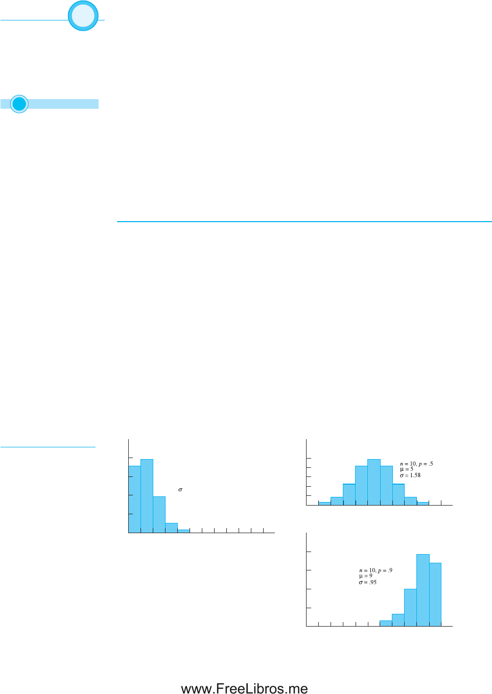 5.2 LA DISTRIBUCIÓN BINOMIAL DE PROBABILIDAD ❍ 187 Encuentre P(x � 2) para una variable aleatoria binomial con n � 10 y p � .1. Solución P(x � 2) es la probabilidad de observar 2 éxitos y 8 fracasos en una secuencia de 10 intentos. Se podrían observar 2 éxitos primero, seguidos de 8 fracasos consecutivos: S, S, F, F, F, F, F, F, F, F Como p es la probabilidad de éxito y q es la probabilidad de fracaso, esta secuencia particular también resulta en x � 2 éxitos. ppqqqqqqqq � p2q8 Sin embargo, pueden también resultar muchas otras secuencias en x � 2. La fórmula binomial utiliza C102 para contar el número de secuencias y da la probabilidad exacta cuando se usa la fórmula binomial con k � 2: P(x � 2) � C102 (.1) 2(.9)10�2 � 10! __________ 2!(10 � 2)! (.1)2(.9)8 � 10(9) _____ 2(1) (.01)(.430467) � .1937 Se podría repetir el procedimiento del ejemplo 5.3 para cada valor de x (0, 1, 2, …, 10) y encontrar todos los valores de p(x) necesarios para construir un histograma de pro- babilidad para x. Éste sería un trabajo largo y tedioso, pero la gráfi ca resultante se vería como la fi gura 5.1a). Se puede verifi car la altura de la barra para x � 2 y encontrar p(2) � P(x � 2) � .1937. La gráfi ca está sesgada a la derecha; esto es, casi todo el tiempo se observarán valores pequeños de x. La media o “punto de equilibrio” está alrededor de x � 1; de hecho, se puede usar la fórmula para hallar la media exacta: m � np � 10(.1) � 1 Las fi guras 5.1b) y 5.1c) muestran las otras dos distribuciones binomiales con n � 10 pero con diferentes valores de p. Vea las formas de estas distribuciones. Cuan- do p � .5, la distribución es exactamente simétrica alrededor de la media, m � np � 10(.5) � 5. Cuando p � .9, la distribución es la “imagen espejo” de la distribución para p � .1 y está sesgada a la izquierda. E J E M P L O 5.3 x0 0 n = 10, p = .1 μ = 1 .10 .20 .30 .40 p(x) 101 2 3 4 5 6 7 8 9 (a) = .95 x0 0 .05 .10 .20 .25 p(x) 101 2 3 4 5 6 7 8 9 .15 (b) x0 0 .10 .20 .30 .40 p(x) 101 2 3 4 5 6 7 8 9 (c) FIGURA 5.1 Distribuciones de probabilidad binomial ● n! � n (n � 1)(n � 2) . . . (2)(1) Por ejemplo, 5! � 5(4)(3)(2)(1) � 120 y 0! � 1. CONSEJOMIMI Probabilidad_Mendenhall_05.indd 187Probabilidad_Mendenhall_05.indd 187 5/14/10 8:34:03 AM5/14/10 8:34:03 AM www.FreeLibros.me 188 ❍ CAPÍTULO 5 ALGUNAS DISTRIBUCIONES DISCRETAS ÚTILES En un tiempo largo, se ha observado que un jugador profesional de baloncesto puede hacer un tiro libre en un intento determinado con probabilidad igual a .8. Suponga que él lanza cuatro tiros libres. 1. ¿Cuál es la probabilidad de que enceste exactamente dos tiros libres? 2. ¿Cuál es la probabilidad de que enceste al menos un tiro libre? Solución Un “intento” es un solo tiro libre y se puede defi nir un “éxito” como una canasta y un “fracaso” como una falla, de modo que n � 4 y p � .8. Si se supone que la probabilidad del jugador de encestar el tiro libre no cambia de un tiro a otro, entonces el número x de veces que enceste el tiro libre es una variable aleatoria binomial. 1. P(x � 2) � C 42(.8) 2(.2)2 � 4! ____ 2!2! (.64)(.04) � 4(3)(2)(1) _________ 2(1)(2)(1) (.64)(.04) � .1536 La probabilidad es .1536 de que enceste exactamente dos tiros libres. 2. P(al menos uno) � P(x � 1) � p(1) � p(2) � p(3) � p(4) � 1 � p(0) � 1 � C 40(.8) 0(.2)4 � 1 � .0016 � .9984. Aun cuando se podría calcular P(x � 1), P(x � 2), P(x � 3) y P(x � 4) para hallar esta probabilidad, usar el complemento del evento hace más fácil el tra- bajo; es decir, P(x � 1) � 1 � P(x � 1) � 1 � P(x � 0). ¿Puede usted considerar alguna razón por la que su suposición de intentos indepen- dientes podría ser errónea? Si el jugador aprende por su intento previo (es decir, ajusta su tiro de acuerdo con su último intento), entonces su probabilidad p de encestar el tiro libre puede cambiar, posiblemente aumentar, de un tiro a otro. Los intentos no serían independientes y el experimento no sería binomial. Calcular probabilidades binomiales puede ser tedioso incluso para valores relativa- mente pequeños de n. Cuando n se hace grande, se hace casi imposible sin ayuda de una calculadora o computadora. Por fortuna tenemos estas dos herramientas. Las tablas de probabilidades binomiales acumulativas generadas por computadora se dan en la tabla 1 del apéndice I, para valores de n que van de 2 a 25 y para valores selecciona- dos de p. Estas probabilidades también pueden ser generadas si se usa el MINITAB o los applets Java en el sitio web Premium. Las probabilidades binomiales acumulativas difi eren de las probabilidades binomia- les individuales que se calcularon con la fórmula binomial. Una vez que usted encuentre la columna de probabilidades para los valores correctos de n y p en la tabla 1, el renglón marcado como k da la suma de todas las probabilidades binomiales de x � 0 a x � k. La tabla 5.1 muestra parte de la tabla 1 para n � 5 y p � .6. Si se muestra en el renglón marcado k � 3, se encuentra P(x � 3) � p(0) � p(1) � p(2) � p(3) � .663 E J E M P L O 5.4 Use la tabla 1 del apéndice I más que la fórmula binomial siempre que sea posible. Ésta es una forma más fácil. CONSEJOMIMI Probabilidad_Mendenhall_05.indd 188Probabilidad_Mendenhall_05.indd 188 5/14/10 8:34:03 AM5/14/10 8:34:03 AM www.FreeLibros.me 5.2 LA DISTRIBUCIÓN BINOMIAL DE PROBABILIDAD ❍ 189 Si la probabilidad que usted necesite calcular no está en esta forma, necesitará conside- rar una forma para reescribir su probabilidad y hacer uso de las tablas. Use la tabla binomial acumulativa para n � 5 y p � .6 para hallar las probabilidades de estos eventos: 1. Exactamente tres éxitos 2. Tres o más éxitos Solución 1. Si encuentra k � 3 en la tabla 5.1, el valor en tabla es P(x � 3) � p(0) � p(1) � p(2) � p(3) Como u