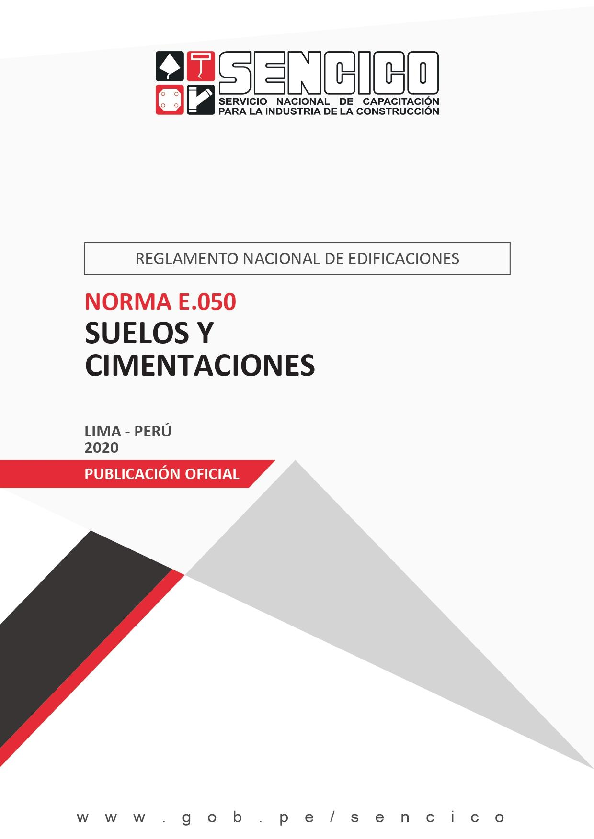 NORMA E.050 SUELOS Y CIMENTACIONES NORMA E.050 SUELOS Y CIMENTACIONES Reglamento Nacional de Edificaciones Edición: Servicio Nacional de Capacitación para la Industria de la Construcción – SENCICO Gerencia de Investigación y Normalización del SENCICO Av. De la Poesía Nº 351 San Borja, Lima - Perú Teléfono: 211 6300 anexo 2602 Primera edición digital: Diciembre de 2020 ISBN: 978-612-48427-3-3 Derechos Reservados Prohibida la Reproducción total o parcial de este libro por cualquier medio sin el permiso expreso del autor. Editado en el Perú Libro electrónico disponible en www.gob.pe/sencico. RESOLUCIÓN MINISTERIAL Nº 406 -2018-VIVIENDA Lima, 30 de noviembre del 2018 VISTOS, el Memorándum Nº 1013-2018-VIVIENDA/VMCS-DGPRCS, por el cual el Director General de la Dirección General de Políticas y Regulación en Construcción y Saneamiento hace suyo el Informe Nº 1744-2018-VIVIENDA/ VMCS-DGPRCS-DC, de la Dirección de Construcción; el Informe Nº 006-2018-CPARNE de la Comisión Permanente de Actualización del Reglamento Nacional de Edificaciones; el Acta de la Décima Quinta Sesión del Comité Técnico de Normalización de la Norma Técnica E.050 “Suelos y Cimentaciones” del Reglamento Nacional de Edificaciones; y, CONSIDERANDO Que, el artículo 6 de la Ley Nº 30156, Ley de Organización y Funciones del Ministerio de Vivienda, Construcción y Saneamiento - MVCS, establece que este Ministerio es el órgano rector de las políticas nacionales y sectoriales dentro de su ámbito de competencia, que son de obligatorio cumplimiento por los tres niveles de gobierno en el marco del proceso de descentralización y en todo el territorio nacional; tiene entre otras competencias exclusivas, dictar normas y lineamientos técnicos para la adecuada ejecución y supervisión de las políticas nacionales y sectoriales; Que, el numeral 1 del artículo 9 de la citada Ley dispone como función exclusiva del MVCS, desarrollar y aprobar tecnologías, metodologías o mecanismos que sean necesarios para el cumplimiento de las políticas nacionales y sectoriales, en el ámbito de su competencia; Que, el literal d) del artículo 82 del Reglamento de Organización y Funciones del MVCS, aprobado por el Decreto Supremo Nº 010-2014-VIVIENDA, modificado por el Decreto Supremo Nº 006- 2015-VIVIENDA señala que, la Dirección General de Políticas y Regulación en Construcción y Saneamiento - DGPRCS tiene como función proponer actualizaciones del Reglamento Nacional de Edificaciones, en coordinación con los sectores que se vinculen, en el marco de los Comités Técnicos de Normalización, según la normativa vigente; Que, el Decreto Supremo Nº 015-2004-VIVIENDA aprueba el Índice y la Estructura del Reglamento Nacional de Edificaciones - RNE, aplicable a las Habilitaciones Urbanas y a las Edificaciones, como instrumento técnico normativo que rige a nivel nacional, el cual contempla sesenta y nueve (69) Normas Técnicas; asimismo, en los artículos 1 y 3 señala que corresponde al MVCS aprobar mediante Resolución Ministerial, las normas técnicas de acuerdo al citado Índice, así como sus variaciones según los avances tecnológicos; Que, mediante Decreto Supremo Nº 011-2006-VIVIENDA se aprueba sesenta y seis (66) Normas Técnicas del RNE, comprendidas en el referido Índice y, se constituye la Comisión Permanente de Actualización del Reglamento Nacional de Edificaciones, encargada de analizar y formular las propuestas para la actualización de las Normas Técnicas; Que, con el Informe Nº 006-2018-CPARNE, el Presidente de la Comisión Permanente de Actualización del Reglamento Nacional de Edificaciones, eleva la propuesta de modificación de la Norma Técnica E.050 “Suelos y Cimentaciones” contenida en el numeral III.2 Estructuras, del Título III Edificaciones del RNE, aprobada por Decreto Supremo Nº 011-2006-VIVIENDA, la misma que ha sido materia de evaluación y aprobación por la mencionada Comisión conforme al Acta de aprobación de la Septuagésima Sesión de fecha 03 de octubre de 2018, que forma parte del expediente correspondiente; Que, mediante Resolución Ministerial Nº 346-2018-VIVIENDA se dispone la publicación del proyecto de la Norma Técnica E.050 “Suelos y Cimentaciones” del RNE, a efectos de recibir las sugerencias y comentarios de las entidades públicas, privadas y de la ciudadanía en general, dentro del plazo de tres (03) días hábiles; Que, habiendo transcurrido el señalado plazo, la Dirección de Construcción de la DGPRCS convoca al Comité Técnico de Normalización, el cual, en su Décima Quinta Sesión, realizada con fecha 22 de octubre de 2018 evalúa y acoge las sugerencias y comentarios correspondientes sobre la propuesta normativa durante la etapa de publicación del citado proyecto, conforme se advierte en el Acta suscrita en dicha Sesión y en el anexo adjunto que forma parte del expediente; Que, con el documento del visto, la Dirección General de Políticas y Regulación en Construcción y Saneamiento sustenta la propuesta de modificación de la Norma Técnica E.050 “Suelos y Cimentaciones” contenida en el Numeral III.2 Estructuras, del Título III Edificaciones del RNE, aprobada por Decreto Supremo Nº 011-2006-VIVIENDA, la cual tiene por finalidad brindar una regulación técnica adecuada en el sostenimiento de excavaciones profundas ante el crecimiento vertical de las edificaciones, situación que se presenta por la limitación de expansión horizontal; proporciona una herramienta de control para la actividad de fiscalización de los gobiernos locales; así como, garantiza la integridad física de los usuarios al incentivar edificaciones que cuenten con estructuras de sostenimiento de excavaciones y que preserven las inversiones en infraestructura a nivel nacional; Que, el citado informe indica además que el proyecto normativo incorpora lineamientos técnicos mínimos para la ejecución de estructuras de sostenimiento, desarrolla