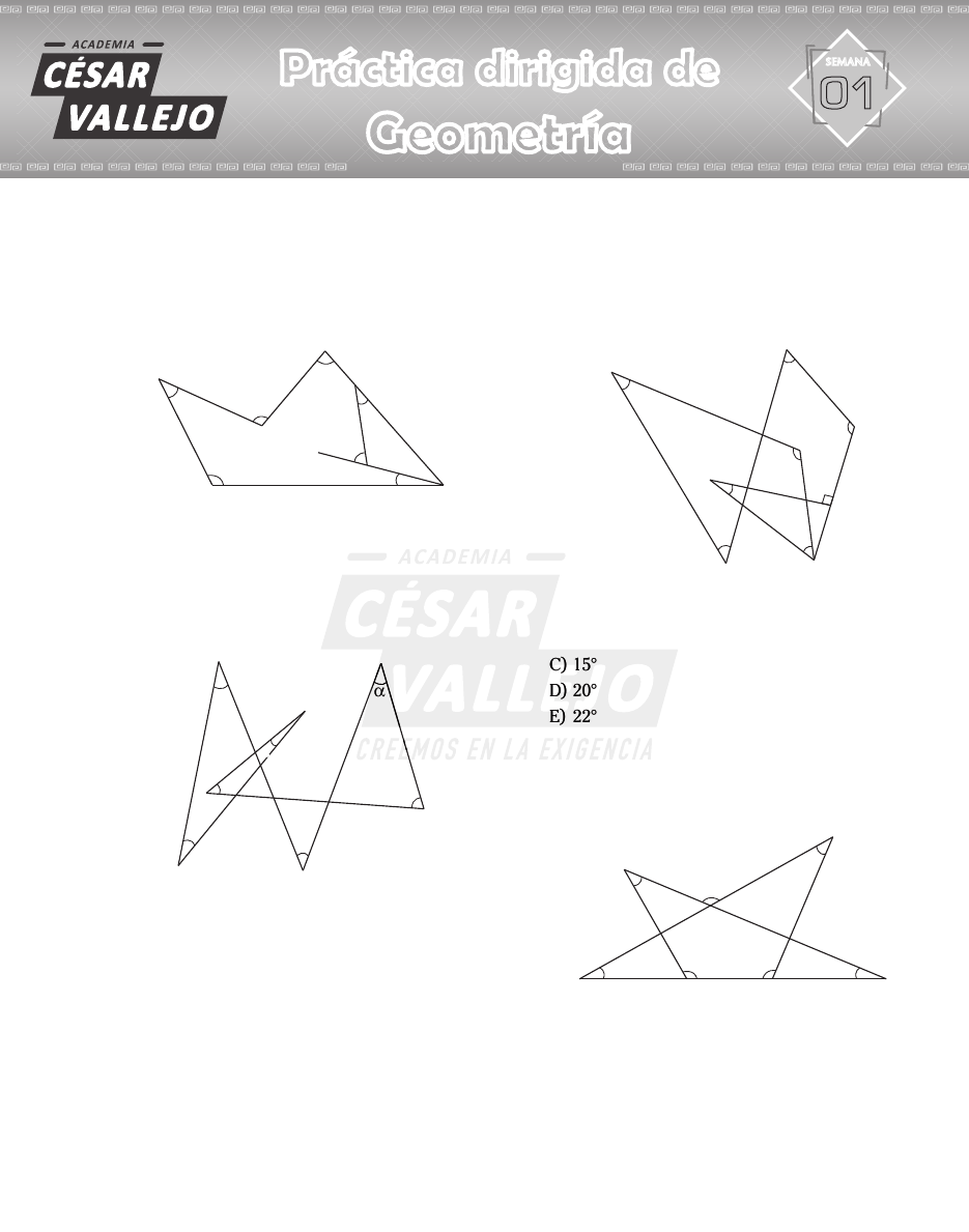 Anual UNI Geometría 1. Del gráfico, calcule x. β α α β x 2x 75° A) 32° B) 30° C) 34° D) 35° E) 40° 2. Del gráfico, calcule x. α α2x 2x 2x 3x xx A) 18° B) 22° C) 23° D) 24° E) 25° 3. En un triángulo ABC, P es un punto exterior re- lativa a AB, AC+BC=13, AP=5 y PB=6. Calcule el mayor valor entero de PC. A) 9 B) 10 C) 11 D) 12 E) 13 4. Del gráfico, calcule x, si w+a=70°. α β ω θ θ β xx A) 18° B) 19° C) 15° D) 20° E) 22° 5. Del gráfico, calcule el complemento del suple- mento x. a+b=220°. α α α 20° xx aa bb A) 30° B) 35° C) 40° D) 42° E) 45° Triángulos I AnuAl unI - 2022 - II 1 Práctica dirigida de Geometría semana 01 Academia CÉSAR VALLEJO Semana 01 6. Del gráfico, b+w<160°. Calcule el máximo va- lor entero de x. β α α θ θ ω xx A) 75° B) 76° C) 77° D) 78° E) 79° 7. Del gráfico, calcule x. β α α θ+x θ 100° 70° ββ A) 20° B) 30° C) 40° D) 50° E) 60° 01 - D 02 - A 03 - C 04 - D 05 - A 06 - E 07 - B 2