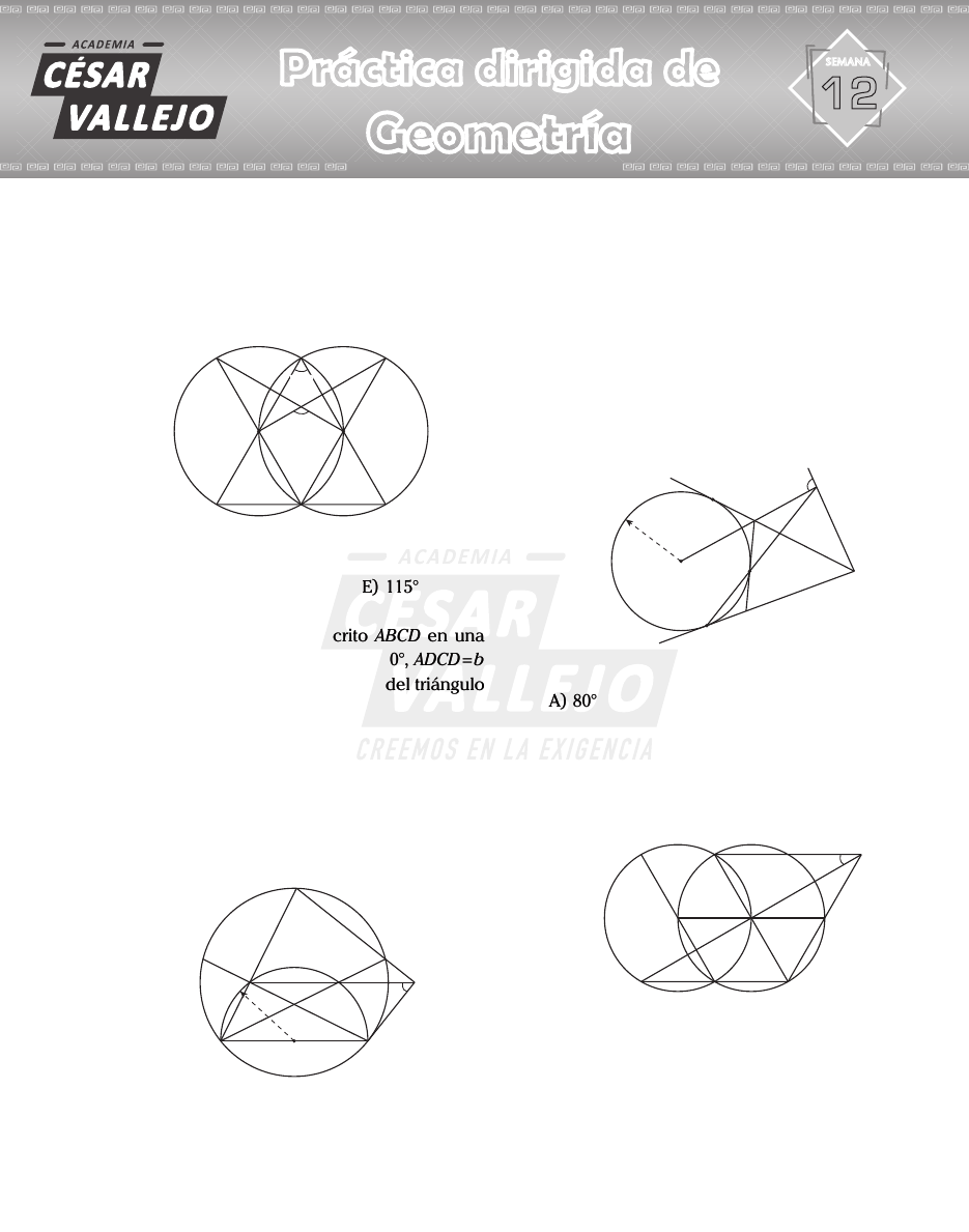 Anual UNI Geometría 1. En el gráfico mostrado, calcule x. 50°50° x A) 140° B) 120° C) 100° D) 130° E) 115° 2. En un cuadrilátero circunscrito ABCD en una circunferencia, tal que m ABC=90°, ADCD=b y m BAC=37°. Calcule el inradio del triángulo ABC. A) b B) b/2 C) 2b D) 3b/2 E) b/3 3. En el gráfico, calcule x. mAB = °80 . B A x A) 50° B) 40° C) 30° D) 60° E) 55° 4. En el gráfico, calcule x. Si A, B y C son puntos de tangencia. B C A x A) 80° B) 85° C) 90° D) 75° E) 95° 5. En el gráfico, calcule x. mAB = °70 . B x A A) 30° B) 40° C) 45° D) 35° E) 60° Cuadrilátero inscrito e inscriptible AnuAl unI - 2022 - II 1 Práctica dirigida de Geometría semana 12 Academia CÉSAR VALLEJO Semana 12 6. En un triángulo rectángulo ABC recto en B, se incribe el rectángulo BRPQ (R∈BC, Q∈AB y P∈AC). Si los inradios de los triángulos QP y PRC miden 3 y 2, respectivamente, calcule el inradio del triángulo ABC. A) 5 B) 10 C) 6 D) 8 E) 7 7. En el gráfico mostrado, calcule x. x70°70° A) 10° B) 15° C) 18° D) 20° E) 25° 01 - D 02 - A 03 - A 04 - C 05 - D 06 - A 07 - D 2