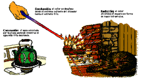 · Transferencia de calor La transferencia de calor, en física, proceso por el que se intercambia energía en forma de calor entre distintos cuerpos, o entre diferentes partes de un mismo cuerpo que están a distinta temperatura. El calor se transfiere mediante convección, radiación o conducción. Aunque estos tres procesos pueden tener lugar simultáneamente, puede ocurrir que uno de los mecanismos predomine sobre los otros dos. Por ejemplo, el calor se transmite a través de la pared de una casa fundamentalmente por conducción, el agua de una cacerola situada sobre un quemador de gas se calienta en gran medida por convección, y la Tierra recibe calor del Sol casi exclusivamente por radiación. El calor puede transferirse de tres formas: por conducción, por convección y por radiación. La conducción es la transferencia de calor a través de un objeto sólido: es lo que hace que el asa de un atizador se caliente aunque sólo la punta esté en el fuego. La convección transfiere calor por el intercambio de moléculas frías y calientes: es la causa de que el agua de una tetera se caliente uniformemente aunque sólo su parte inferior esté en contacto con la llama. La radiación es la transferencia de calor por radiación electromagnética (generalmente infrarroja): es el principal mecanismo por el que un fuego calienta la habitación. · Tipos de transferencia de calor Existen tres métodos para la transferencia de calor: conducción, convección y radiación. Conocer cada tipo y saber cómo funciona le permite entender mejor cómo los sistemas de aislamiento y burletes protegen el espacio acondicionado. Conducción. En los sólidos, la única forma de transferencia de calor es la conducción. Si se calienta un extremo de una varilla metálica, de forma que aumente su temperatura, el calor se transmite hasta el extremo más frío por conducción. No se comprende en su totalidad el mecanismo exacto de la conducción de calor en los sólidos, pero se cree que se debe, en parte, al movimiento de los electrones libres que transportan energía cuando existe una diferencia de temperatura. Esta teoría explica por qué los buenos conductores eléctricos también tienden a ser buenos conductores del calor. En 1822, el matemático francés Joseph Fourier dio una expresión matemática precisa que hoy se conoce como ley de Fourier de la conducción del calor. Esta ley afirma que la velocidad de conducción de calor a través de un cuerpo por unidad de sección transversal es proporcional al gradiente de temperatura que existe en el cuerpo (con el signo cambiado). El factor de proporcionalidad se denomina conductividad térmica del material. Los materiales como el oro, la plata o el cobre tienen conductividades térmicas elevadas y conducen bien el calor, mientras que materiales como el vidrio o el amianto tienen conductividades cientos e incluso miles de veces menores; conducen muy mal el calor, y se conocen como aislantes. En ingeniería resulta necesario conocer la velocidad de conducción del calor a través de un sólido en el que existe una diferencia de temperatura conocida. Para averiguarlo se requieren técnicas matemáticas muy complejas, sobre todo si el proceso varía con el tiempo; en este caso, se habla de conducción térmica transitoria. Con la ayuda de ordenadores (computadoras) analógicos y digitales, estos problemas pueden resolverse en la actualidad incluso para cuerpos de geometría complicada. Convección. Si existe una diferencia de temperatura en el interior de un líquido o un gas, es casi seguro que se producirá un movimiento del fluido. Este movimiento transfiere calor de una parte del fluido a otra por un proceso llamado convección. El movimiento del fluido puede ser natural o forzado. Si se calienta un líquido o un gas, su densidad (masa por unidad de volumen) suele disminuir. Si el líquido o gas se encuentra en el campo gravitatorio, el fluido más caliente y menos denso asciende, mientras que el fluido más frío y más denso desciende. Este tipo de movimiento, debido exclusivamente a la no uniformidad de la temperatura del fluido, se denomina convección natural. La convección forzada se logra sometiendo el fluido a un gradiente de presiones, con lo que se fuerza su movimiento de acuerdo a las leyes de la mecánica de fluidos. Supongamos, por ejemplo, que calentamos desde abajo una cacerola llena de agua. El líquido más próximo al fondo se calienta por el calor que se ha transmitido por conducción a través de la cacerola. Al expandirse, su densidad disminuye y como resultado de ello el agua caliente asciende y parte del fluido más frío baja hacia el fondo, con lo que se inicia un movimiento de circulación. El líquido más frío vuelve a calentarse por conducción, mientras que el líquido más caliente situado arriba pierde parte de su calor por radiación y lo cede al aire situado por encima. De forma similar, en una cámara vertical llena de gas, como la cámara de aire situada entre los dos paneles de una ventana con doble vidrio, el aire situado junto al panel exterior —que está más frío— desciende, mientras que al aire cercano al panel interior —más caliente— asciende, lo que produce un movimiento de circulación. El calentamiento de una habitación mediante un radiador no depende tanto de la radiación como de las corrientes naturales de convección, que hacen que el aire caliente suba hacia el techo y el aire frío del resto de la habitación se dirija hacia el radiador. Debido a que el aire caliente tiende a subir y el aire frío a bajar, los radiadores deben colocarse cerca del suelo (y los aparatos de aire acondicionado cerca del techo) para que la eficiencia sea máxima. De la misma forma, la convección natural es responsable de la ascensión del agua caliente y el vapor en las calderas de convección natural, y del tiro de las chimeneas. La convección también determina el movimiento de las grandes masas de aire sobre l