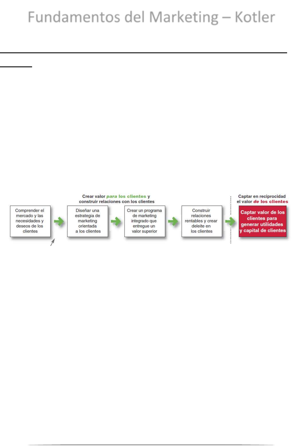 1 Fundamentos del Marketing – Kotler Capítulo 1 – Marketing: Generación y captación del valor del cliente ¿Qué es marketing? Definición de marketing Es un proceso mediante el cual las empresas crean valor para sus clientes y generan fuertes relaciones con ellos para, en reciprocidad, captar el valor de sus clientes. Consiste en acciones para crear, mantener y hacer crecer las relaciones deseables de intercambio con públicos meta que impliquen un producto, un servicio, una idea u otro objeto. Las empresas desean construir relaciones fuertes entregando al cliente, de manera consistente, un valor superior. El proceso de marketing En los primeros cuatro, las empresas trabajan para entender a los consumidores, generar valor del cliente y construir fuertes relaciones con los clientes. Al crear valor para los clientes, a su vez captan valor de los clientes que toma la forma de ventas, utilidades y capital de clientes a largo plazo. Comprensión del mercado y de las necesidades del cliente Como primer paso, se necesita comprender las necesidades y deseos de los clientes y del mercado en el cual operan. Cinco conceptos fundamentales del cliente y del mercado: 1) necesidades, deseos y demandas; 2) ofertas de mercado (productos, servicios y experiencias); 3) valor y satisfacción; 4) intercambios y relaciones; y 5) mercados. Necesidades, deseos y demandas de los clientes Las necesidades humanas son estados de carencia percibida. Incluyen las necesidades físicas de comida, vestido, calor y seguridad; las necesidades sociales de pertenencia y afecto; y las necesidades individuales de conocimiento y autoexpresión. Los deseos son la forma que toman las necesidades humanas a medida que son procesadas por la cultura y la personalidad individual. Un estadounidense necesita comida, pero desea una Big Mac. Los deseos son moldeados por la sociedad y se describen en términos de los objetos que satisfarán esas necesidades. Cuando están respaldados por el poder de compra, los deseos se convierten en demandas. Dados sus deseos y recursos, las personas demandan productos con beneficios que se suman para el máximo valor y satisfacción. Ofertas de mercado: productos, servicios y experiencias Las necesidades y los deseos de los consumidores son satisfechos mediante ofertas de mercado, una combinación de productos, servicios, información o experiencias que se ofrecen a un mercado para satisfacer una necesidad o un deseo. Las ofertas de mercado no se limitan a productos físicos; incluyen también servicios. Muchos vendedores cometen el error de poner más atención en los productos específicos que ofrecen que en los beneficios y experiencias derivados de esos productos. Estos vendedores sufren de lo que se denomina miopía de marketing. Pierden de vista las necesidades subyacentes de los clientes. Se olvidan de que un producto es solamente una herramienta para resolver un problema del consumidor. 2 Valor y satisfacción del cliente Los clientes se forman expectativas sobre el valor y la satisfacción que les entregarán las varias ofertas de mercado y realizan sus compras de acuerdo con ellas. Los clientes insatisfechos con frecuencia cambian y eligen productos de la competencia, y menosprecian el producto original ante los demás. Mercados Un mercado es el conjunto de todos los compradores reales y potenciales de un producto o servicio. Estos compradores comparten una necesidad o deseo particular que puede ser satisfecho a través de relaciones de intercambio. Los vendedores deben buscar compradores, identificar sus necesidades, diseñar ofertas de mercados, fijarles precio, promoverlas, almacenarlas y entregarlas. Actividades tales como la investigación del consumidor, el desarrollo de productos, son algunas actividades centrales de marketing. Cada parte en este sistema se ve afectada por las principales fuerzas ambientales (demográficas, económicas, naturales, tecnológicas, políticas y socioculturales). Cada parte dentro del sistema agrega valor para el siguiente nivel Diseño de una estrategia de marketing orientada a los clientes Dirección de marketing como el arte y ciencia de elegir mercados meta y construir relaciones redituables con ellos. Para diseñar una estrategia de marketing exitosa, el gerente de marketing debe responder a dos importantes preguntas: ¿A qué clientes atenderemos (cuál es nuestro mercado meta)? y ¿Cómo podemos atender a estos clientes de la mejor manera (cuál es nuestra propuesta de valor)? Elección de los clientes a quienes se servirá La empresa debe primero decidir a quién va a servir. Esto lo lleva a cabo dividiendo el mercado en segmentos de clientes (segmentación del mercado) y eligiendo a cuáles segmentos se va a dirigir (selección de mercado meta). Elección de la propuesta de valor La empresa también debe decidir cómo atenderá a los clientes a los que se dirige: cómo se diferenciará y se posicionará en el mercado. La propuesta de valor de una marca es el conjunto de beneficios o valores que promete entregar a los consumidores para satisfacer sus necesidades. Orientaciones de la dirección de marketing La dirección de marketing desea diseñar estrategias que generen relaciones rentables con sus clientes meta. Existen cinco conceptos alternos bajo los cuales las organizaciones diseñan y llevan a cabo sus estrategias de marketing: los conceptos de producción, de producto, de ventas, de marketing y de marketing social. Concepto de producción Sostiene que los consumidores favorecerán a los productos que están disponibles y que son muy asequibles. El concepto de producto Sostiene que los consumidores favorecerán a los productos que ofrezcan la mayor calidad, el mejor desempeño y las características más innovadoras. La estrategia de marketing se enfoca en realizar mejoras continuas al producto. El concepto de ventas Muchas empresas siguen el concepto de ventas; el cual sostiene que los consumidores no comprarán suficientes producto