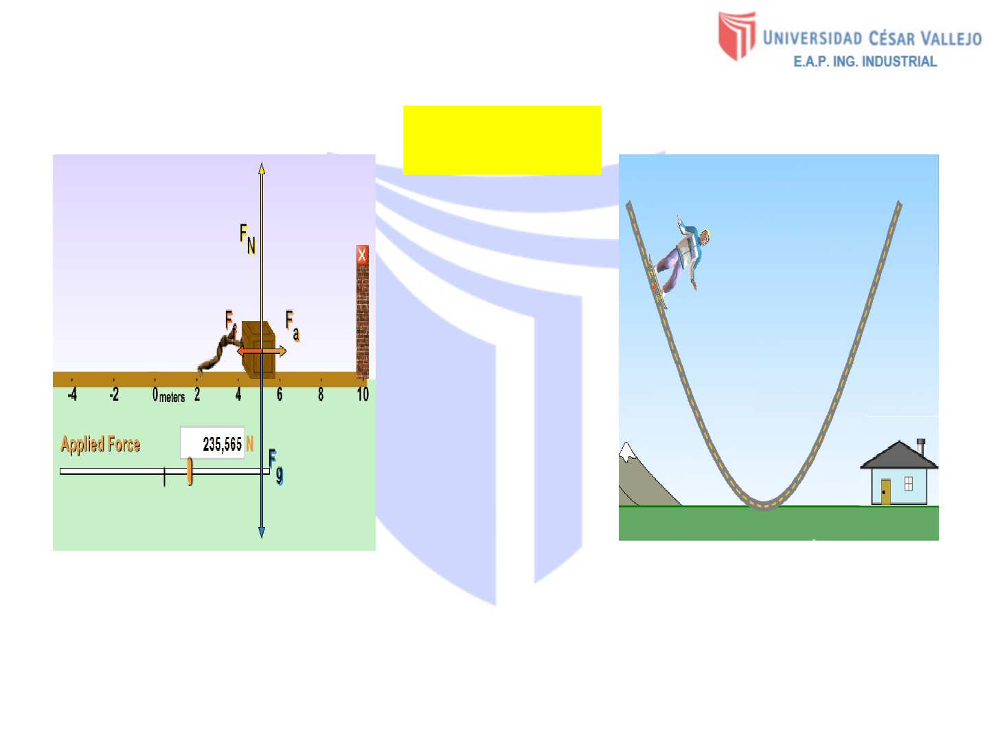28/09/2020 1 SESIÓN: 5 FÍSICA Mg. Antenor Leva ENERGIA TRABAJO 1 2 Trabajo de una fuerza. Para una fuerza constante paralela al desplazamiento que es rectilíneo, se define el trabajo como: B Movimiento Trabajo=Fuerza distancia Si la fuerza constante forma un ángulo con la dirección del desplazamiento, solo la componente en la dirección del desplazamiento se usa para calcular el trabajo A Movimiento B Como Producto escalar Si = 90º W = 0 Si 90º 0º W 0 Si 180º90º W 0 A 28/09/2020 3 Fuerza Conservativa: depende sólo de los puntos inicial y final y no del camino seguido para llegar de uno a otro A Movimiento B Sólo las fuerzas conservativas dan lugar a la energía potencial. El cálculo del trabajo realizado por fuerzas conservativas se reduce a una simple resta: El trabajo realizado por las fuerzas conservativas a lo largo de un camino cerrado es cero Cuando movemos un cuerpo venciendo una fuerza conservativa que se opone, el trabajo realizado aumenta la energía potencial del cuerpo Las fuerzas conservativas conservan la energía mecánica del sistema (por ejemplo la fuerza gravitatoria) 4 Si la trayectoria de la partícula no es rectilínea y/o la fuerza que actúa es variable, se divide la trayectoria en pequeños elementos rectilíneos para los cuales la fuerza es constante. Llamando a uno de estos desplazamientos elementales como: Trayectoria Recta tangente A B El trabajo elemental hecho por la fuerza durante ese desplazamiento es Como Como El trabajo total hecho sobre la partícula es la suma de los trabajos elementales realizados en los pequeños desplazamientos a lo largo de la trayectoria Si los desplazamientos son muy pequeños la suma se puede reemplazar por una integral A B Trabajo de una fuerza. 4 5 Trabajo de una fuerza conservativa. Energía potencial. Trabajo de una fuerza constante. Sea una partícula que se mueve bajo la acción de una fuerza constante en módulo y dirección. El trabajo realizado por ésta será (1) (2) Como la fuerza es constante También se puede expresar El trabajo es igual para las trayectorias (1) ó (2) al ir de A hasta B. El trabajo es igual a la diferencia de una cierta cantidad evaluada al final y al principio de la trayectoria. Para una fuerza constante como el peso se tiene A B A B 5 6 Trabajo de una fuerza conservativa. Energía potencial. Relación entre fuerza y energía potencial. Para que se cumpla es necesario que par un desplazamiento elemental esté relacionado con el cambio de energía potencial a través de Las componentes de las fuerzas a lo largo de los ejes coordenados vienen dadas a través de Si Ep solo depende de la distancia r a un punto fijo y no de la dirección, la única componente de la fuerza está definida en la dirección en que r aumenta o disminuye (se trata de una fuerza central), y se tiene que 6 7 Teorema de la energía mecánica. Conservación de la energía mecánica. Cuando la fuerza que actúa sobre una partícula es conservativa se cumple que Definiendo la energía mecánica o energía total de la partícula como Si la fuerza que actúa es conservativa Los cambios de energía cinética y potencial son iguales y opuestos Cuando sobre la partícula actúan fuerzas conservativas y no conservativas se tiene Cuando la fuerza que actúa es consevativa la energía total permanece constante Principio de conservación de la energía Cuando las fuerzas que actúan son consevativas y no conservativas, el trabajo de las no conservativas es igual a la variación de la energía total Teorema de la energía mecánica 7 Ejercicio 1. Una caja de es tirada a lo largo del piso por una persona que ejerce una fuerza constante de formando un ángulo de 37° con la horizontal. La superficie es áspera y ejerce una fuerza de roce de . Calcule el trabajo efectuado por cada fuerza que actúa sobre la caja, el trabajo neto y el coeficiente de rozamiento cinético. 8 Ejercicio 2. Un granjero engancha su tractor a un trineo cargado con leña y lo arrastra 20 m sobre el suelo horizontal (figura 6.7a). El peso total del trineo y la carga es de 14,700 N. El tractor ejerce una fuerza constante de 5000 N a 36.98 sobre la horizontal, como se indica en la figura adjunta. Una fuerza de fricción de 3500 N se opone al movimiento del trineo. Calcule el trabajo realizado por cada fuerza que actúa sobre el trineo y el trabajo total de todas las fuerzas. 28/09/2020 9 Ejercicio 3. Un hombre que limpia un piso jala una aspiradora con una fuerza de magnitud F = 50.0 N en un ángulo de 30.0° con la horizontal (figura adjunta). Calcule el trabajo consumido por la fuerza sobre la aspiradora a medida que esta se desplaza 3.00 m hacia la derecha. 28/09/2020 10 28/09/2020 11 Ejercicio 4. Un bloque se mueve hacia arriba por un plano inclinado 30º bajo la acción de las tres fuerzas que se muestran en la figura adjunta. F1 es horizontal y de 40 N de magnitud. F2 es normal al plano y de 20 N de magnitud. F3 es paralela al plano y de 30 N de magnitud. Determine el trabajo realizado por cada una de las fuerzas, cuando el bloque (y el punto de aplicación de cada fuerza) se mueve 80 cm hacia arriba del plano inclinado. 29/09/2020 12 Ejercicio 5. Un cuerpo de 300 g se desliza 80 cm a lo largo de una mesa horizontal. ¿Cuánto trabajo se realiza para superar la fricción entre el cuerpo y la mesa, si el coeficiente de fricción cinética es 0.20?. 28/09/2020 13 Ejercicio 6. La posición de una partícula en el plano está dada por: r=3ti-2t2j , (t en segundos, r en metros), la fuerza ejercida sobre la misma es F=4i-5j (Newton) ¿Qué trabajo se realiza sobre la partícula en el intervalo de t = l s a t = 3 s? 28/09/2020 14 Ejercicio 7. Una fuerza que actúa sobre una partícula varia con x como se muestra en la figura adjunta. Calcule el trabajo consumido por la fuerza en la partícula conforme se traslada de x = 0 a x = 6.0 m. 15 Teorema de Trabajo y la Energía cinética. Para un cuerpo que se mueve en una trayectoria curvilínea, la componente de la
