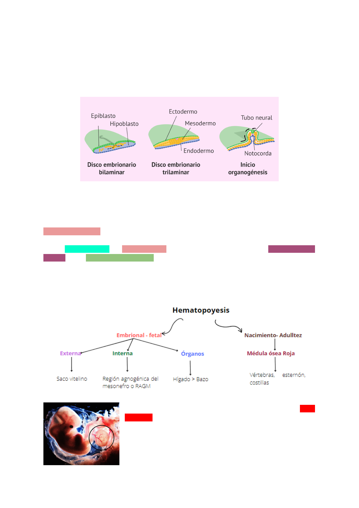 REPASO PARA EXAMEN HEMATOLOGÍA PRIMER DÍA DE CURSO La gestación dura 266 días, la etapa germinal abarca 2 semanas, la embrionaria de 3-8 semanas y la fetal a partir de las 8 semanas. De la capa trilaminar (endodermo, mesodermo y ectodermo), es en el mesodermo donde comienza la hematopoyesis (formación de céluas sanguíneas) MESODERMO---> HISTOBLASTOS ---> SANGRE -----> VASOS SANGUÍNEOS HEMATOPOYESIS En la etapa prenatal la hematopoyesis tiene lugar en el saco vitelino (hematopoyesis externa) y la hematopoyesis interna sucede en la región agnogénica del mesonefro o RAGM (que es un pequeño tubo cardiaco), la hematopoyesis es seguida después por el hígado, bazo y en menor cantidad la médula ósea. Los islotes sanguíneos se empiezan a formar en el saco vitelino. El saco vitelino es una membrana fuera del embrión que está conectada a la abertura umbilical de intestino medio del embrión. El saco vitelino primero para la formación de la sangre y con el tiempo, se incorpora en el intestino primitivo del embrión. ● El transporte de gases en la hematopoyesis extraembrional es llevada a cabo por los eritroblastos, además de macrófagos. Los eritroblastos contienen glicoforina A o CD235, que al ser una proteína de transmembrana sirve como precursor de los antígenos de los grupos sanguíneos. ● La región angiogénesis del mesodermo (corazón) va después del saco vitelino . ● Hay diferenciación de GB ● Las angiotensinas como la eritropoyetina, trombopoyetina (en hígado y riñón) y leucopoyetina ayudan al proceso de vascularización. DESARROLLO ÓSEO La fusión de macrófago + macrófago da lugar a osteoclastos que a su vez darán paso a células multinucleadas que perforan la cavidad medular. Existen 2 tipos de mecanismos de formación de huesos, la Osificación endocondral o la intramembranosa. ● OSIFICACIÓN ENDOCONDRAL Genera a los huesos largos y para ello se necesita de un “molde” de cartílago, el cartílago está formado por células llamadas condrocitos. El cartílago es progresivamente sustituído por hueso. ● OSIFICACIÓN INTRAMEMBRANOSA Ésta consiste en la deposición de hueso sobre una base de tejido mesenquimal primitivo. Los huesos para desarrollarse también necesitan de una serie de factores de crecimiento, entre ellos se encuentran los RANK y los OPG ● HEMANGIOBLASTOS: son células mesodérmicas embrionarias que originan el endotelio vascular y a las células formadoras de sangre ● ¿Cuando hay fagocitosis en sangre periférica? cuando hay un coágulo, ya que las células del SI o del pull marginal se encuentran ahí atoradas y pueden fagocitar a las cosas dañinas que se encuentren en el coágulo ● Nicho o microambiente celular: son aquellas condiciones dentro y fuera de la médula necesarias para que las células se queden ahí hasta ser lo suficientemente maduras y salir a SP. DESARROLLO DE LA SERIE ERITROIDE Proeritroblasto Nucleo de gran tamaño, tiene granulocitos, cromatina laxa (preparación par la síntesis de proteínas). La parte blanca que se observa es el Aparato de Golgi. Citoplasma muy basófilo 1 División por mitosis que da lugar a 2 eritroblastos basófilos. Eritroblasto basófilo Casi no se ven sus núcleos, cromatina laxa Citoplasma azul oscuro (basófilo) Aparato de Golgi Tiene 2 divisiones mitóticas, por lo que da lugar a 4 eritroblastos policromáticos Eritroblasto policromático Reduce su tamaño Citoplasma sucio (ni zul ni rosado) esto debido al aumento de Hb Comienza a condensarse la cromatina Tine 2 divisiones mitóticas que por lo que se da lugar a 8 eritroblastos ortocromáticos Eritroblasto ortocromático Núcleo picnótico y cercano al eritrocito maduro. Citoplasma que va de un azul a un color salmón. cromatina totalmente condensada Reticulocito Núcleo ausente, esto por su expulsión en los sinusoides venosos (o capilares que irrigan la médula ósea) Citoplasma de azul a salmón que puede contener restos de ARN. Sin forma definida. ● Miden de 8 - 9 micras ● Semi redondos, redondos ● Permanecen de 2-4 días en la médula ósea ● Permanecen 1 día en SP antes de madurar a eritrocitos Eritrocito ● Mide de 7-8 micras ● Disco bicóncavo ● Sin núcleo ● Volumen promedio de 90-95 fL ● Flexible ● No de células : 4.5 * 10^6 - 5.5 * 10^6 ● Vida media: 120 días ● Hto: 45% ● Hb: 13-17 dL Anotaciones extra: ERITROPOYETINA O EPO La EPO activa a los cromosomas 11 y 16, los responsables de la síntesis de las globinas en la hemoglobina, y posteriormente formar el grupo HEME. También sirve para vestibular el desarrollo de proeritroblastos a eritroblastos, a eritroblasto policromático a eritroblas ortocrómico a reticulocito y finalmente a eritrocito. Cuando se detectan cantidades muy bajas de producción de eritrocitos el riñón puede producir EPO (eritropoyetina inducible) debido a hipoxia, el hígado también es capaz de producir EPO. HEMOGLOBINA DAÑOS EN LAS ESPECTRINAS: Unión horizontal: Se rompen enlaces del citoesqueleto y causa forma de heliptocitos Unión vertical: forma esferocitos debido al desprendimiento de la membrana Bicapa externa: causa acantocitos Ambas bicapas: causa equinocitos Enfermedad causada por alteraciones de la membrana: hemoglobina paroxística nocturna: los GR se descomponen de manera anticipada debido a un defecto en su membrana, es una enfermedad de tipo genética y las crisis suelen suceder en la noche. HIERRO ● Criptas de lieberkühn: se encuentran en el intestino delgado, ahí se absorber hierro en receptores de membrana con perrideructasa para pasar de Fe 3+ a Fe2+ ● Ferritina: permite el almacenamiento de Fe3+, puede contener aprox 4000 moléculas de Fe ● Ferroportina: inhibe la salida del Fe . Es considerada una bomba biológica de hierro situada en el epitelio intestinal y en la membrana de los macrófagos, su función es la de transportar hierro desde la célula intestinal al plasma y desde el macrófago al eritrón. ● Hepsidina: se encuen