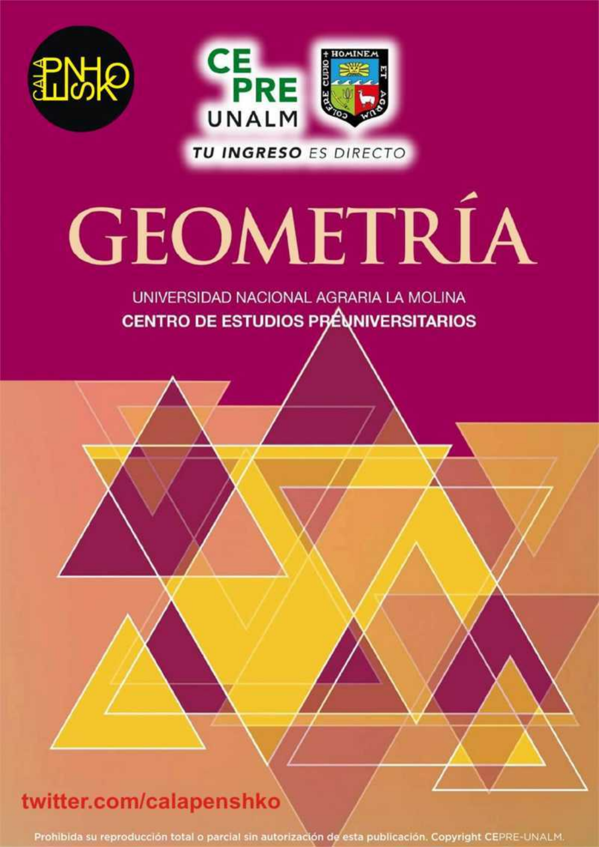TU INGRESO ES DIRECTO GEOMETRÍA IDO ON eii le ANOS hs +, 4 a (<A > EAN Mal ele Ma a autorización A CE PRE Tu futuro empieza UNALM con nosotros TU INGRESO ES DIRECTO 02 Prohibida su reproducción total o parcial sin autorización de esta publicación. Copyright CEPRE-UMALM, CE PRE Tu futuro empieza UNALM con nosotros TU INGRESO ES DIRECTO Par LLE al CE PRE UNALM TU INGRESO ES DIRECTO GEOMETRÍA Josué Alata Rey Sandro Alencastre Calderón Antonio Gutiérrez Curl Carlos Gutiérrez Curi Zelideth Pérez Torres Dandy Rueda Castillo Angel Salazar Minaya Ll Roni Roca Meneses - == — — 03 Prohibida su reproducción total o parcial sin autorización de esta publicación. Copyright CEPRE-UMALM, Tu futuro empieza con nosotros TU INGRESO ES DIRECTO y all LA E da STATE CE ” A Universidad Nacional Agraria La Molina Rector Dr. ENRIQUE FLORES MARIAZZA Vicerrector Académico Dr. JorcGeE ALARCÓN Novoa Vicerrectora de Investigación Dra. CARMEN VELEZMORO SÁNCHEZ CE PRE UNALM TU INGRESO ES DIRECTO Centro de Estudios Preuniversitarios Director I | Ma. Víctor TrEJO CADILLO | | Jefe de la Unidad Académica | M6. TEÓFILO CHIRE MURILLO Jefe de la Unidad Administrativa IG. MiGuUEL DELGADO GARCÍA Edición 2019 GEOMETRÍA Soxta revisión: Sandro Alencastre Calderón Universidad Nacional Agraria La Molina Impreso por : GRÁFICA BRACAMONTE Centro de Estudios Preuniversitarios Gustavo Adolfo Bracamonte Heredia Jr, Almirante Guisse 939 - Jesús María Calle Eloy Ureta N* 076 ] Teléfono: 433-5131 / 330-7010 / 330-8434 Urb. El Mercurio - San Luis - Lima e-mail: prelamolinaíMlamolina.edu.pe Telf.: 326-5361 / Lima 30 - Perú ventas/Dbracamonte.com.pe Novena reimpresión, diciembre de 2019 Tiraje; 1000 ejemplaros impreso en 6l Perú / Printed in Peru : Derechos reservados. Prohibida su reproducción 1otal o parcial sin permiso del editor. ISBN: 978-612-45966-4-3 Hecho el Depósito Legal en la Biblioteca Nacional del Perú N”: 2019.13412 04 Prohibida su reproducción total o parcial sin autorización de esta publicación. Copyright CEPRE-UMALM. Tu futuro empieza UNALM con nosotros TU INGRESO ES DIRECTO ÍNDICE Presentación 3 Introducción 10 UNIDAD 1 CONCEPTOS Y PRINCIPIOS FUNDAMENTALES Qué es la geometria? 12 Términos no definidos en geometria: Punto, recta y plano 12 Algunos postulados 13 Algunas definiciones iniciales 13 Angulos 15 Resumen 20 Ejercicios resueltos 21 Ejercicios propuestos 130 UNIDAD 2 EL TRIÁNGULO Triángulos 36 Teoremas básicos del triángulo 38 Lineas y puntos notables del triángulo 41 Casos particulares 44 Ángulos formados por lineas notables 44 Resumen Y7 Ejercicios resueltos 48 Ejercicios propuestos 57 UNIDAD 3 CONGRUENCIA DE TRIÁNGULOS Congruencia de triángulos 69 Postulados de congruencia de triángulos 69 Teoremas de la congruencia de triángulos 70 Resumen 73 Ejercicios resueltos 74 Ejercicios propuestos 83 UNIDAD 4 POLÍGONOS - Conjuntos convexos y no convexos 89 - Poligonos 89 Clasificación de los poligonos 90 Fórmulas para polígonos convexos 92 O5 Prohibida su reproducción total o parcial sin autorización de esta publicación. Copyright CEPRE-UMALM, Tu futuro empieza con nosotros TU INGRESO ES DIRECTO Resumen 94 Ejercicios resueltos 95 Ejercicios propuestos 100 UNIDAD 5 CUADRILÁTEROS Cuadriláteros 106 Clasificación 106 Resumen 110 Ejercicios resueltos 111 Ejercicios propuestos 117 UNIDAD 6 LA CIRCUNFERENCIA La Circunferencia 123 Angulos en la Circunferencia 124 Posiciones Relativas de dos Circunferencias 126 Propiedades de la Circunferencia 128 Teoremas de la Circunferencia 130 Resumen 132 Ejercicios resueltos 133 Ejercicios propuestos 138 UNIDAD 7 PROPORCIONALIDAD Y SEMEJANZA DE TRIÁNGULOS Proporcionalidad 150 Semejanza de triángulos 152 Resumen 155 Ejercicios resueltos 156 Ejercicios propuestos 162 UNIDAD 8 RELACIONES MÉTRICAS Relación métrica 168 Proyacciones 168 Relaciones métricas en el triángulo rectángulo 169 Aplicación en la semicircunferencia 170 Relaciones métricas en el triángulo oblicuángulo 171 Identificación del tipo de triángulo mediante conceptos de relaciones métricas 173 Relaciones métricas en la circunferencia 173 Resumen 174 - Ejercicios resueltos 174 Ejercicios propuestos 181 06 Prohibida su reproducción total o parcial sin autorización de esta publicación. Copyriaht CEPRE-UMALM, Tu futuro empieza con nosotros TU INGRESO ES DIRECTO UNIDAD 9 SUPERFICIE PLANA Superfifie y área 193 Área de la región triangular 193 Area de la región cuadrangular 199 Area de la región circular 202 Resumen 204 Ejercicios resueltos 205 Ejercicios propuestos 210 UNIDAD 10 GEOMETRÍA DEL ESPACIO Geometría del Espacio 222 Rectas y planos en el espacio 22 Sólidos geométricos 225 Poliedros regulares 225 Prisma 227 Cilindro de revolución 228 Pirámide 228 Cono de revolución 230 Esfera 231 Resumen 232 Ejercicios resueltos 233 Ejercicios propuestos 239 UNIDAD 11 TRONCO DE SÓLIDOS Intersección de una pirámide por un plano paralelo a su base 257 Tronco de pirámide de bases paralelas 259 Tronco de cono de bases paralelas 261 Tronco de prisma 263 Tronco de cilindro 265 Resumen 266 Ejercicios resueltos 267 Ejercicios propuestos 274 BIBLIOGRAFÍA 281 CLAVES DE EJERCICIOS PROPUESTOS 282 07 Prohibida su reproducción total o parcial sin autorización de esta publicación. Copyright CEPRE-UMALM, Tu futuro empieza con nosotros TU INGRESO ES DIRECTO INTRODUCCIÓN Desde sus inicios, la Geometria ha sido un curso determinante para el aprendizaje y dominio de las matemáticas, puesto que su estudio se basa en: conceptos, demostraciones, análisis, construcción de figuras y/o trazos auxiliares, El objetivo principal de este libro es de ayudar a los estudiantes a incrementar su capacidad de análisis en las matemáticas, de tal manera que durante su vida universitaria estén familiarizados con la investigación y resolución de los diversos problemas que se les presente. Este libro consta de un marco teórico, un resumen, problemas resueltos y problemas p