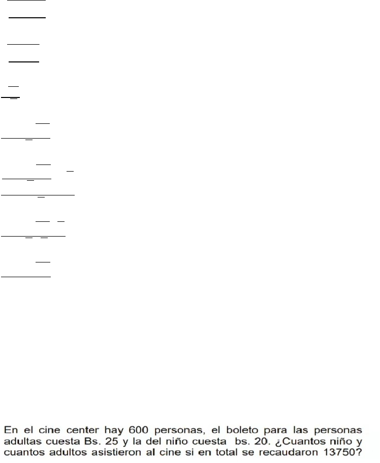 ANÁLISIS MATEMÁTICO Resolver los siguientes ejercicios en cuanto análisis matemático: E-1.- E-2.- E-3.- Asisten 300 adultos y 400 niños a: cantidad de adultos n: cantidad de niño Al cine asiste un total de 600 personas: a + n = 600 Despejado a n: n = 600 - a adultos pagas 25 Bs niños 20 Bs se recauda en total 13750 Bs: 25a + 20n = 13750 Sustituyendo "n": 25a + 20 * (600 - a) = 13750 25a + 12000 - 20a = 13750 5a = 13750 - 12000 5a = 1750 a = 1750/5 a = 350 La cantidad de niños es: n = 600 - 350 n = 250 Asisten 350 adultos y 250 niños E-4.- E-5.-