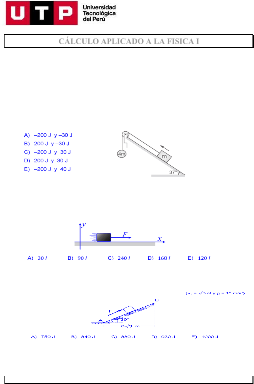 1 Cálculo aplicado a la Física I CÁLCULO APLICADO A LA FISICA I TRABAJO MECÁNICO 1. Un bloque de 2 kg de masa está inicialmente en reposo sobre un plano horizontal liso. Se aplica una fuerza horizontal constante durante 10 s y el bloque adquiere una rapidez de 4 m/s. ¿Cuál es el trabajo desarrollado por ésta fuerza? 2. En la figura mostrada la esfera se desplaza 5m, determine el trabajo realizado por la fuerza gravitacional que actúa sobre el cuerpo de masa 4m y m respectivamente sabiendo que m = 1kg( Desprecie todo tipo de rozamiento)(g = 10m/s2) 3. Se llama trabajo mecánico desarrollado por una fuerza cuando ésta logra modificar el estado de movimiento que tiene un cuerpo. Consideremos el caso de una fuerza variable dada por la siguiente ecuación F = 10 +5x, donde F en newton y x en metros. De la figura determine la cantidad de trabajo realizado por la fuerza F desde x= 2m hasta x= 6m 4. En la figura el bloque de 8kg se desplaza lentamente(v= cte) a lo largo del plano inclinado rugoso por acción de la fuerza constante F. Determinar el trabajo desarrollado por la fuerza F al trasladar el bloque desde A hasta B 5. Si la fuerza que actúa sobre una partícula de masa de 2kg es F(x) = (8x-16) N, donde x se expresa en metros. Determine el trabajo realizado por una fuerza sobre la partícula conforme se traslada de x= 0 m a x = 4m. Considere el movimiento en la dirección del eje “ x” https://1.bp.blogspot.com/-_e8XzJwcqf4/XJqrTyk4pYI/AAAAAAAAC68/f7DAd2LJkrITyk4a8-mu2YNnXGbyfPeogCLcBGAs/s1600/TRABAJO%2BMECANICO%2BEJERCICIOS%2BRESUELTOS%2BDE%2BFISICA%2BDE%2BSECUNDARIA%2BY%2BPREUNIVERSITARIA%2B%25288%2529.gif https://1.bp.blogspot.com/-_e8XzJwcqf4/XJqrTyk4pYI/AAAAAAAAC68/f7DAd2LJkrITyk4a8-mu2YNnXGbyfPeogCLcBGAs/s1600/TRABAJO+MECANICO+EJERCICIOS+RESUELTOS+DE+FISICA+DE+SECUNDARIA+Y+PREUNIVERSITARIA+%288%29.gif https://4.bp.blogspot.com/-LWy-Ks-JEDY/XJqrMBVSUbI/AAAAAAAAC50/QXQPDoRfUrwGPWDPpOFDrpW3z6ZxKcdTACLcBGAs/s1600/TRABAJO%2BMECANICO%2BEJERCICIOS%2BRESUELTOS%2BDE%2BFISICA%2BDE%2BSECUNDARIA%2BY%2BPREUNIVERSITARIA%2B%252811%2529.gif 2 Cálculo aplicado a la Física I 6. Una persona utiliza una cuerda para arrastrar una caja de 26kg de masa sobre una superficie rugosa, tal como se muestra en la figura. Determine el trabajo realizado por la persona al desplazar la caja con velocidad constante una distancia de 10m. 7. Se lanza un ladrillo horizontalmente sobre una superficie rugosa con rapidez inicial de 10m/s, tal como se muestra en la figura. Si la masa del ladrillo es de 4kg, determine el trabajo realizado por la fuerza de rozamiento cinético sobre el ladrillo hasta el instante en que se detiene 8. Dos bloques de masas 2kg y 3kg respectivamente, están unidos por una cuerda y se deslizan horizontalmente sobre una superficie lisa bajo la acción de una fuerza externa de 20N de magnitud, tal como se muestra en la figura. Si el sistema parte del reposo, determine el trabajo neto realizado sobre el bloque de masa 3kg durante los dos primeros segundos de su movimiento. 9. La grafica muestra la dependencia de la magnitud de una fuerza variable F en función de la posición. Determine el trabajo realizado por esta fuerza cuando actúa sobre una partícula de 2kg desde la posición x = 0 hasta la posición x = 9m. https://3.bp.blogspot.com/-bGI9qsMicGw/XJqrMl8CXiI/AAAAAAAAC54/__EstSuihecvKrxPwhKZxDU-7pIV9AQYgCLcBGAs/s1600/TRABAJO%2BMECANICO%2BEJERCICIOS%2BRESUELTOS%2BDE%2BFISICA%2BDE%2BSECUNDARIA%2BY%2BPREUNIVERSITARIA%2B%252812%2529.gif https://3.bp.blogspot.com/-Uw3b73aavpE/XJqrOZUXt-I/AAAAAAAAC6I/o_5XUUnxkWUJANOTKQE1wDMU9-jQ8dyswCLcBGAs/s1600/TRABAJO%2BMECANICO%2BEJERCICIOS%2BRESUELTOS%2BDE%2BFISICA%2BDE%2BSECUNDARIA%2BY%2BPREUNIVERSITARIA%2B%252816%2529.gif https://3.bp.blogspot.com/-Uw3b73aavpE/XJqrOZUXt-I/AAAAAAAAC6I/o_5XUUnxkWUJANOTKQE1wDMU9-jQ8dyswCLcBGAs/s1600/TRABAJO+MECANICO+EJERCICIOS+RESUELTOS+DE+FISICA+DE+SECUNDARIA+Y+PREUNIVERSITARIA+%2816%29.gif https://3.bp.blogspot.com/-fh2HosYy1JY/XJqrOz4xKLI/AAAAAAAAC6M/Vjy_JKgRquIe-giMf3oXo5Lp46n3YDoaQCLcBGAs/s1600/TRABAJO%2BMECANICO%2BEJERCICIOS%2BRESUELTOS%2BDE%2BFISICA%2BDE%2BSECUNDARIA%2BY%2BPREUNIVERSITARIA%2B%252817%2529.gif https://4.bp.blogspot.com/-jjHAdAlJNb0/XJqrPbA8vJI/AAAAAAAAC6Q/BQwPiGuUoO0VGKsOwCUeJPWCznFfASEnACLcBGAs/s1600/TRABAJO%2BMECANICO%2BEJERCICIOS%2BRESUELTOS%2BDE%2BFISICA%2BDE%2BSECUNDARIA%2BY%2BPREUNIVERSITARIA%2B%252818%2529.gif