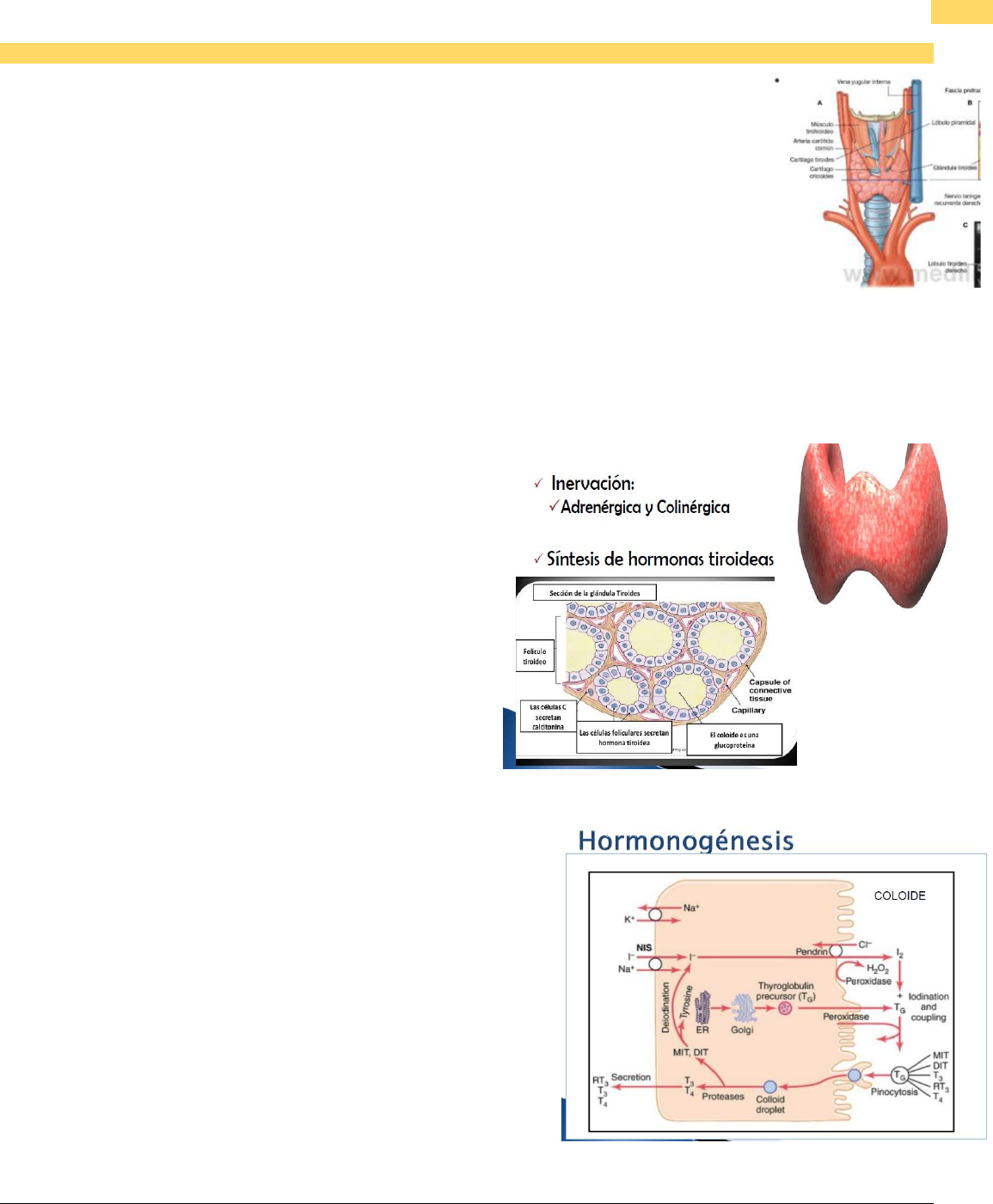 1 FISIOPATOLOGIA ENDOCRINA BR. ORIANA CASTILLO | BR. NESLY CARDOZO CLASE 2: GLANDULA TIROIDES La glándula tiroides es una de las más grandes del organismo, bilobulada con forma de mariposa. Ambos lóbulos están unidos por un istmo que cruza las superficies del 2do y 3er cartílago traqueales. Se encuentra ubicada en la parte superior del cuello por debajo de la laringe, por debajo y lateralmente al cartílago tiroides. Es irrigada por: la arteria tiroidea superior (rama de la carótida externa), la arteria tiroidea inferior (rama del tronco tirocervical que se origina de la arteria subclavia). Además es la encargada de secretar o sintetizar unas hormonas denominadas: T3 →7% (triyodotironina es la hormona activa), T4 →93% (tiroxina o pro-hormona) y la calcitonina. Recordemos que toda la T4 se convierte en T3 en los tejidos. Aunque la actividad hormonal es de 90% → T3 (es la más activa) y un 10% →T4. Los niveles adecuados de hormona tiroidea son necesarias para el crecimiento y moderación esqueléticos normales, en el adulto se requiere para la función normal de múltiples sistemas entre ellos cardiovascular y metabólicos Estructura Histológica De La Glándula Tiroides: está compuesta por acinos (folículos tiroideos) cerrados, encargados de la síntesis de las hormonas tiroideas. Estos acinos encierran un material proteico llamado coloide (su componente principal es tiroglobulina TGB) revestidos por células epiteliales cubicas. Y además presentan células C secretadoras de calcitonina. Las células foliculares en conclusión son las que secretan las hormonas tiroideas gracias al uso de Yodo y tiroglobulina, mediante los siguientes procesos: 1. Captación de yodo a través del NIS 2. Oxidación y organificación de yodo: Oxid. (TPO: perioxidasa tiroidea oxida para hacerla funcional). Org. (une el yodo a la T que contiene el aminoácido tirosina gracias al TPO. 3. Síntesis de TG (tiroglobulina) 4. Acoplamiento: la tirosina de la T se une al ion de yodo para formar el monoyodotirosina (MIT), si se une a 2 forma diyodotirosina. 5. Almacenamiento y secreción: la glándula tiroides es la única glándula endocrina capaz de almacenar grandes cantidades de hormona, es por ello que los folículos pueden tener suficiente para cubrir las necesidades normales del organismo durante 2 o 3 meses. Esa es la causa por la que los efectos fisiológicos de la deficiencia o cese tardan varios meses en aparecer. 6. La TG es captada a la luz del folículo, formándose vesículas exocìticas que van a volcar su contenido a la sangre. El transportador del yodo fuera de las células tiroideas al coloide por la membrana apical celular es la Pendrina (contratransportador de Yodo y Cl-). Aquí le prestamos especial atención a los transportadores como: el NIS y la PENDRINA a nivel del coloide. Atrapamiento del yodo: es el proceso que consiste en la concentración de yoduro en el interior de la célula tiroidea. El transportador que lo lleva a cabo es el Simportador de yoduro de sodio (NIS) mediante la captación de yodo Las hormonas tiroideas T3 y T4 (son lipófilas) ellas viajan a los tejidos unidas a proteínas plasmáticas sintetizadas en el hígado. En este caso la T3 y T4 están unidas a la Globulina Fijadora de Tiroxina (TBG), pero hay un % menor que se une a la Albumina y Prealbumina (transtiretina). Ellas se liberan lentamente a las de los tejidos. La tiroxina T4 tiene un tiempo de duración de 6 días, mientras que la Triyodotironina T3 → 1 día. Valores normales de T4: 8 pg/100 ml T3: 0 pg/100 ml REGULACION DE LAS HORMONAS TIROIDEAS Aquí hablamos un poco del eje Hipotálamo – Hipofisario. La regulación de este eje es del Hipotálamo que libera la TRH, va a llegar a la hipófisis para que esta produzca TSH (hormona estimuladora de tiroides) y de ahí a su órgano diana que es la glándula tiroides. 2 FISIOPATOLOGIA ENDOCRINA BR. ORIANA CASTILLO | BR. NESLY CARDOZO La TSH secretada por las células Tirotropas de la adenohipofisis desempeña un papel crucial en el control del eje tiroideo y es el marcador fisiológico más útil de la acción de las hormonas tiroideas. La TSH está compuesta por 2 subunidades: alfa y beta. La subunidad alfa es común a las demás hormonas glucoproteicas (folículo estimulante (FSH y LH), gonadotropina corionica) mientras que la subunidad beta de la TSH es especifica de esta hormona. El alcance y la naturaleza de la modificación de los hidratos de carbonos están regulado por la estimulación de la hormona Liberadora de Tirotropina. El eje tiroideo es un ejemplo clásico de un circuito de retroalimentación endocrina. La TRH hipotalámica estimula la producción hipofisaria de TSH, a su vez el estimula síntesis y secreción de Hormonas tiroideas, las H.T actúan por retroalimentación negativa inhibiendo la producción TRH y TSH. La TRH es el principal regulador positivo de la síntesis y secreción de TSH, La TRH actúan mediante un receptor acoplado a la proteína G. Acciones Fisiológicas De La Tiroides: Absorción de glucosa: por la rápida recaptación de CHO en las células lo que lleva a glicolisis o uso de la glucosa por parte de los tejidos. También aumenta el metabolismo basal ejerciendo efecto termogénico. En el metabolismo de los lípidos aumenta el catabolismo hepático de colesterol es por ellos que las concentraciones de colesterol aumentan en el hipotiroidismo y disminuyen en el hipertiroidismo. Cardiovascular: aumenta Frecuencia cardiaca, Gasto cardiaco, Presión Arterial, volumen sanguíneo (+ en piel como método para disipar el calor corporal del aumento del metabolismo) y vasodilatación. SNC: es importante para el crecimiento y desarrollo del cerebro en la vida fetal y primeros años de vida postnatal, pero no es imprescindible para la vida de un adulto. Además, tiene efectos neuromusculares las ligeras elevaciones de las hormonas en los músculos esqueléticos producen respuesta muscular más lenta. TRASTORNOS DE LA FUNCI