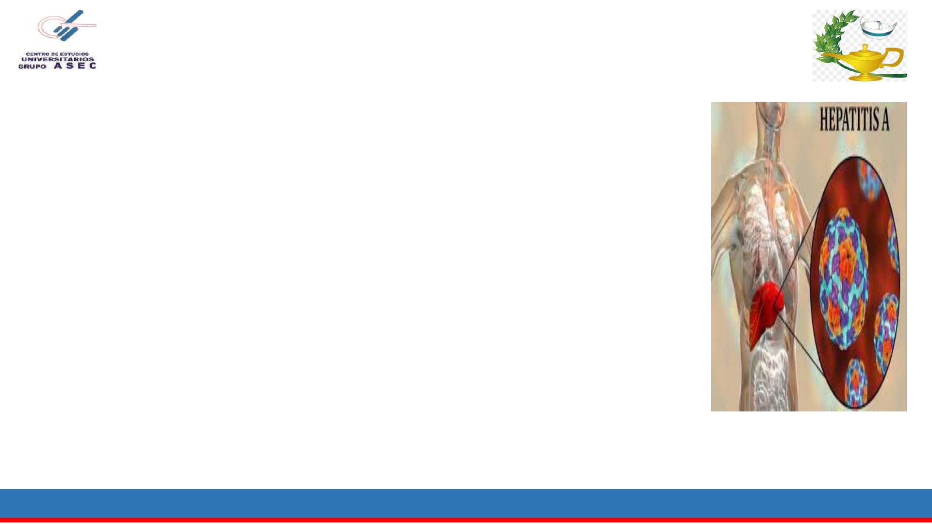 CENTRO DE ESTUDIOS UNIVERSITARIOS GRUPO ASEC LICENCIATURA EN ENFERMERIA TEMA: HEPATITIS A MATERIA: ANATOMIA ALUMNO: CARLOS SALMERON GUTIERREZ GRADO Y GRUPO: 2-A NOMBRE DEL DOCENTE: MÈDICO HÈCTOR MANUEL LARUMBE MARTINEZ FECHA DE PRESENTACIÓN DE EXPOSICIÓN: LUGAR DE PRESENTACIÓN DE EXPOSICIÓN: ACAPULCO, GRO CENTRO DE ESTUDIOS UNIVERSITARIOS GRUPO ASEC LICENCIATURA EN ENFERMERIA DEFINICIÓN Es una infección viral aguda del hígado , de origen viral ocasionado por un virus RNA altamente infeccioso CENTRO DE ESTUDIOS UNIVERSITARIOS GRUPO ASEC LICENCIATURA EN ENFERMERIA AGENTE El virus de la Hepatitis A es un miembro de la familia de Picornavirus CENTRO DE ESTUDIOS UNIVERSITARIOS GRUPO ASEC LICENCIATURA EN ENFERMERIA CENTRO DE ESTUDIOS UNIVERSITARIOS GRUPO ASEC LICENCIATURA EN ENFERMERIA EPIDEMIOLOGÍA A NIVEL MUNDIAL La seropositividad más alta (presencia de anticuerpos al virus de la hepatitis A) se encuentra en adultos de África urbana, Asia y Centro y Sudamérica normalmente por la adquisición de la enfermedad en la infancia. Los factores de esto son malas condiciones de higiene y sobre todo falta al acceso de agua potable CENTRO DE ESTUDIOS UNIVERSITARIOS GRUPO ASEC LICENCIATURA EN ENFERMERIA EPIDEMIOLOGÍA EN MÉXICO En nuestro país se ha reportado una prevalencia del 90% en reportes de hace 20 años. Un estudio reciente mostró el incremento de la edad ocurre el primer contacto con la enfermedad: de 1991 a 1993 la edad promedio de contacto era los 6. 4 años, mientras que de 2003 a 2005 está fue de 10.1 años. En paises industrializados su prevalencia global es de 5% CENTRO DE ESTUDIOS UNIVERSITARIOS GRUPO ASEC LICENCIATURA EN ENFERMERIA FACTORES DE RIESGO Personas que consumen agua o comida contaminada. Hombres que tienen actividad sexual con otros hombres. Personas que utilizan drogas ilegales intravenosas. Personas con trastornos de coagulación que requieren administración de factores de coagulación. Personas que se convierten en contactos cercanos de personas infectadas. CENTRO DE ESTUDIOS UNIVERSITARIOS GRUPO ASEC LICENCIATURA EN ENFERMERIA ETIOLOGÍA Se da a causa del Virus de la Hepatitis A, normalmente por la via Oral-Fecal CENTRO DE ESTUDIOS UNIVERSITARIOS GRUPO ASEC LICENCIATURA EN ENFERMERIA FISIOPATOLOGÍA Posterior a la ingesta, el virus sobrevive al ácido gástrico, atraviesa la mucosa intestinal, llega al hígado a través de la vena porta, donde es captado por los hepatocitos. Ahí, las partículas virales se replican, se ensamblan y se secretan en los canalículos biliares, desde donde pasan al conducto biliar CENTRO DE ESTUDIOS UNIVERSITARIOS GRUPO ASEC LICENCIATURA EN ENFERMERIA CAMBIOS ANATÓMICOS Los pacientes con hepatitis A presentan: Ictericia Hepatomegalia (87%) Esplenomegalia (9%) Exantema (2%) Edema (2%) Petequias (2%) Arritmias cardiacas (2%) CENTRO DE ESTUDIOS UNIVERSITARIOS GRUPO ASEC LICENCIATURA EN ENFERMERIA SIGNOS Y SÍNTOMAS Sintomatología inicial: Malestar general Náusea Vomito Anorexia Fiebre Dolor en el cuadrante Superior derecho del abdomen CENTRO DE ESTUDIOS UNIVERSITARIOS GRUPO ASEC LICENCIATURA EN ENFERMERIA EXAMENES DE LABORATORIO El IgM anti-VHA se utiliza para diagnosticar infección aguda, reciente o subclínica de hepatitis A Es detectable a partir de los 15 días previos a la aparición de los síntomas, y persiste hasta 6 meses posterior a la infección En pacientes sintomáticos, los hallazgos notables incluyen la elevación significativa de bilirrubina total, directa y aminotransferasas séricas CENTRO DE ESTUDIOS UNIVERSITARIOS GRUPO ASEC LICENCIATURA EN ENFERMERIA Se han reportado IgM anti-VHA falsos positivos en personas sin historia reciente de hepatitis aguda. Se debe investigar el IgM para confirmar el diagnóstico de hepatitis A Se recomienda considerar como NO diagnóstico el hallazgo de IgM anti-VHA positivo en pacientes SIN evidencia clínica o de laboratorio de hepatitis aguda. CENTRO DE ESTUDIOS UNIVERSITARIOS GRUPO ASEC LICENCIATURA EN ENFERMERIA la hepatitis puede verse complicada por nausea y vomito persistente, deshidratación, fiebre alta, asi como alteraciones en el estado de conciencia y falla hepática . COMPLICACIONES CENTRO DE ESTUDIOS UNIVERSITARIOS GRUPO ASEC LICENCIATURA EN ENFERMERIA TRATAMIENTO Tanto la inmunoglobulina G como la vacuna contra VHA han demostrado eficacia para la prevención post-exposición de infección por VHA siempre y cuando se apliquen dentro de las dos primeras semanas posteriores al inicio de los síntomas o del contacto con el caso indice. CENTRO DE ESTUDIOS UNIVERSITARIOS GRUPO ASEC LICENCIATURA EN ENFERMERIA Al compararlas se observa que la inmunoglobulina es un poco mas efectiva que la vacuna (96.7 vs 95.6) Su uso dependera de la disponibilidad, la presencia de hepatopatía cronica y la edad del paciente CENTRO DE ESTUDIOS UNIVERSITARIOS GRUPO ASEC LICENCIATURA EN ENFERMERIA PREVENCIÓN No tener contacto estrecho o sexual con una persona infectada No tocar objetos contamiados Lavar frutas y verduras Lavarse las manos antes de comer Lavarse las manos despues de ir al baño No comer alimentos crudos Vacuna contra la Hepatitis A Inmonunoglobulina CENTRO DE ESTUDIOS UNIVERSITARIOS GRUPO ASEC LICENCIATURA EN ENFERMERIA La tasa de morbilidad varia entre 0.01% y 2% CENTRO DE ESTUDIOS UNIVERSITARIOS GRUPO ASEC LICENCIATURA EN ENFERMERIA BIBLIOGRAFÍA