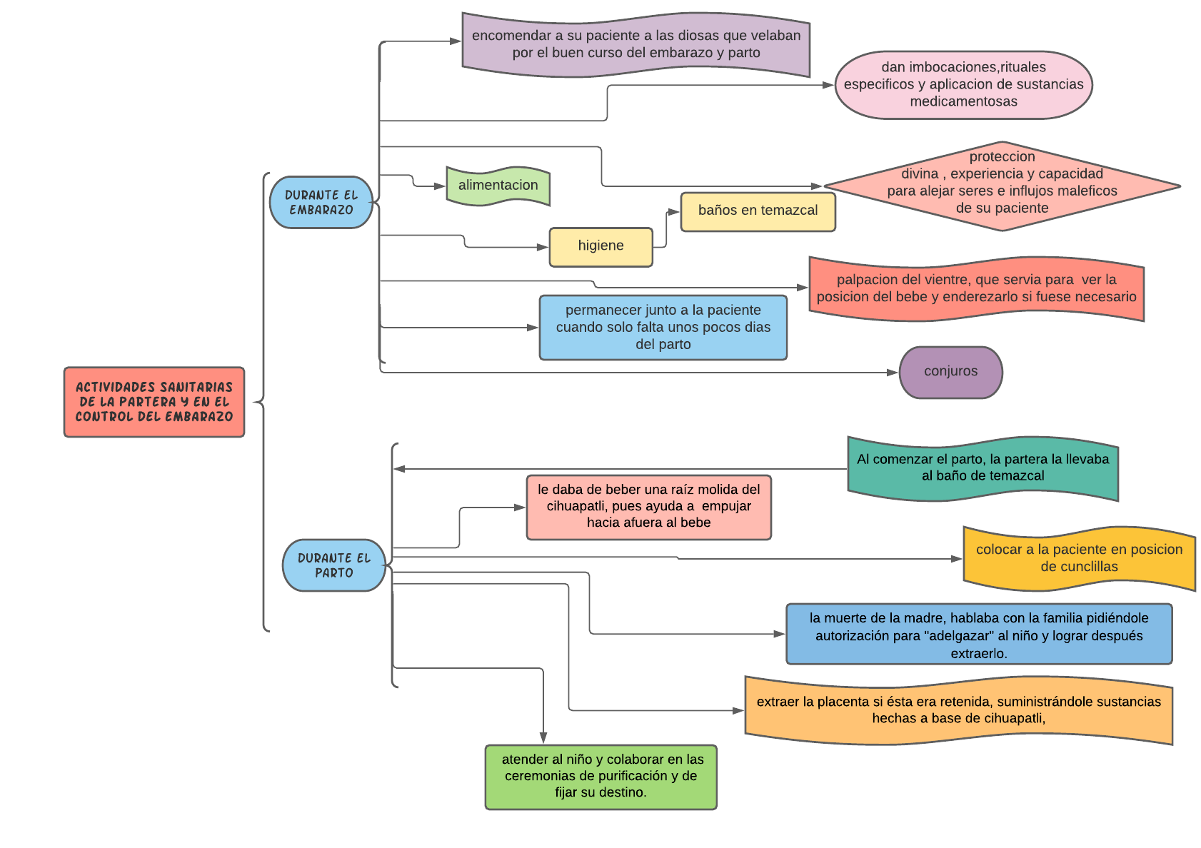 act ividades sanit ar ias de l a par t er a y en el cont r ol del embar azo dur ant e el embar azo dur ant e el par t o encomendar a su paciente a las diosas que velaban por el buen curso del embarazo y parto proteccion divina , experiencia y capacidad para alejar seres e influjos maleficos de su paciente alimentacion higiene baños en temazcal palpacion del vientre, que servia para ver la posicion del bebe y enderezarlo si fuese necesario permanecer junto a la paciente cuando solo falta unos pocos dias del parto Al comenzar el parto, la partera la llevaba al baño de temazcal le daba de beber una raíz molida del cihuapatli, pues ayuda a empujar hacia afuera al bebe colocar a la paciente en posicion de cunclillas conjuros la muerte de la madre, hablaba con la familia pidiéndole autorización para "adelgazar" al niño y lograr después extraerlo. extraer la placenta si ésta era retenida, suministrándole sustancias hechas a base de cihuapatli, atender al niño y colaborar en las ceremonias de purificación y de fijar su destino. dan imbocaciones,rituales especificos y aplicacion de sustancias medicamentosas