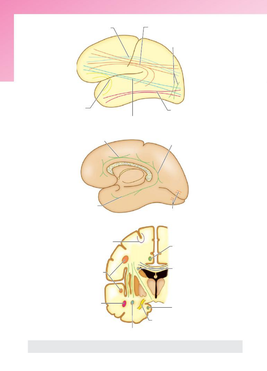 Anatomía clínica268 Fascículo occipitofrontal superior Fascículo longitudinal superior Fascículos occipitales verticales Fascículo longitudinal inferior Fascículo occipitofrontal inferior Fascículo uncinado Cíngulo Cíngulo Cíngulo Fascículos occipitales transversos Fibras arqueadas del cerebro Fascículo longitudinal superior Fascículo longitudinal inferior Fascículo occipitofrontal inferior Cíngulo Fascículo uncinado Fascículo occipitofrontal superior Cíngulo Fig. 3-88. A.Esquemas de la ubicación de los fascículos de asociación del telencéfalo. Vista lateral del hemisferio cerebral izquierdo. Vista medial del hemisferio cerebral derecho. Corte coronal del hemisferio cerebral derecho, vista anterior.B. C. A B C