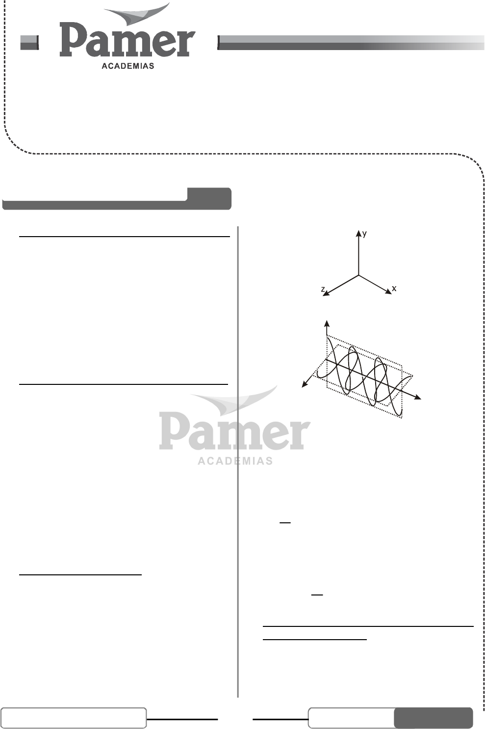 102UNI SEMESTRAL 2013 - III FÍSICA TEMA 32 ONDAS ELECTROMAGNÉTICAS FÍSICA I. VARIACIÓN DEL CAMPO MAGNÉTICO La ley de Faraday dice que la variación de un campo magnético induce una corriente eléctrica. pero una corriente eléctrica es un flujo de cargas eléctricas producido solamente por un campo eléctrico. Por tanto, la ley de Faraday se puede expresar como: Una variación del campo magnético produce un campo eléctrico. Este campo eléctrico se produce aunque no haya conductor ni materia, puede ser en el vacío; se produce en la región en donde ocurre la variación del campo magnético. II. VARIACIÓN DEL CAMPO ELÉCTRICO La simetría de la naturaleza es notable en muchos fenómenos; Maxwell lanzó la idea de que también la ley inversa podría existir; osea: Una variación del campo eléctrico produce un campo magnético. Esta segunda ley de inducción no es una sorpresa para nosotros y puede mostrarse de la siguiente manera. Se sabe que una carga produce un campo eléctrico a su alrededor, por ejemplo en un punto P. Si la carga está en movimiento, el campo eléctrico en P es variable y además la carga produce un campo magnetico en P. Se puede interpretar este hecho diciendo qué cargas en movimiento, corrientes o variaciones del campo eléctrico producen un campo magnético. III. TEORÍA DE MAXWELL El gran triunfo de Maxwell es haber puesto estas leyes en ecuaciones y unificar completamente la electricidad y el magnetismo. Una de las consecuencias fundamentales de la teoría es deducir que si las cargas son aceleradas se producen campos eléctricos y magnéticos variables que se propagan en el espacio a la velocidad de la luz. Este campo electromagnético variable conjunto de los dos campos se denomina por analogía con las ondas luminosas, ondas electromagnéticas. (Onda electromagnética) E B xz y La solución de onda plana, es una onda sinusoidal, para la cual las amplitudes de campo E y B varía con "x" y "t" (tiempo) de acuerdo con las expresiones E = EoCos(kx – wt) B = BoCos(kx – wt) donde: o oE yB son los valores máximos de los campos 2k = donde es la longitud de onda • w=2 f donde f es el número de ciclos por segundo. • El ángulo (kx – wt) se conoce con el nombre de fase. Se cumple: o o o o E C E C.B B = = IV. PROPIEDADES DE LAS ONDAS ELEC- TROMAGNÉTICAS Un estudio experimental permite mostrar que las ondas electromagnéticas son idénticas a las ondas luminosas: 1 . Se propagan en el vacío con la velocidad de la luz y dentro de un medio su velocidad es igual a la de la luz en ese medio. DESARROLLO DEL TEMA 103UNI SEMESTRAL 2013 - III FÍSICA TEMA 32 ONDAS ELECTROMAGNÉTICAS 2. Se reflejan y refractan con las mismas leyes de la luz. La reflexión de las ondas electromagnéticas se utiliza en el radar para dirigir y recibir haces de ondas por medio de espejos parabólicos. 3 . Interfieren y se difractan exactamente como la luz. 4 . Pueden producir ondas estacionarias. Si a cierta distancia de la fuente se pone una pantalla metálica, las ondas incidentes y reflejadas se suman y producen nodos y vientres de E y de B. Hertz en 1888 comprobó experimentalmente todas estas propiedades con gran exactitud. Los campos eléctricos y magnéticos se pueden evidenciar por sus efectos. V. VELOCIDAD DE LA ONDA ELECTRO- MAGNÉTICA El producto de la frecuencia de una onda por su longitud de onda es la velocidad de la onda electromagnética (VOEM) OEMV f T = = En general la velocidad de las ondas electromagnéticas dependen del medio en el cual se propagan. Naturalmente en el vacío toma su máximo valor J.C. Maxwell demostró que las ondas electromagnéticas en el vacío se propagana con la velocidad de la luz (C). 8 CEM o o 1V C 3 10 m / s = = = 7 o 4 10 wb / A –= Permeabilidad magnética en el vacío 12 2 2 o 8,85 10 C / Nm –= Permeabilidad eléctrica en el vacío VI. ESPECTRO ELECTROMAGNÉTICO Las ondas electromagnéticas cubren un rango de frecuencia o de longitudes de onda muy grande. Usualmente se les clasifica de acuerdo con la naturaleza de la fuente que los productos y de su efecto más importante al interaccionar con la materia. Esta clasificación no tiene límites bien definidos. Denominación Radio frecuencia Microondas Infrarrojos Luz visible Ultravioleta Rayos X Rayos Origen o fuentes Circuitos oscilantes Dispositivos electrónicos Átomos excitados térmicamente Exitaciones electrónicas Átomos y moléculas excitados Exitación de electrones internos o desaceleración brusca de electrones Sustancias radiactivas y reactores nucleares Rango de longitudes de ondas ........... - ........... - ........... - ........... - ........... - ........... - ........... - 30 cm 1 mm 7 800 A 4 000 A 6 A 0,06 A 10 A–1 30 cm 1 mm 7 800 A 4 000 A 10 A 1 A 10 km ........... ........... ........... ........... ........... ........... ........... Para interpretar ciertos fenómenos de óptica, es necesario tener en cuenta la naturaleza ondulatoria de la luz 104UNI SEMESTRAL 2013 - III FÍSICA ONDAS ELECTROMAGNÉTICAS TEMA 32 Exigimos más! VII.DIFRACCIÓN Nos muestra que la luz se "curva" alrededor de los objetos. Si hacemos llegar un frente de ondas (por ejemplo ondas de agua) sobre una rendija, el resultado varía según el tamaño de la rendija. Sólo si la longitud de onda es mayor que el tamaño de la rendija se observa que el orificio se convierte en foco emisor de ondas dando lugar al fenómeno de la difracción. VIII.INTERFERENCIA La palabra interferencia se refiere a los efectos físicos que resultan al superponer dos o más trenes de onda. Para que se dé una interferencia que no varíe con el tiempo (estacionaría) se requieren las siguientes con- diciones: (1) Las ondas deben ser de la misma naturaleza. (2) Las ondas deben poseer la misma frecuencia (velocidad). Consideremos que las ondas provienen de 2 focos puntuales distintos y que cada una recorre distancias diferentes. Supongamos que los focos producen los máximos y mínimos de las ondas al mism